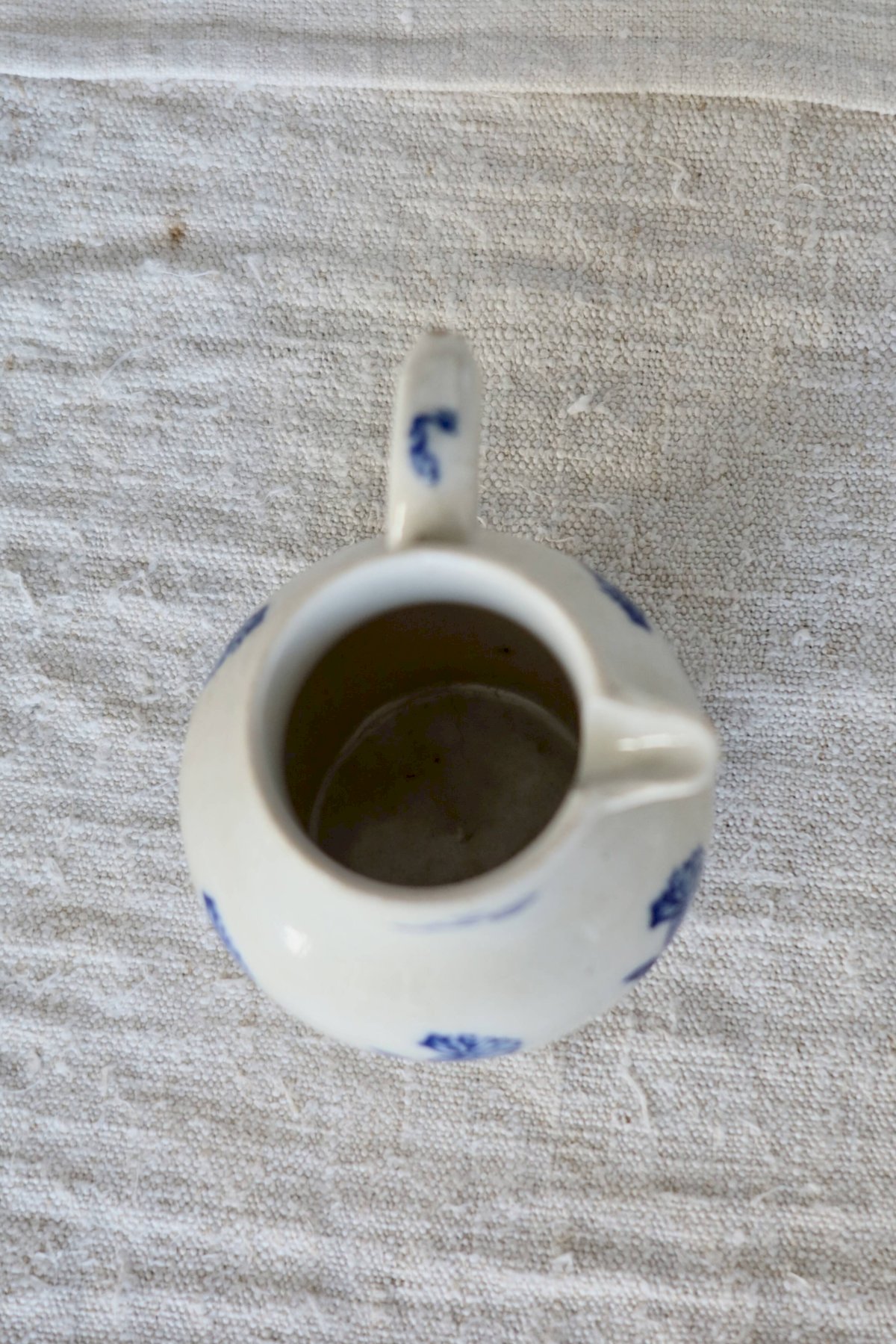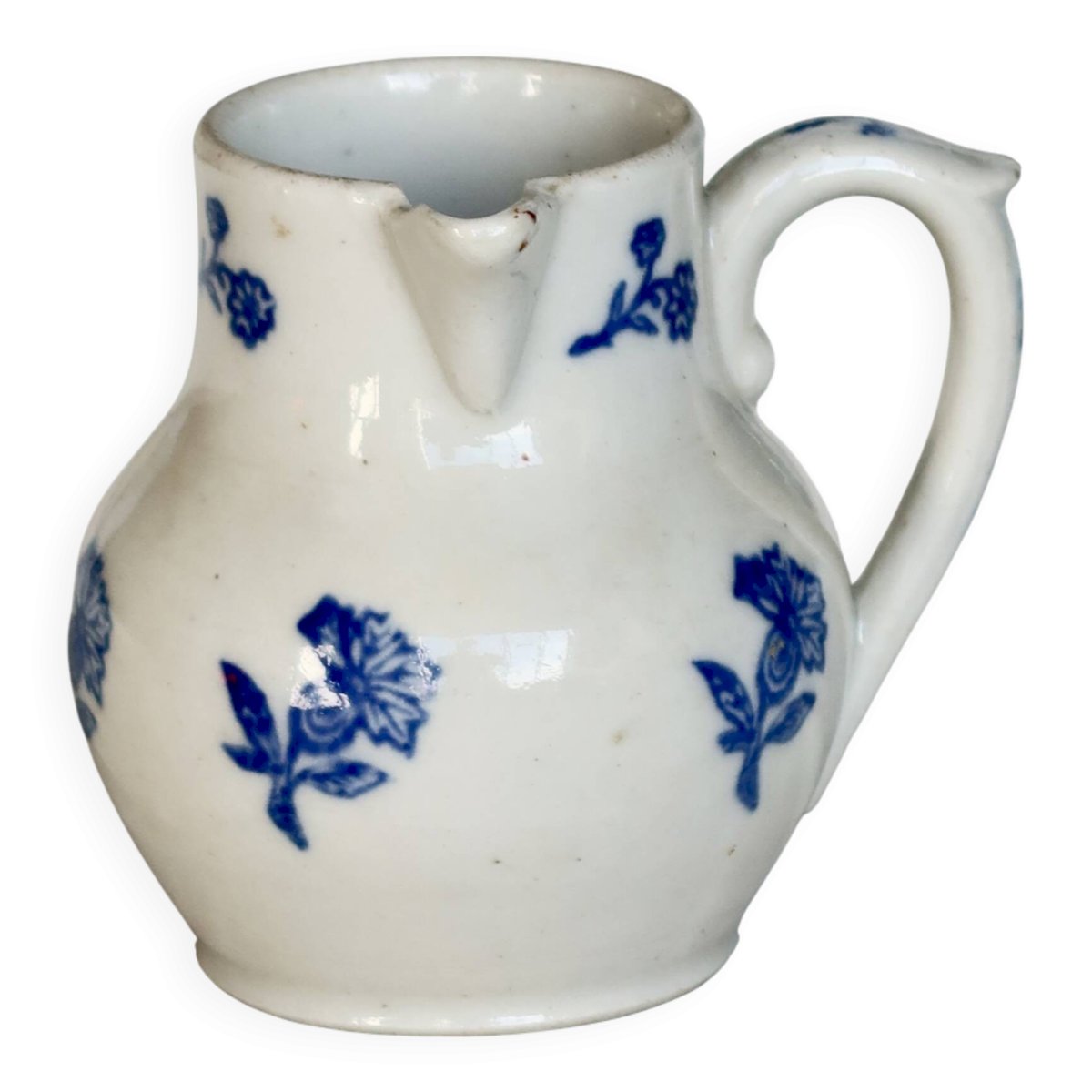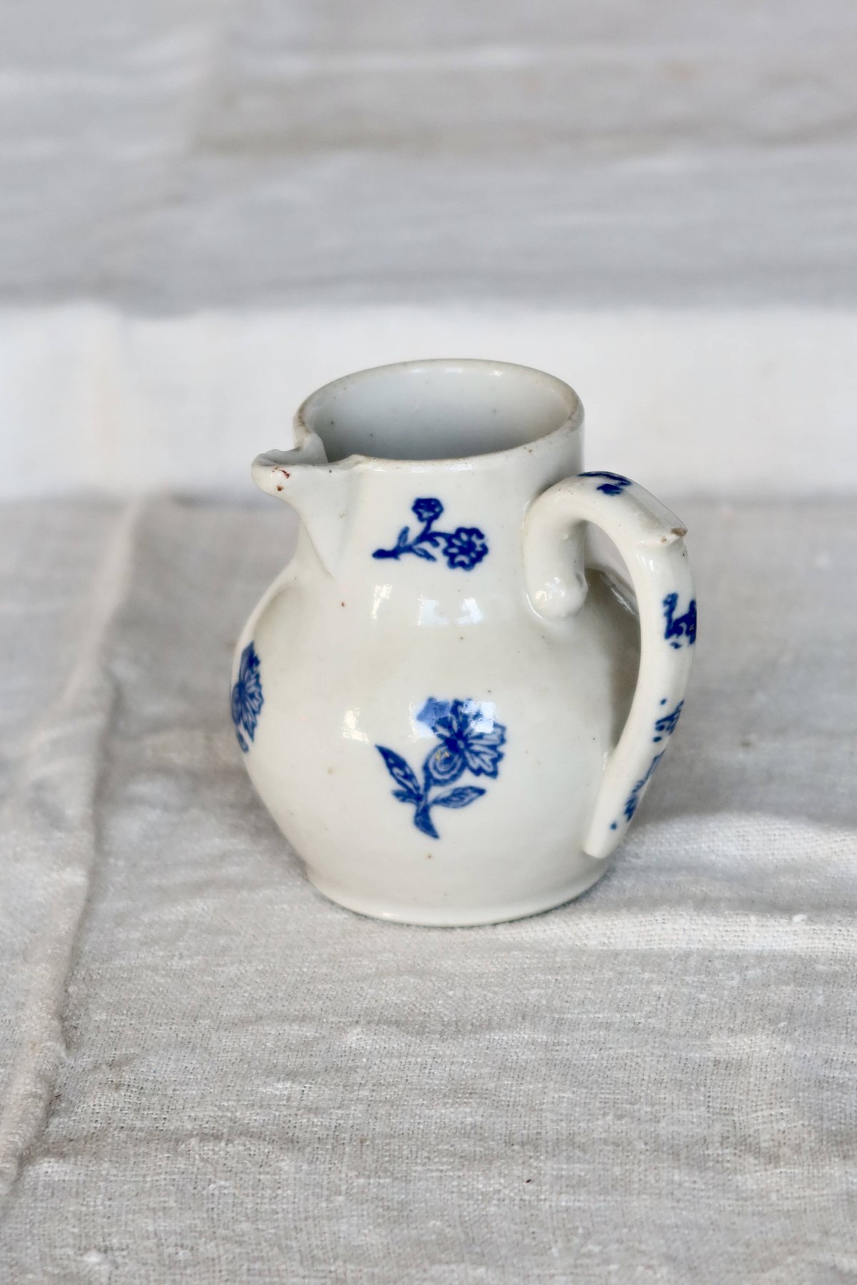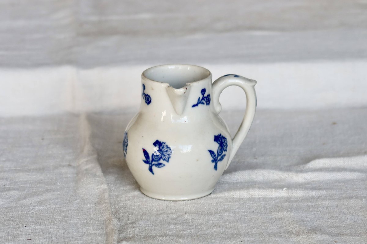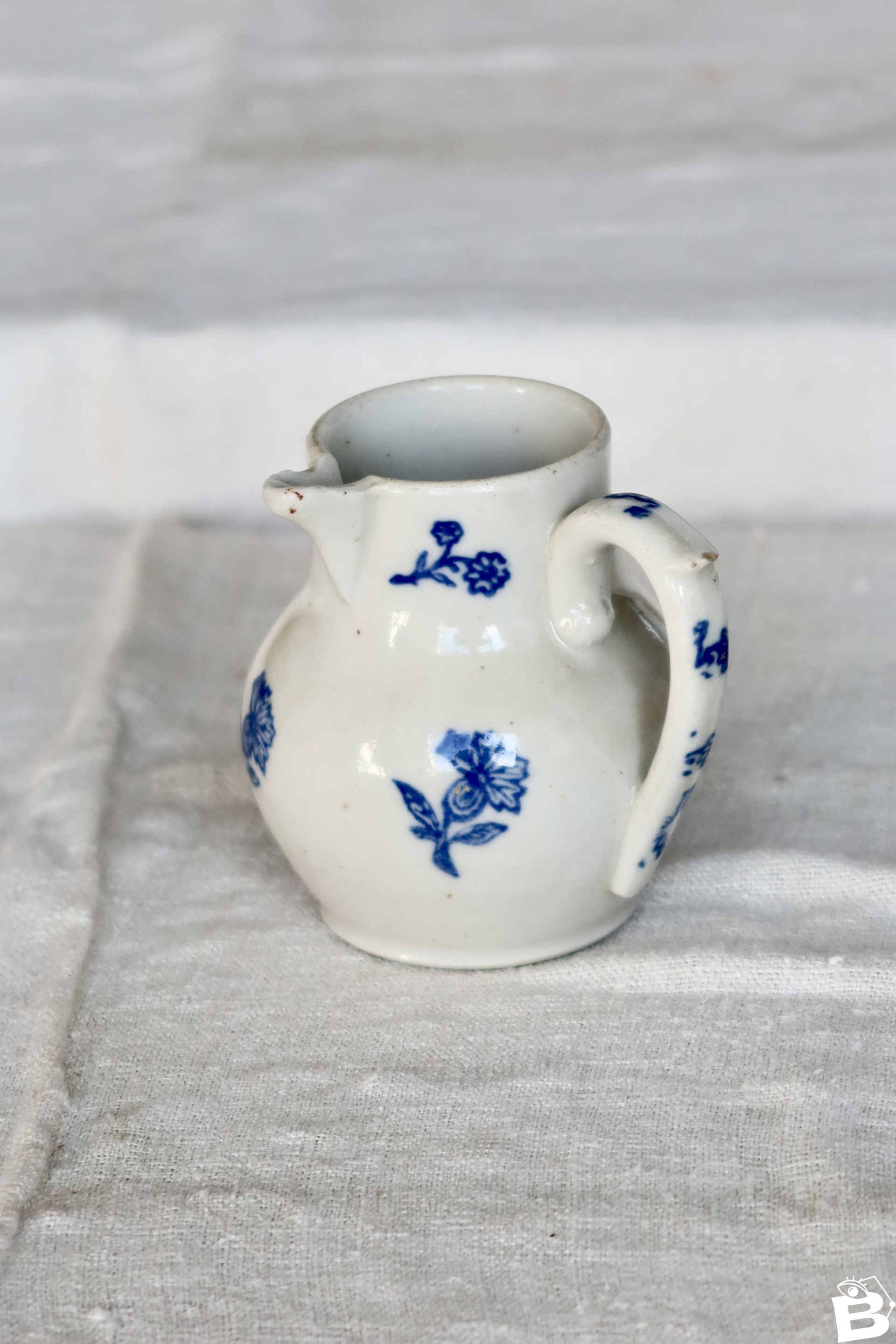 This small pitcher from Saint-Uze, decorated with blue flowers, retains all its poetry despite the marks of time. White steel-like earthenware with cobalt blue floral decoration, generous handle, and short spout.