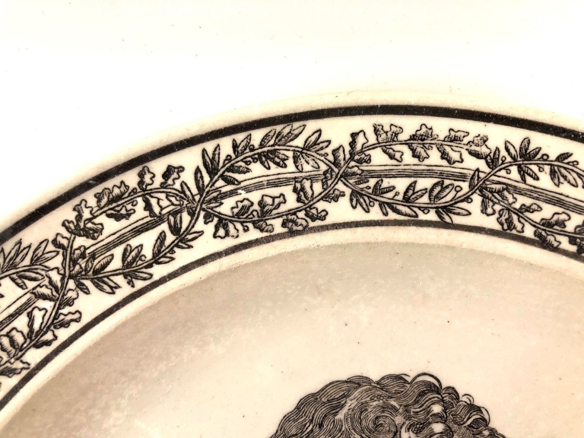 Charming antique plate in fine earthenware from Creil Montereau, decorated with a royal portrait of Mademoiselle d'Artois. The black decoration on a white background represents Louise-Marie-Thérèse d'Artois (1819-1864), granddaughter of King Charles X and sister of the Count of Chambord. The rim is adorned with a frieze of laurel palmettes, emblematic of 19th-century royal classicism. This plate is part of the historical series produced in Creil and Choisy-le-Roi around 1850-1870, illustrating the emblematic figures of the French monarchy. An object of history and collection, with delicate graphics and a charm of yesteryears. Details: Manufacturer: Creil Montereau / Choisy-le-Roi Period: second half of the 19th century Subject: H.R.H. Mademoiselle d'Artois Decoration: black print, laurel frieze Diameter: 21.5 cm Condition: wear and a small chip on the edge (see photos), patina of time consistent with the age antique plate, Creil Montereau, Choisy, 19th-century earthenware, royal portrait, Mademoiselle d'Artois, Count of Chambord, Charles X, historical plate, earthenware collection, royal art Country of origin: France