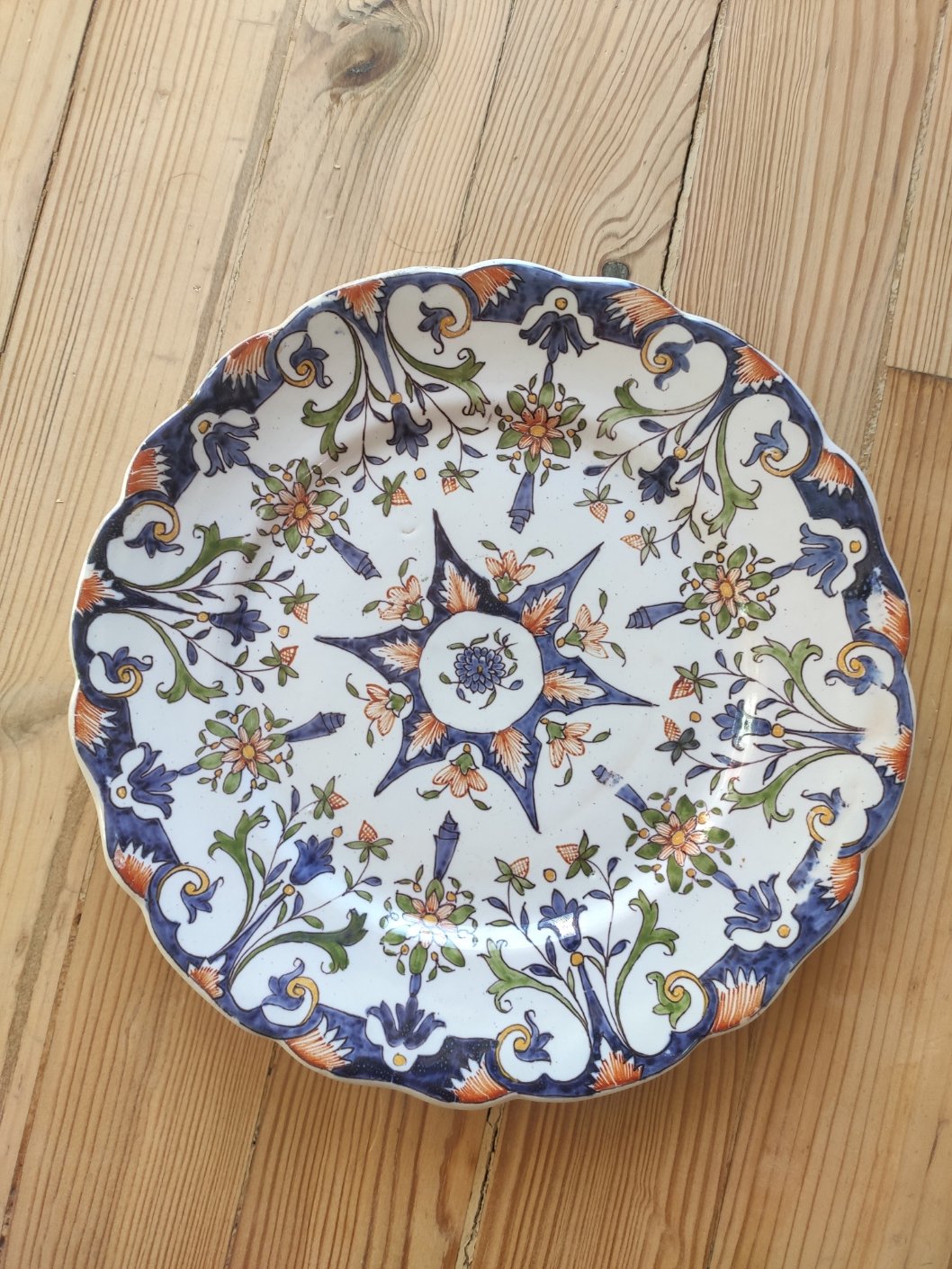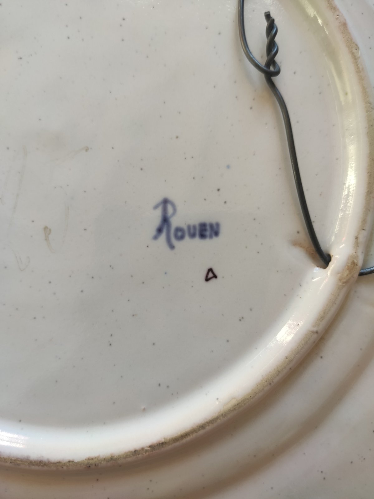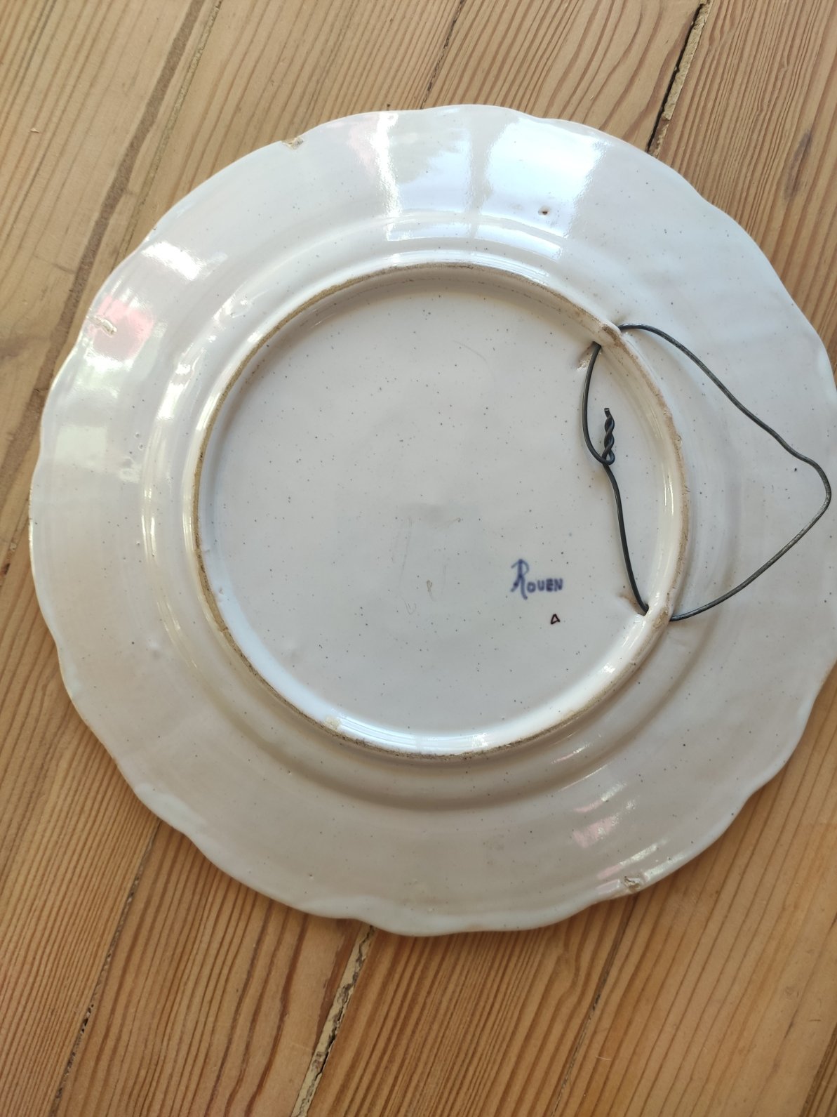 Beautiful collector's plate made of earthenware in the Rouen style, hand-decorated. Classic "radiating" decoration with a starry central motif and floral scrolls in blue, ochre, and green. Marked "Rouen" with workshop signature on the back. Beautiful quality reissue from the 19th or early 20th century. Perfect for wall decoration or a rustic/chic country kitchen. Carefully packaged for shipping.