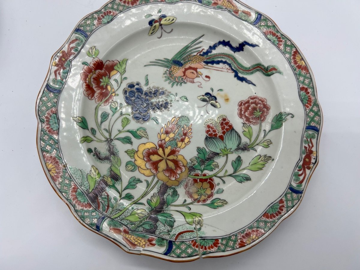 Elegant antique plate made of fine porcelain, richly hand-decorated in the Oriental taste of the Famille Verte, inspired by Chinese porcelain from the Kangxi period (1662–1722). Its vibrant decoration features a phoenix in mid-flight surrounded by peony flowers, chrysanthemums, butterflies, and symbols of longevity, while the border alternates stylized fish and crustaceans on a red and green geometric background. A true tribute to nature and the mythical beauty of the East. The reverse bears a hand-painted red marking, typical of productions from the Samson factory in Paris (circa 1860–1890), renowned for its refined interpretations of Far Eastern porcelain. ? Characteristics Manufacturer: Samson, Paris (attributed) Period: Late 19th century Style: Famille Verte – Kangxi inspiration Decoration: Phoenix, flowers, and symbolic animals Diameter: 22.5 cm (≈ 8.85 inches) Condition: fine visible restorations and stabilized crack (see photos). Very beautiful overall presentation.