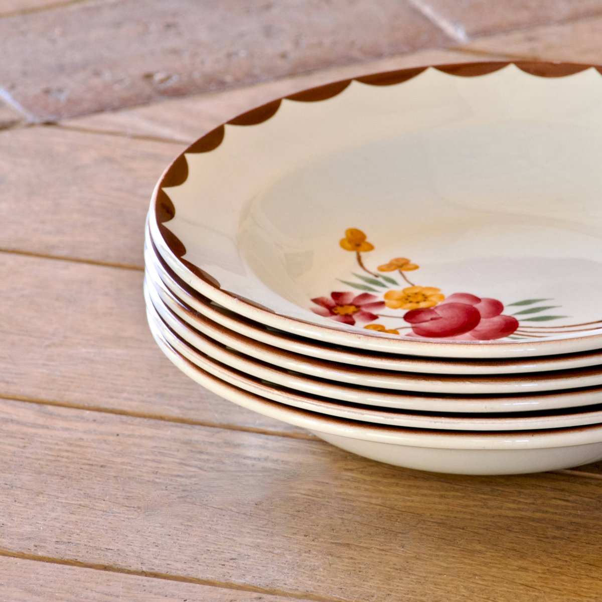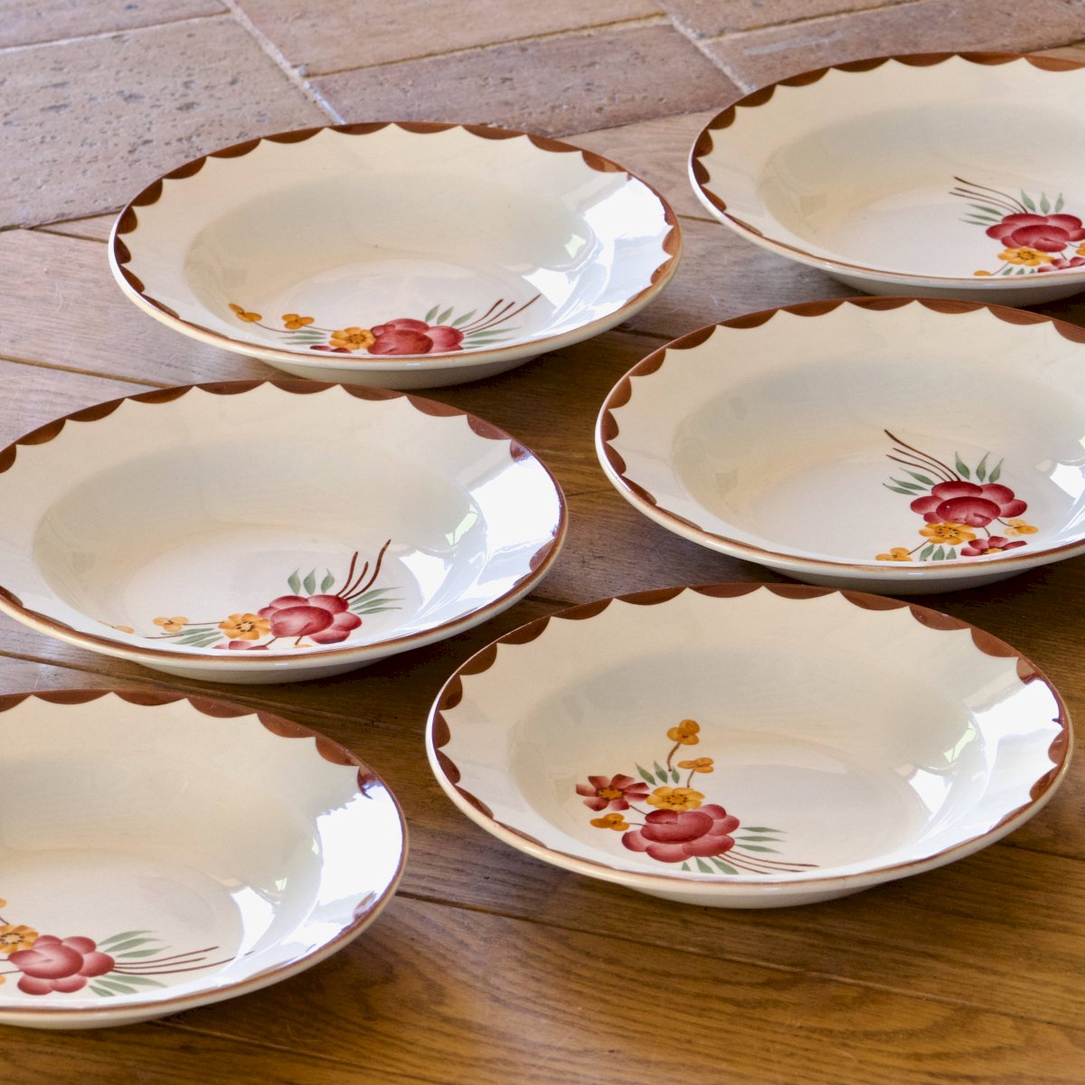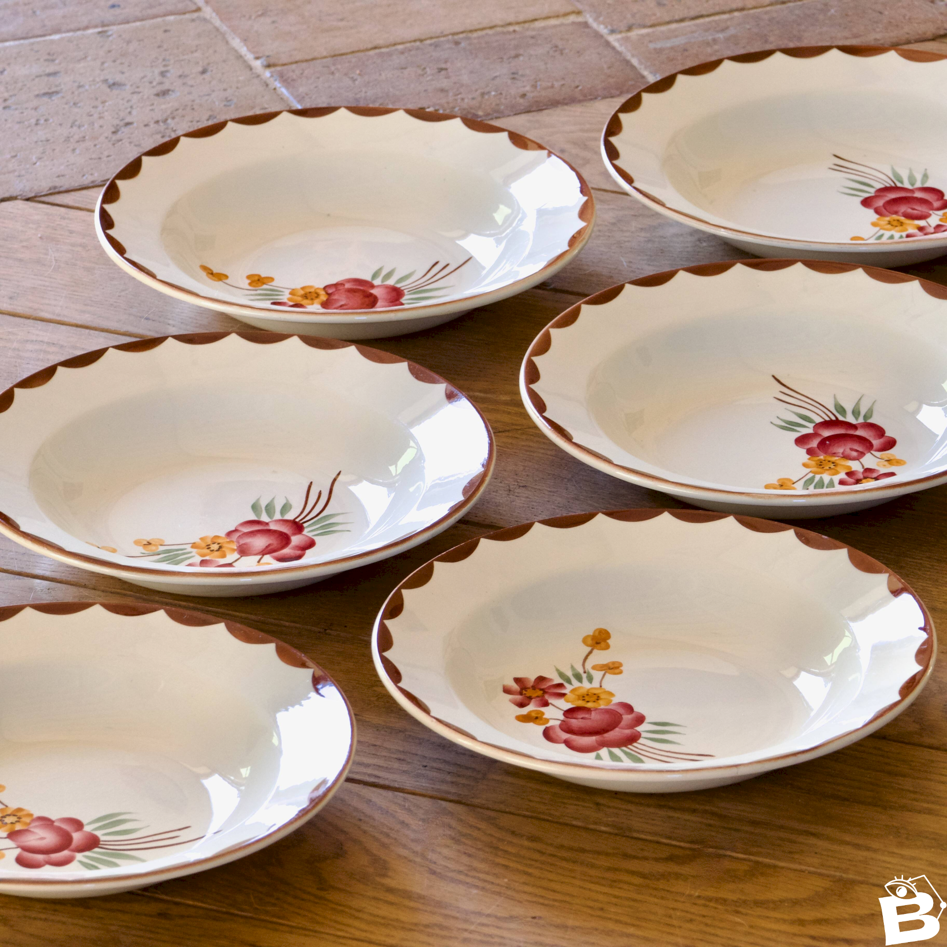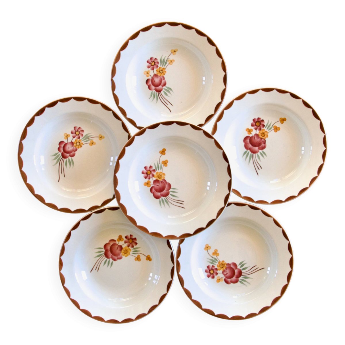 Set of 6 antique opaque porcelain plates, circa 1920, from the Choisy-le-Roi HBCM (Hippolyte-Boulenger-Creil-Montereau) pottery, collection "Huguette." Beautifully hand-painted decoration, flowers in shades of old pink and yellow. The edge of the rim is also hand-painted in a scalloped chocolate/wine color. In very good condition, no chips, no cracks, beautiful shine. ? 23 cm. ✨ Very careful shipping. ✨ We have other listings online, feel free to take a look! 2.6 kg. L: 23 W: 23 H: 23