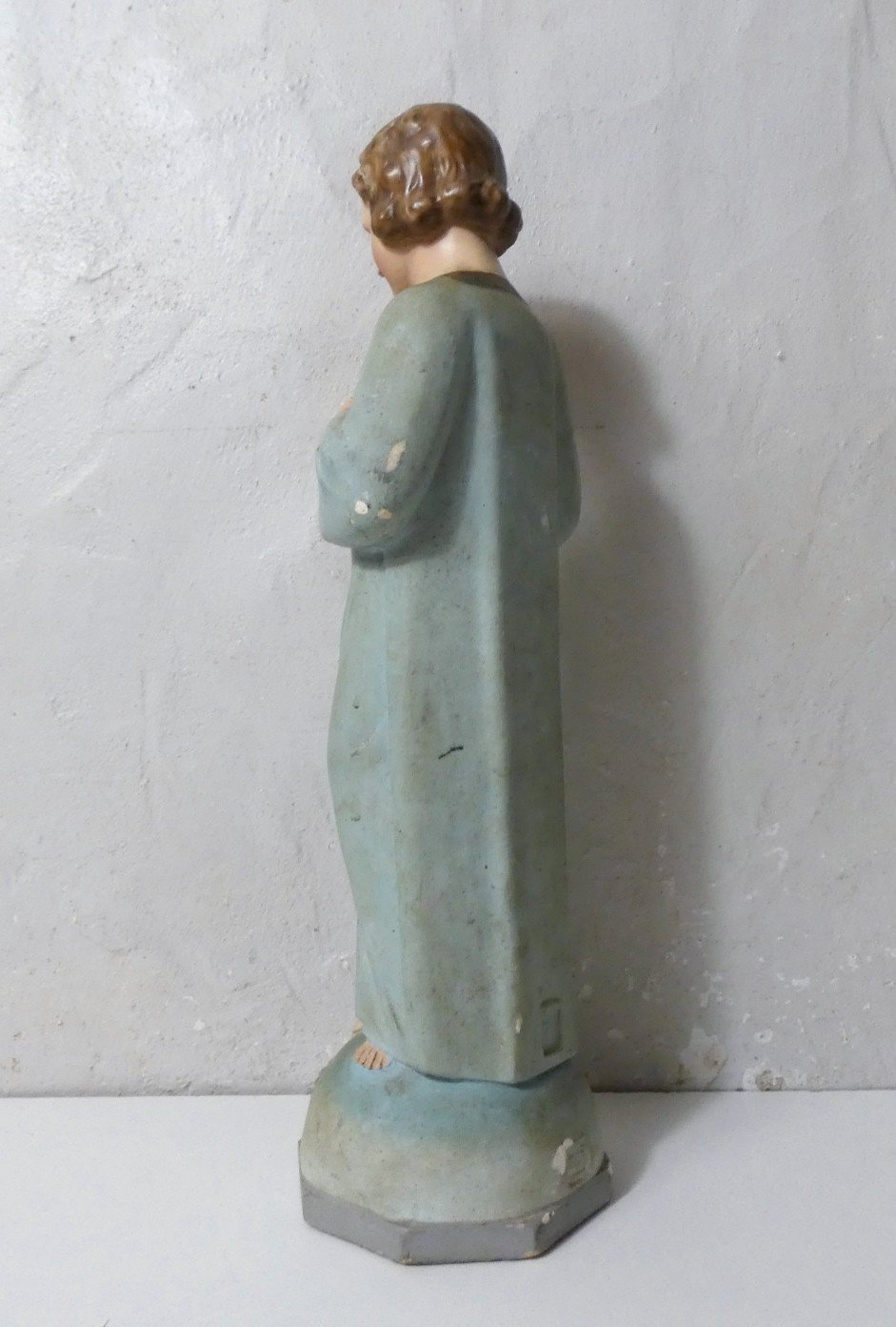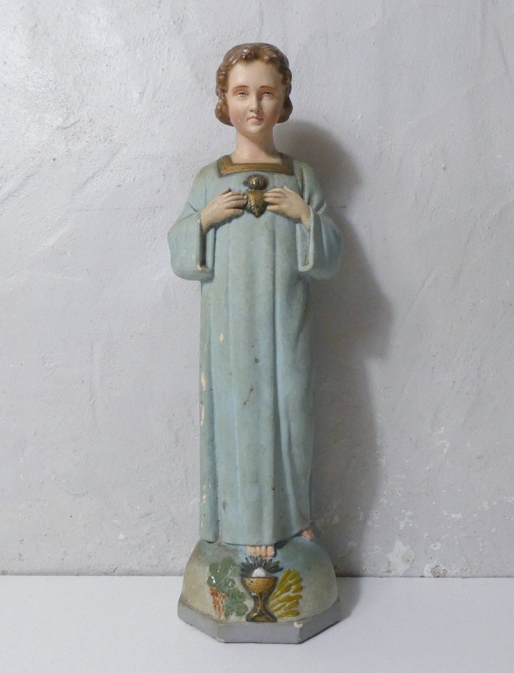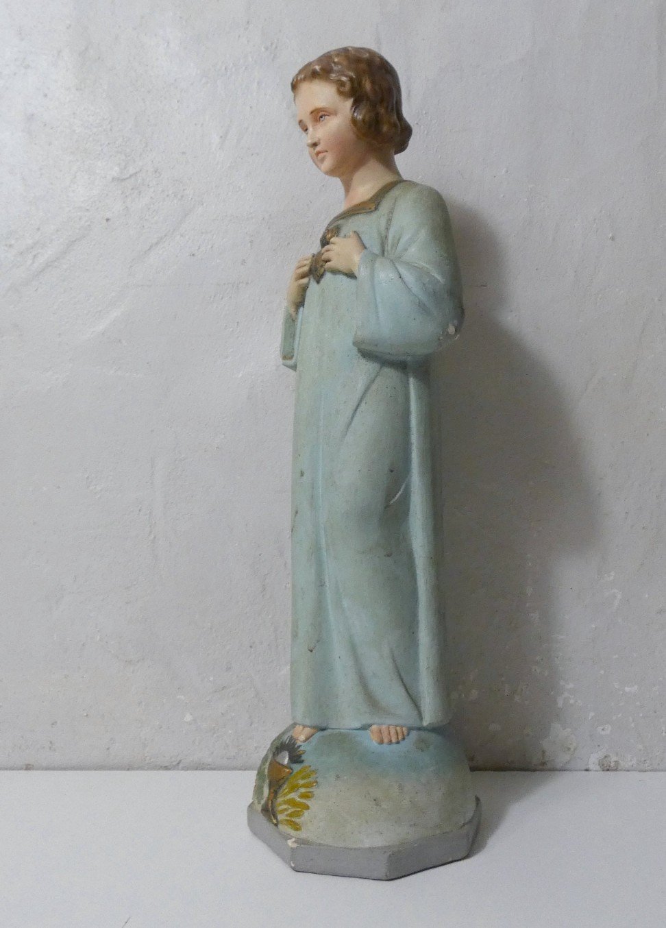 Stunning antique statue of the Sacred Heart Jesus Child. Uncommon representation of Jesus as a young boy. Height: 44 cm. Width: 12.5 cm. Depth: 11.5 cm. Very good overall condition with some glaze chips, superb patina, the colors are incredible, the blue is magnificent. The facial features are very delicate, the gaze is captivating. Signed/stamped on the back (see photo). Type: Statue, Sculpture Country of origin: France Material: Plaster Style: 1940-1960 Dimension (cm): From 31 to 50 Theme: Character
