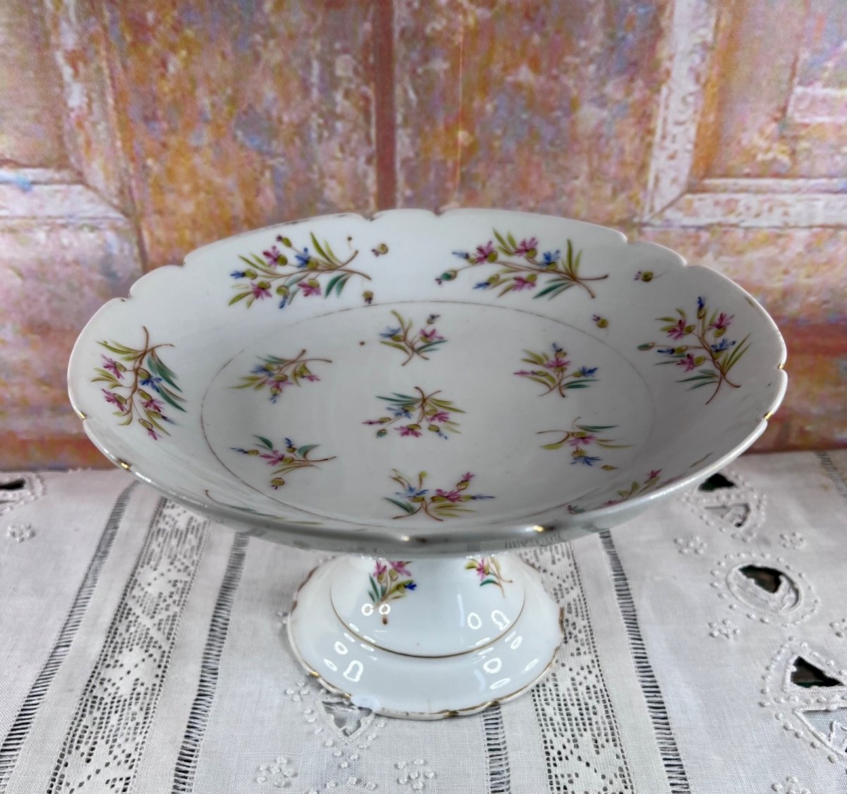 Ancient footed bowl in French porcelain, decorated with fine polychrome floral garlands and enhanced with golden threads. This bowl is marked under the base “Rouenart des Invalides – À la Ville de Sèvres – Nice,” corresponding to a Parisian house specialized in fine porcelain at the end of the 19th century. Elegant and bright, it fits perfectly as a centerpiece, fruit bowl, candy dish, or decorative element in a showcase. Condition: Antique condition with visible chipping of the glaze on the foot (see photos). Well-preserved floral decoration, beautiful overall patina. Dimensions: Diameter: 21 cm Height: 13 cm antique porcelain bowl, French porcelain, Rouenart, at the city of Sèvres, footed bowl, antique centerpiece, French table art, 19th-century porcelain. Careful and well-protected shipping. Contractual photos; please feel free to ask your questions before purchasing. Country of origin: France.