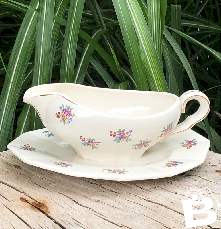 - Skinny fat sauce boat in Berry M&S porcelain (Massé Surget) flower bouquet pattern