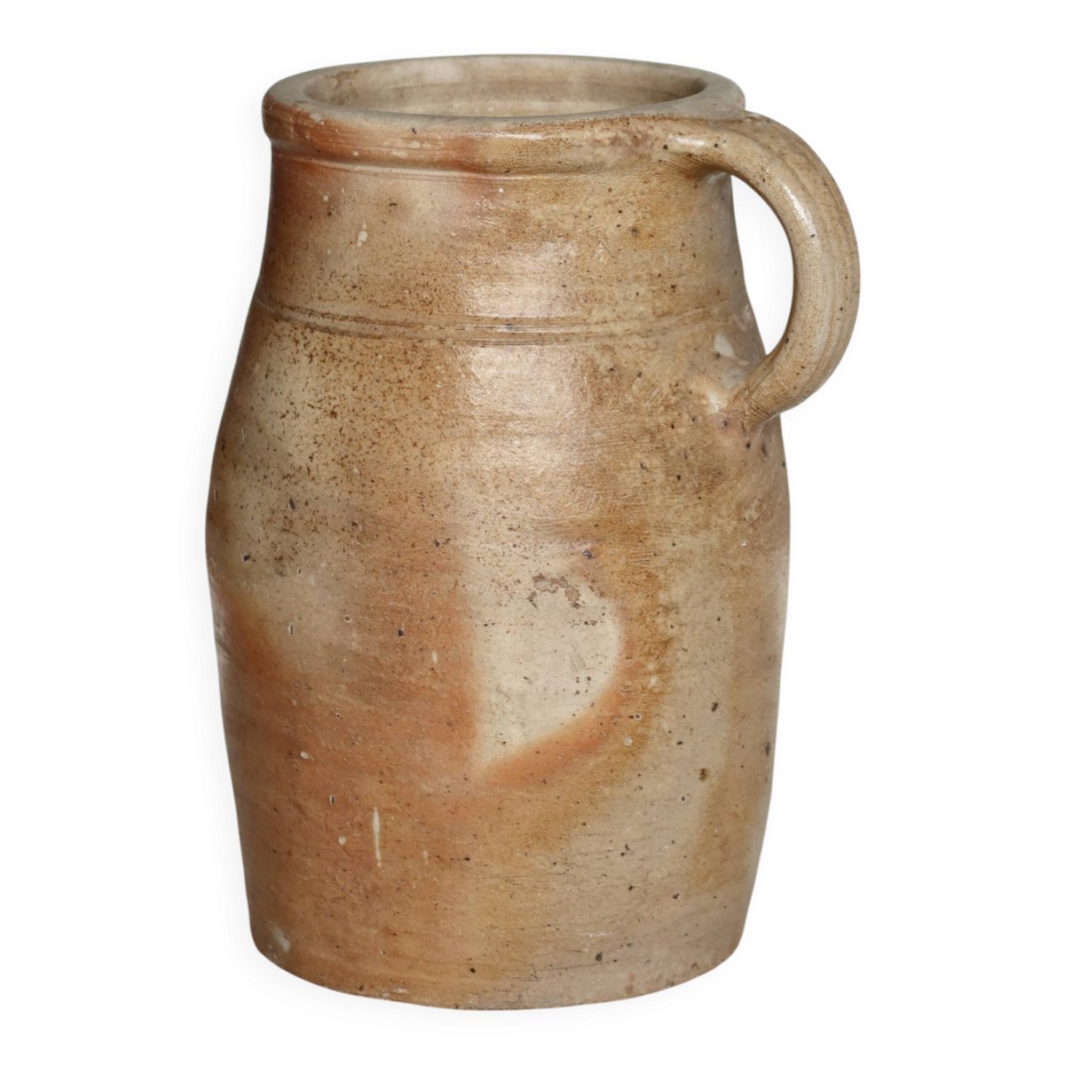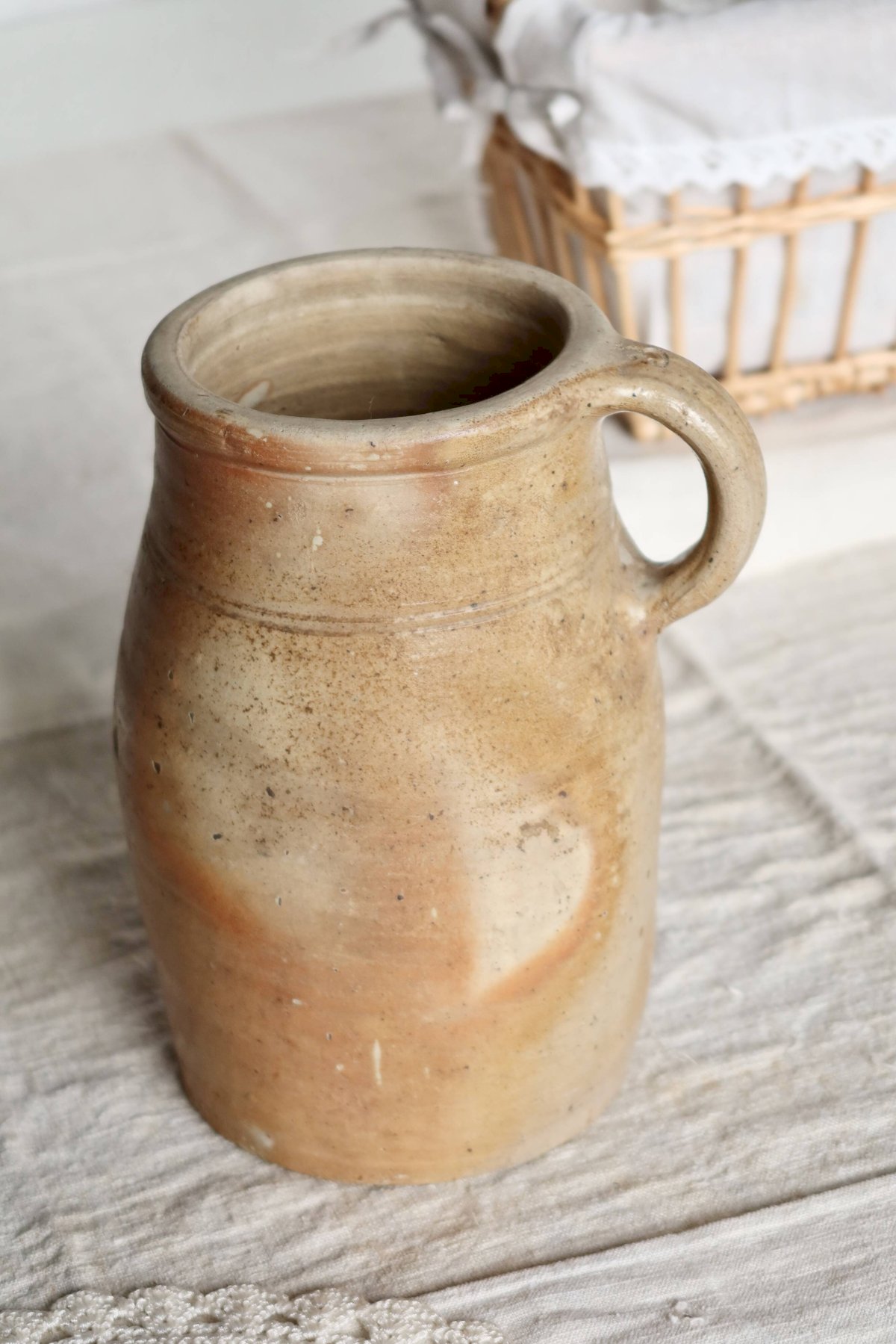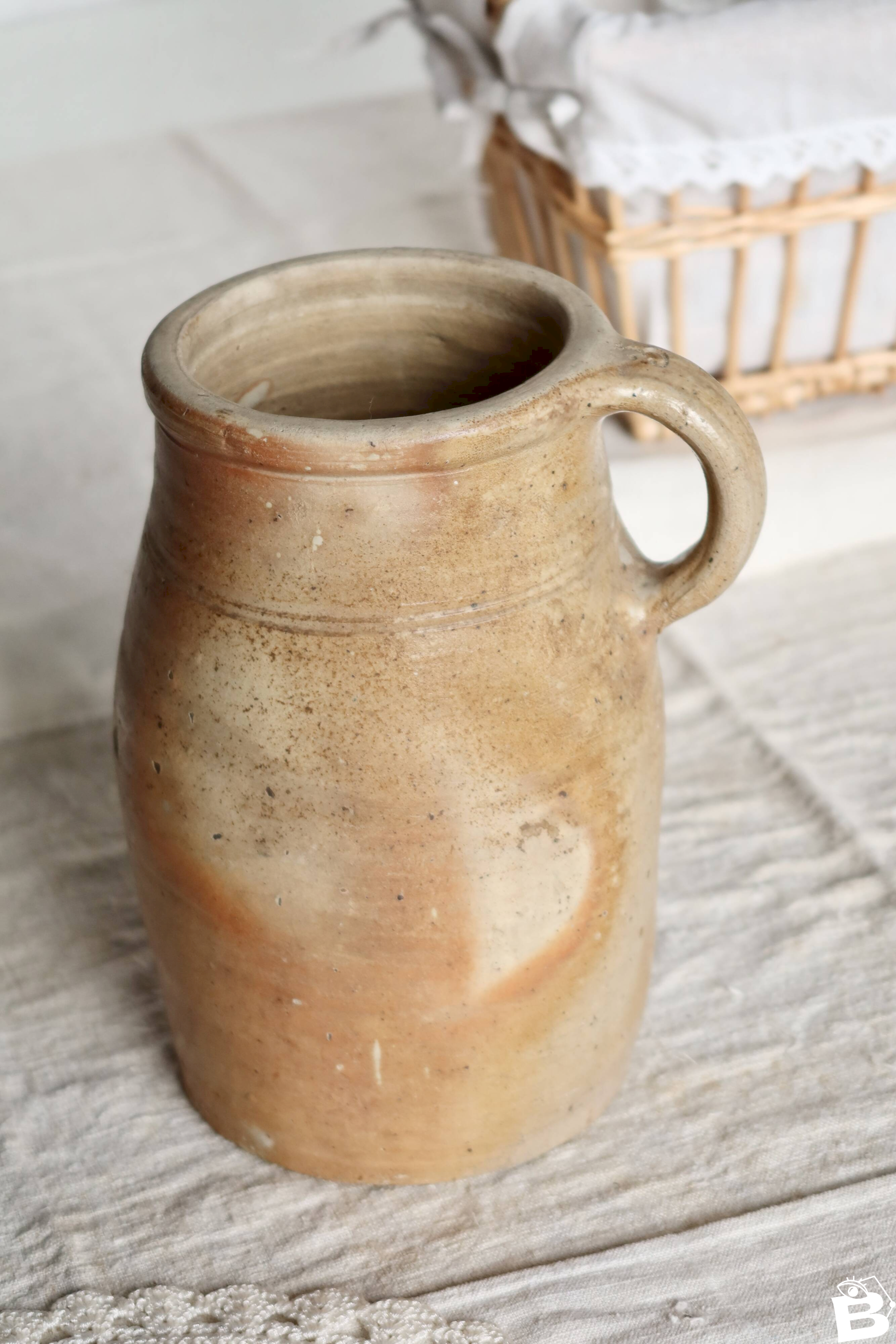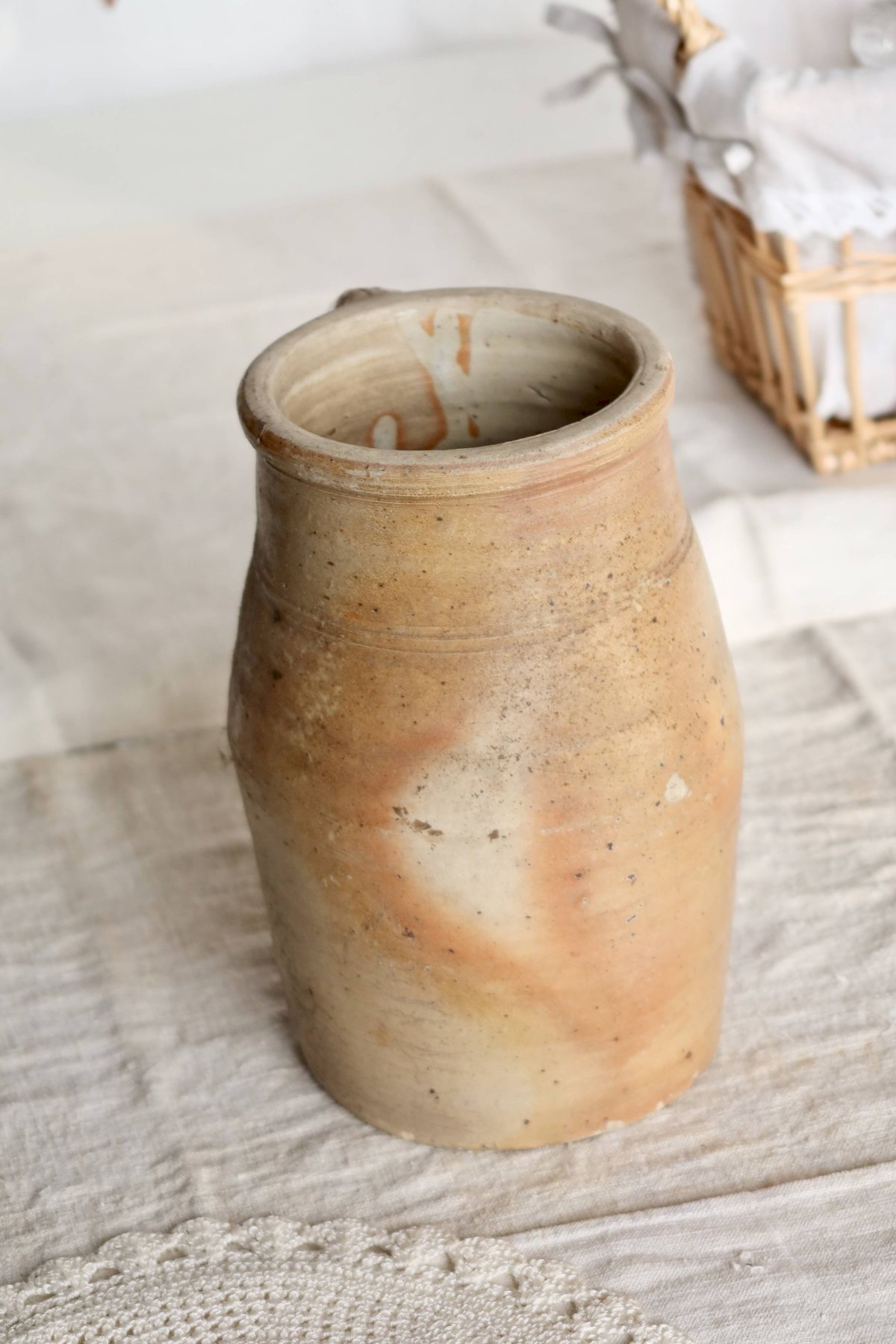 Ancient ceramic jar with a side handle, featuring a natural patina with beige and ochre tones, marked by time. A visible crack on the neck should be noted, but there are no missing chips, giving the piece a raw and authentic charm. Ideal as a rustic decorative object or as a dry container. Dimensions: 24cm (height) X 13cm (diameter). L: 13 W: 13 H: 24