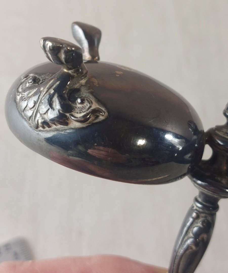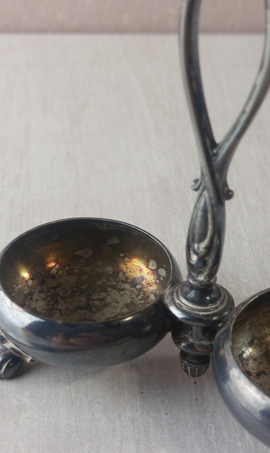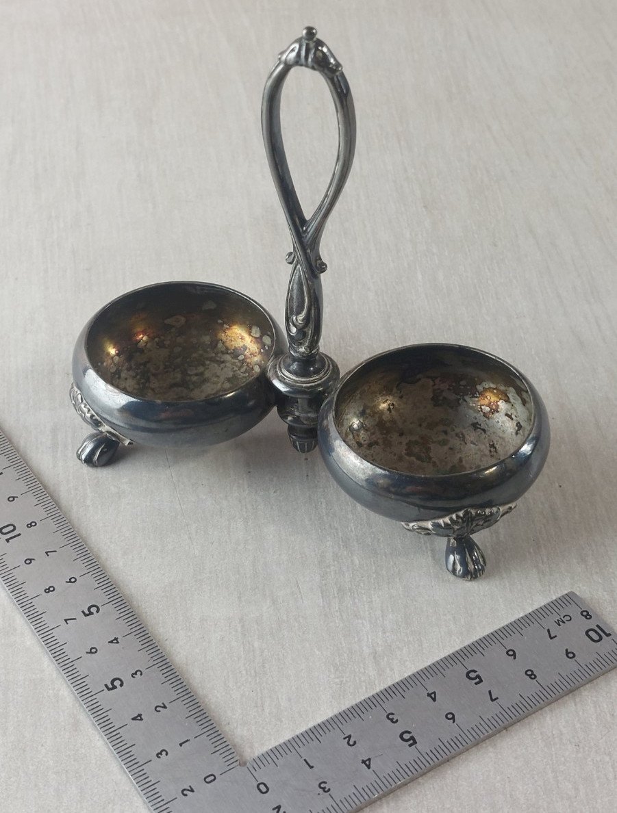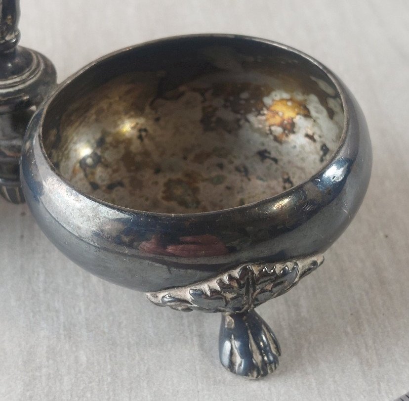 Antique salt and pepper shaker set, silver-plated metal, Krupp Berndorf with decorative feet, in good condition marked Krupp Berndorf, bowl diameter 5.1 cm, total length 11.3 cm, weight 121.68 g, see photos. Check out my other items! Reduced shipping costs for combined purchases. Authenticity: Original Type: Tableware, Kitchen Brand: Krupp Berndorf Period: 20th Century Design Material: Silver-plated Metal