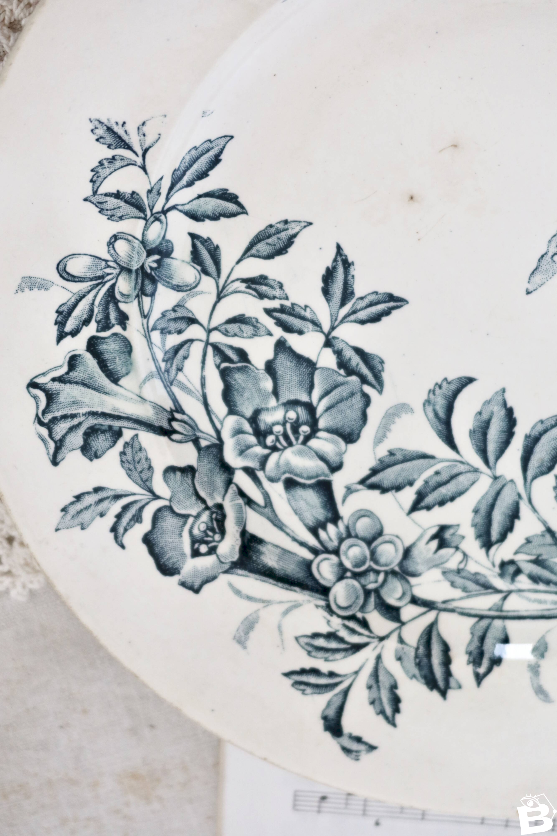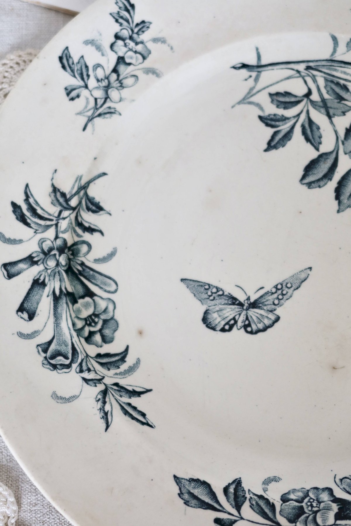 Antique round serving plate in Badonviller faience, Jasmin model, decorated with an elegant floral pattern accompanied by a central butterfly, typical of the late 19th century. The finely printed decor in blue-green tones adds great delicacy and a romantic charm to this piece of antique dinnerware. Good condition for its age, with slight signs of aging and small visible marks in the enamel, consistent with a piece over a century old. Dimensions: 28cm in diameter. L: 28 l: 28 H: 1