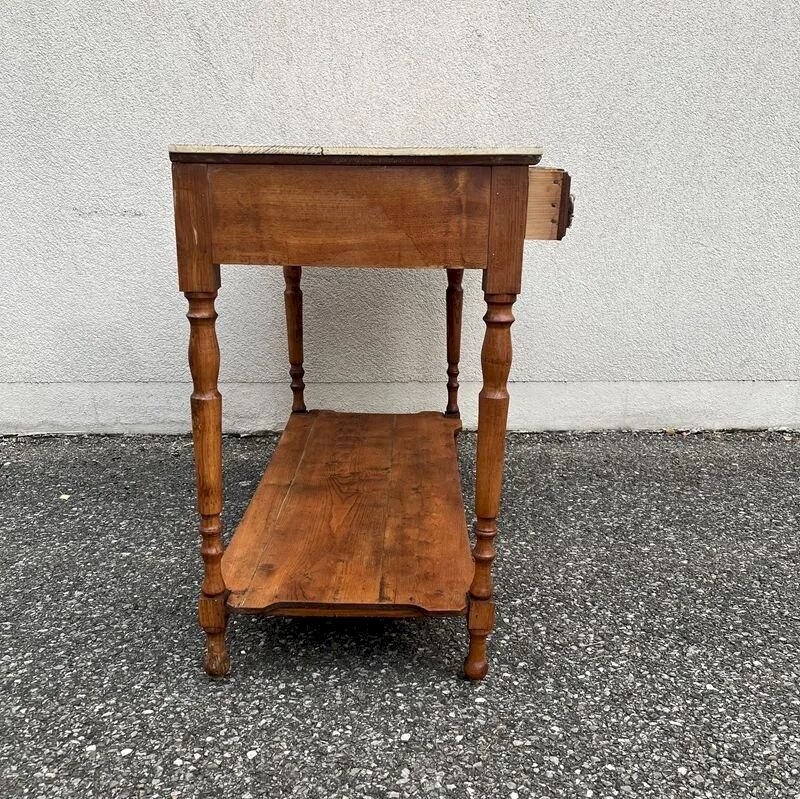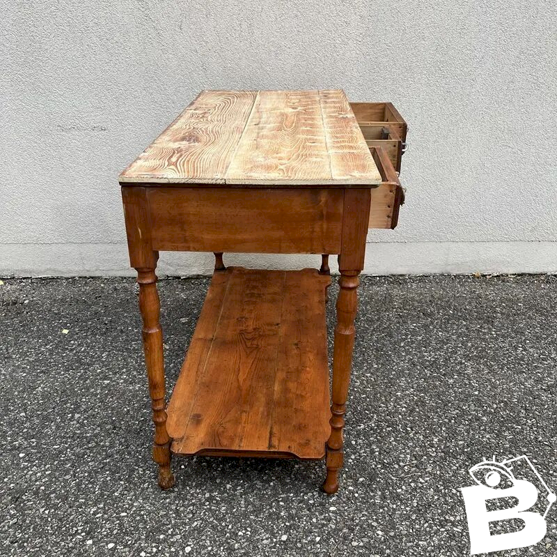 This antique service table or console, featuring three beautifully molded drawers with decorative metal handles, will appeal to lovers of authentic furniture.
