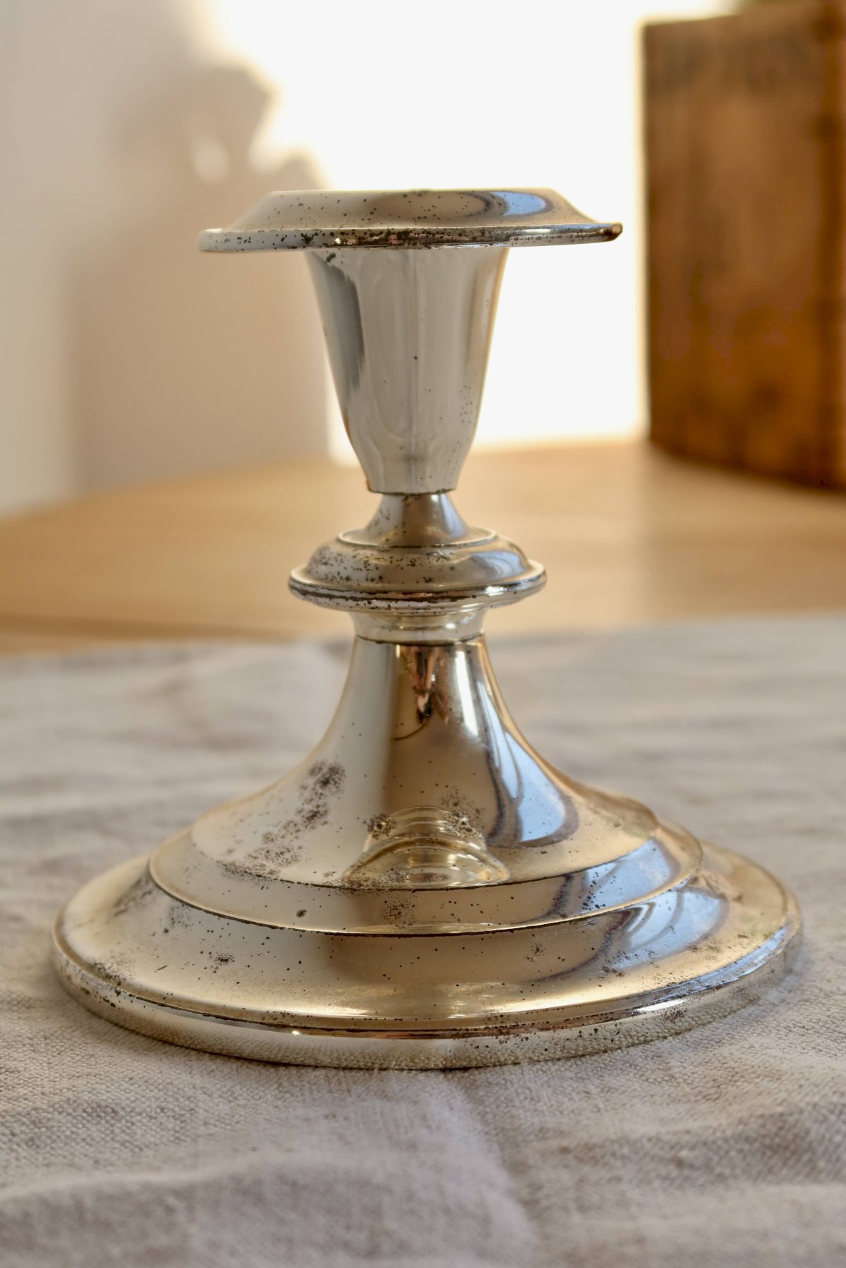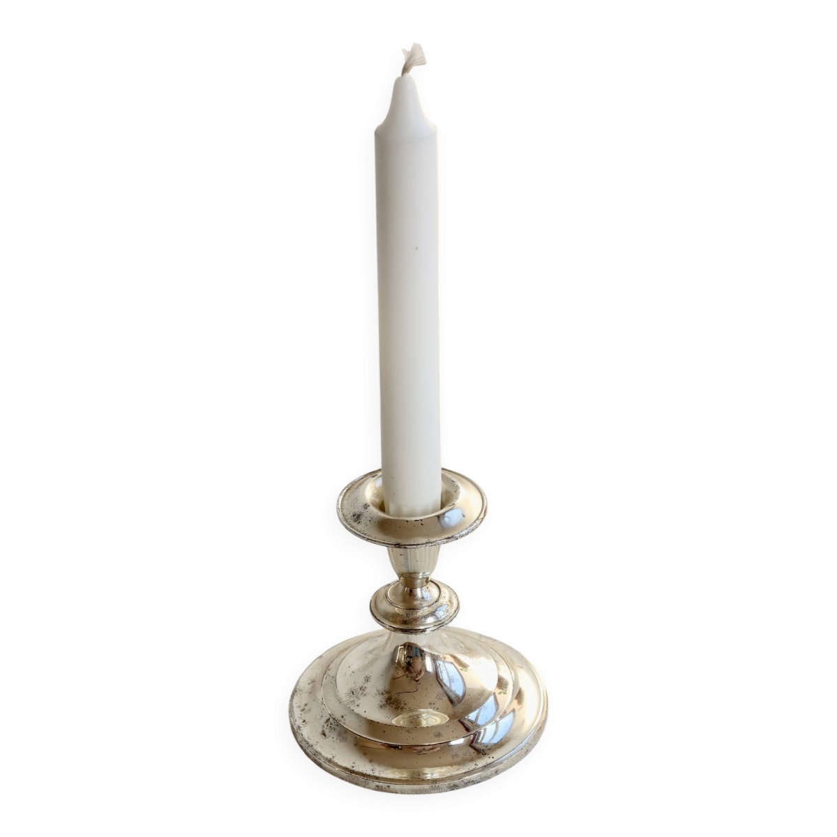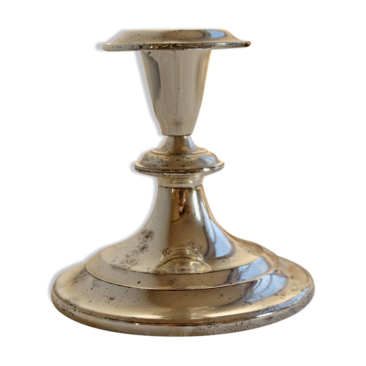 Antique silver-plated candle holder with a simple design, featuring a wide and stable base and a delicately flared cup.