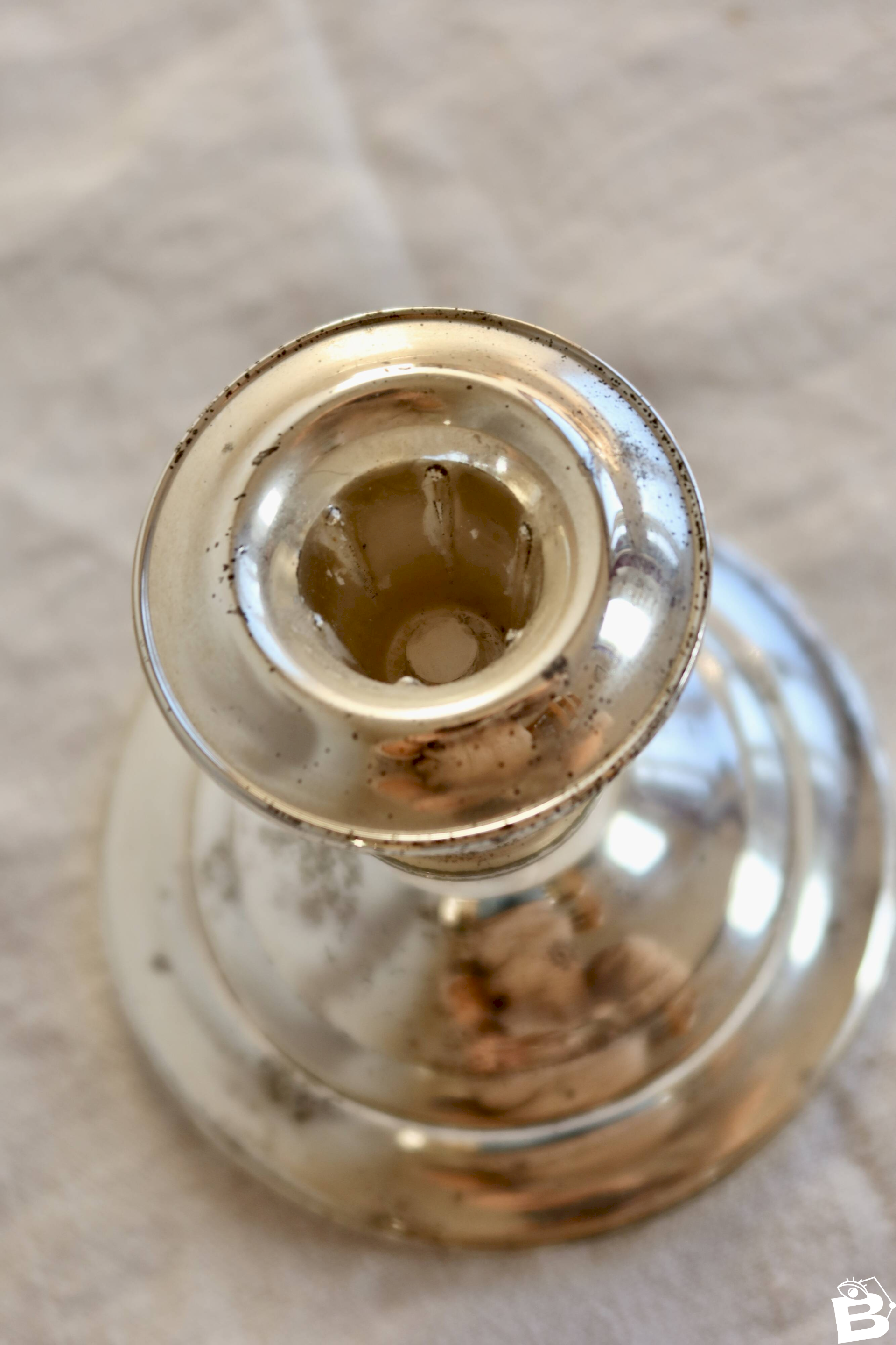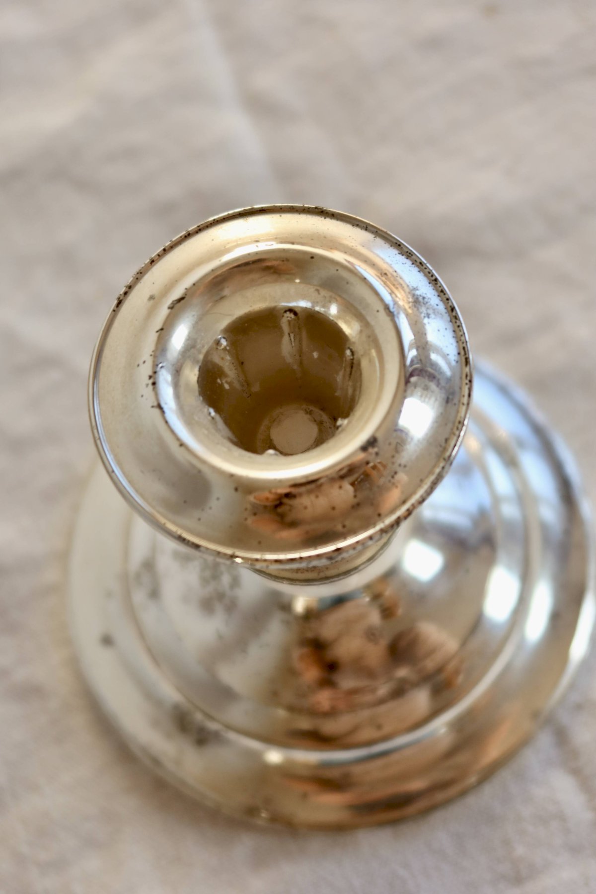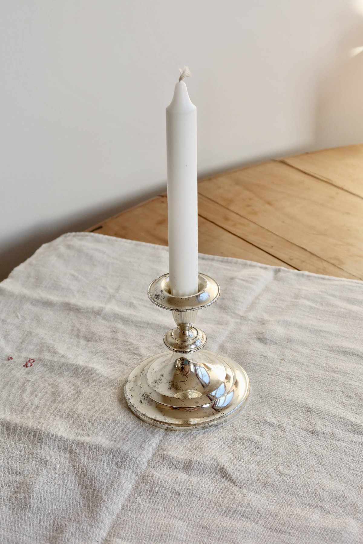 Antique silver-plated candle holder with a simple design, featuring a wide and stable base and a delicately flared cup.