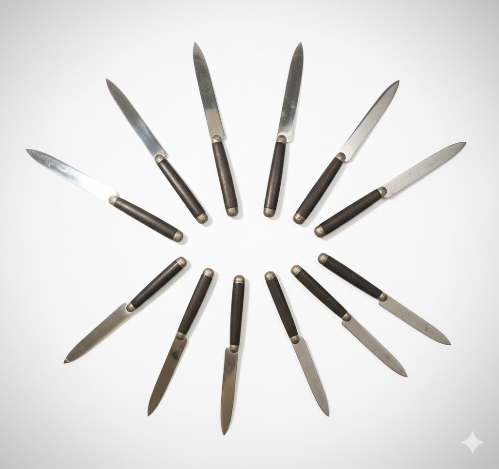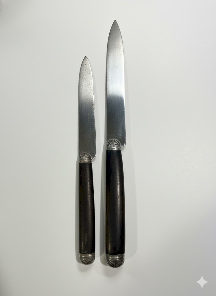 12 stunning antique knives from the 19th century, Napoleonic era, with a blackened wooden handle and stylized shell fittings and tips. 6 small and 6 large matching ones. Truly beautiful.
