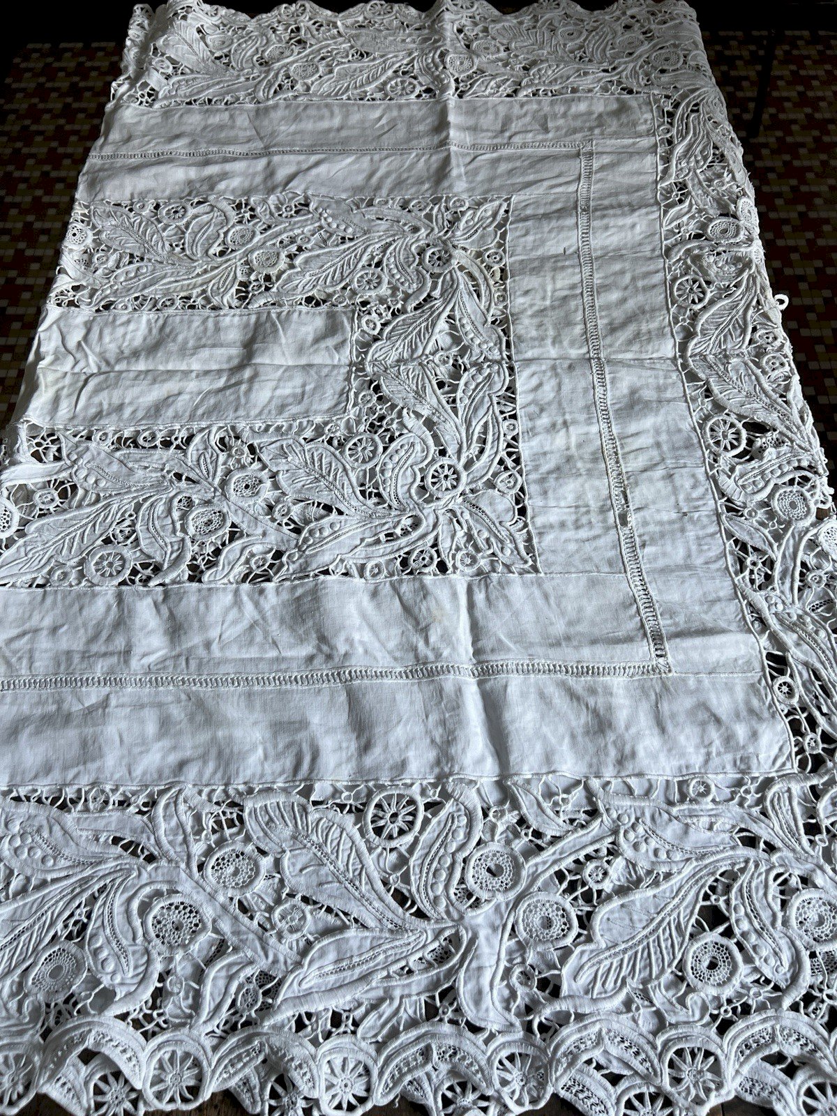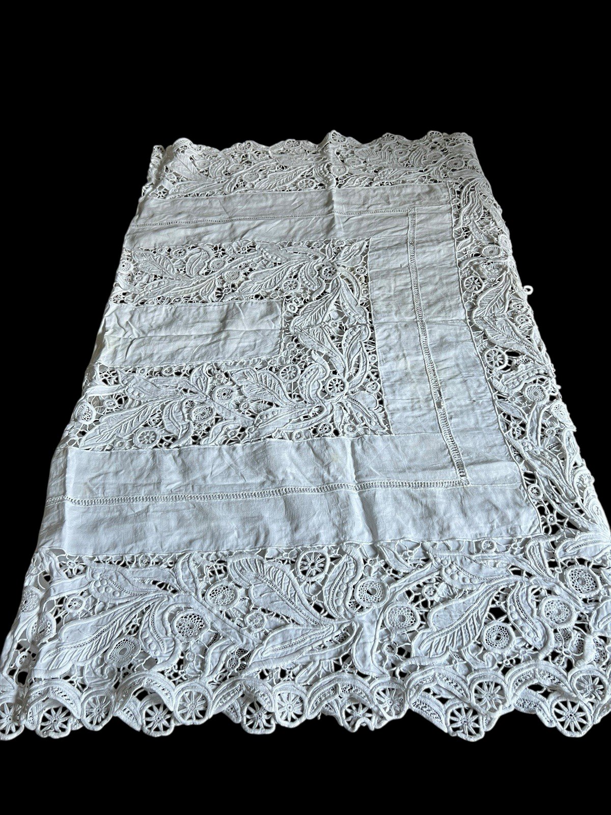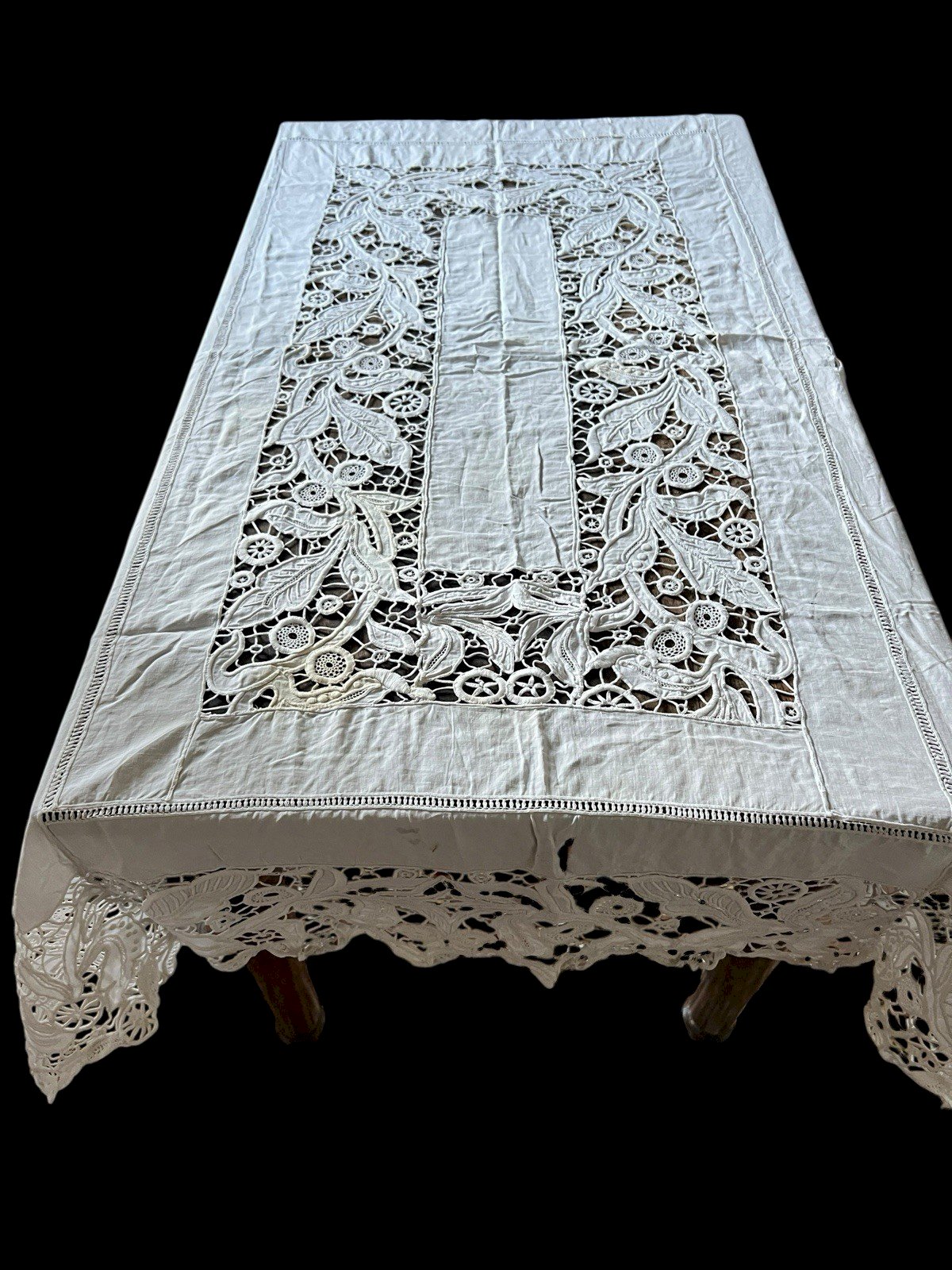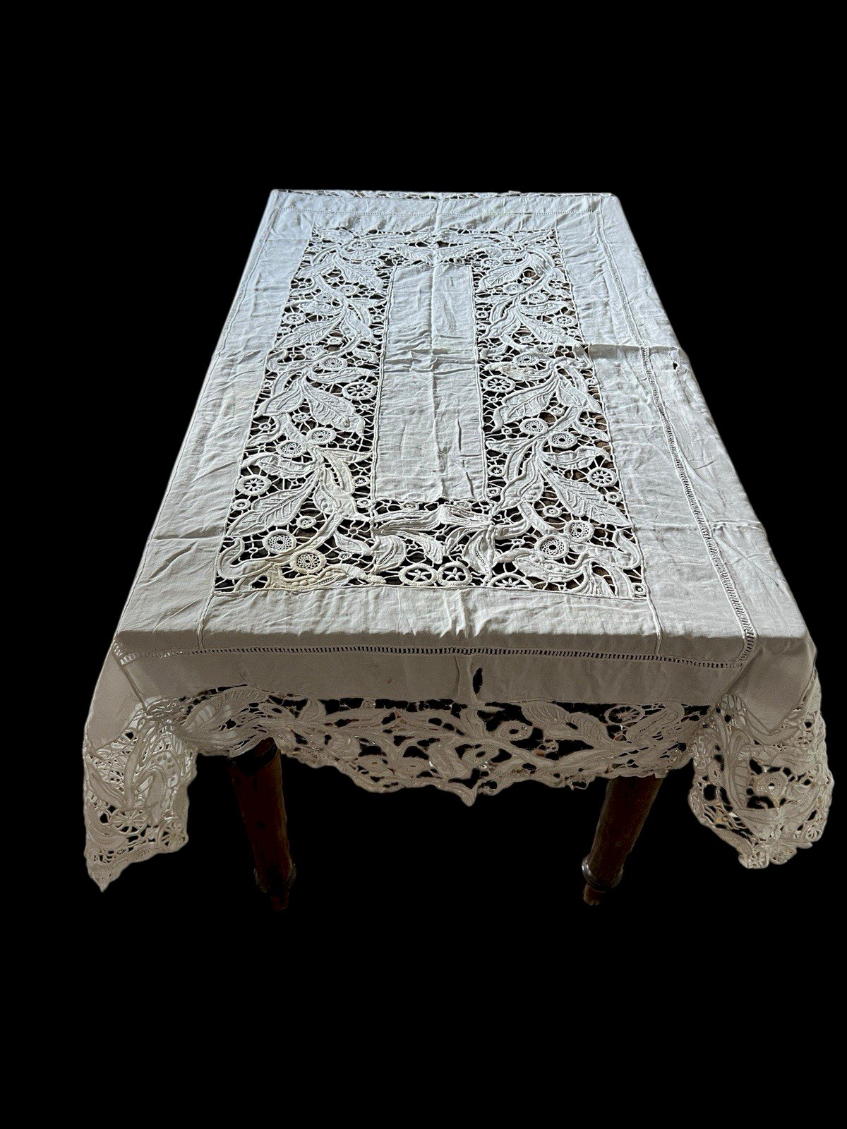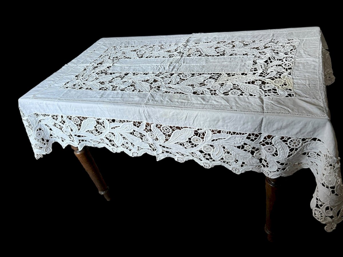 Large rectangular display tablecloth from the 19th century, made with handmade Richelieu embroidery (openwork embroidery or cutwork). * Dimensions: 148 cm × 216 cm. * Technique: Richelieu embroidery, featuring a beautiful cut floral and plant iconography. * Condition and restoration: * The center is in generally good condition, marked by two yellow stains that could be cleaned. * The edges show wear and some tears requiring restoration, but the exceptional quality of the embroidery makes the whole piece recoverable. This item is a fine example of 19th-century textile craftsmanship, ideal for collection or a restoration project. Color: White Era: 19th century Type: Embroidery Use: Table linen Origin: France Country of origin: France Material: Cotton Length: 216 cm Width: 148 cm