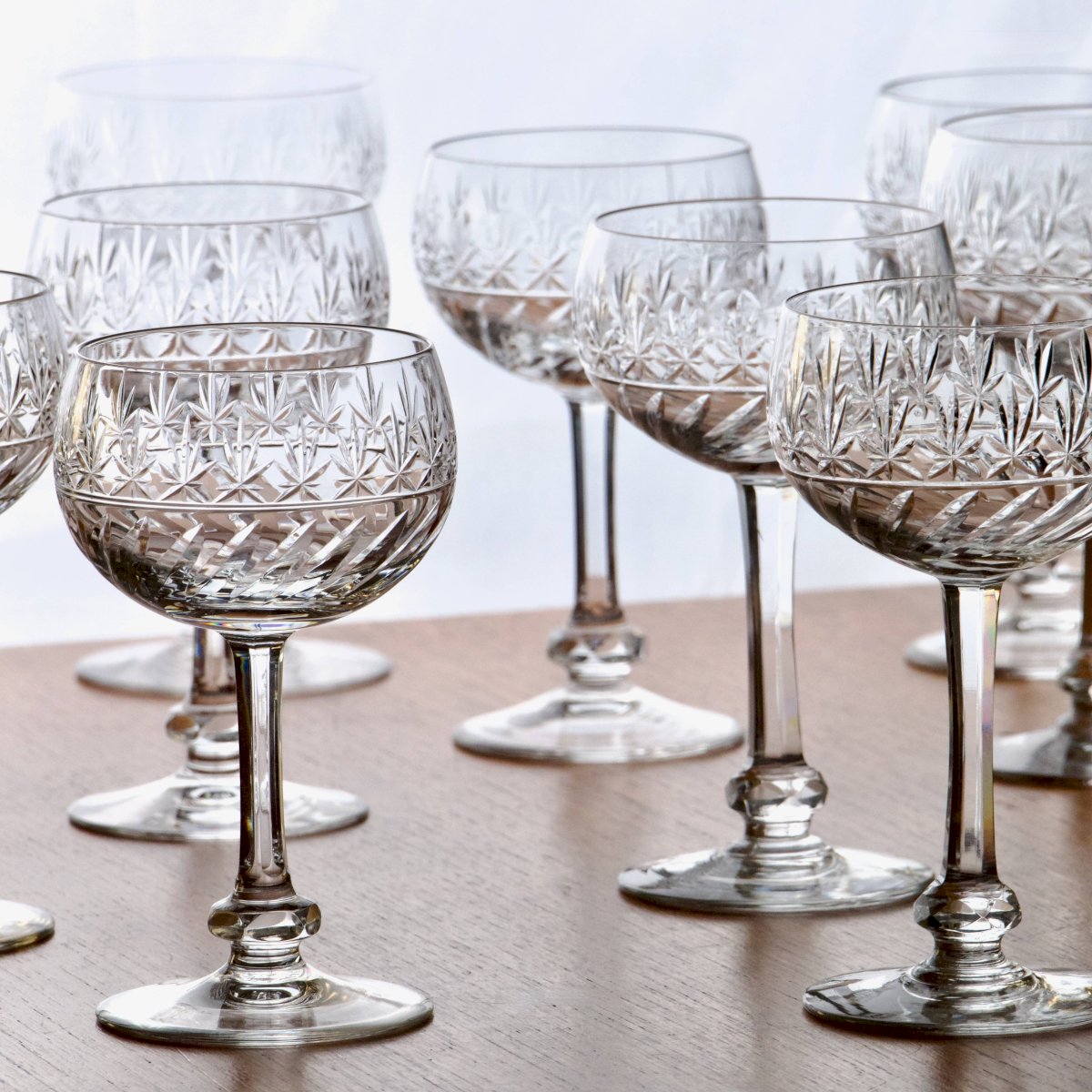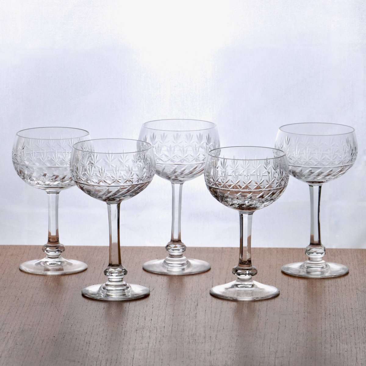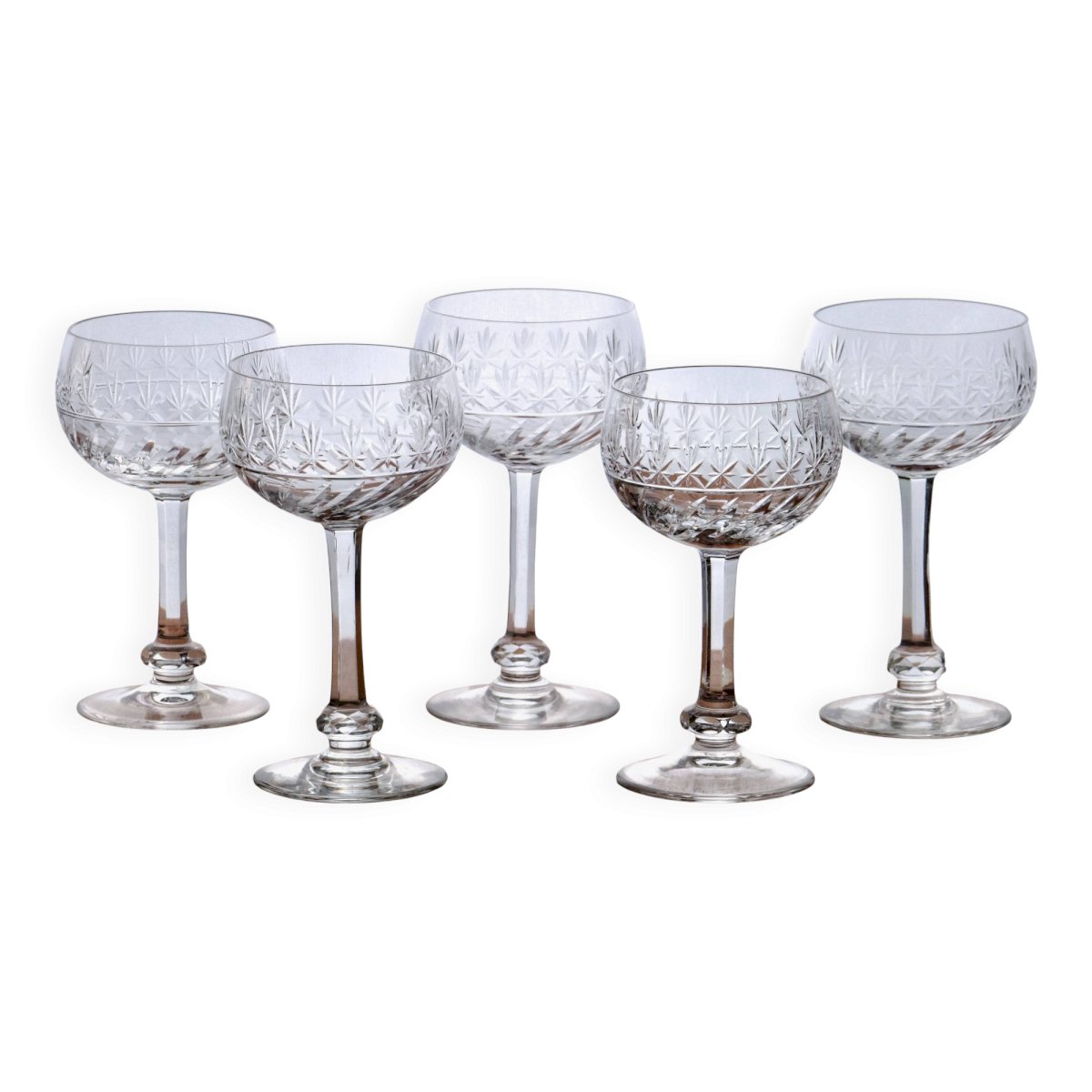 Set of beautiful antique blown crystal wine glasses from Villeroy & Boch's Treveris collection, handcrafted. Leaf engraving at the bottom of the goblet, then star engraving at the top. Bottom of the stem with diamond cut knot facets. Round and generous goblet. They are all in very good condition. ? 13 X 7.5 cm. ✨ Very careful shipping. ✨ We have other listings online, feel free to take a look. 900g. L: 13 W: 7 H: 13