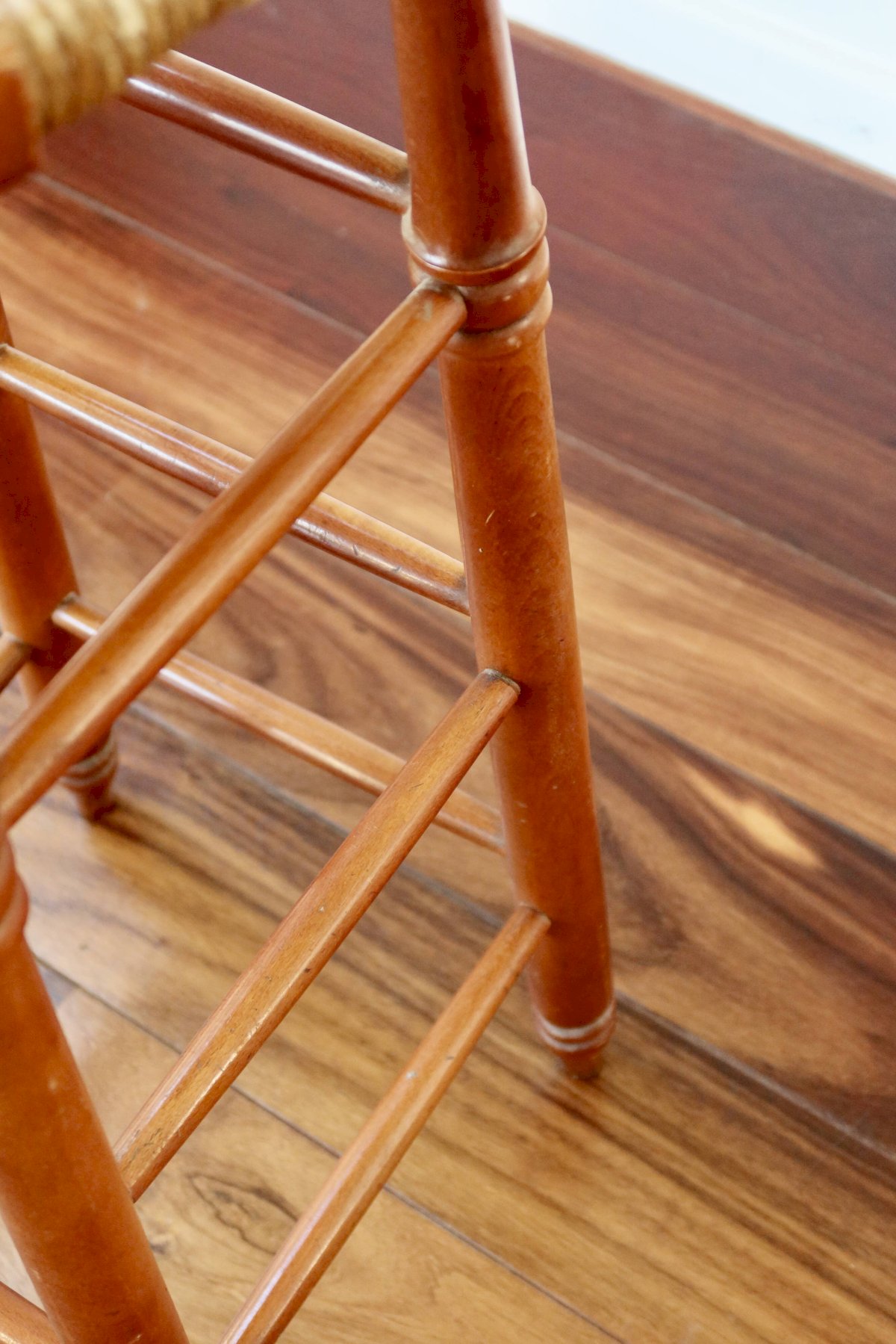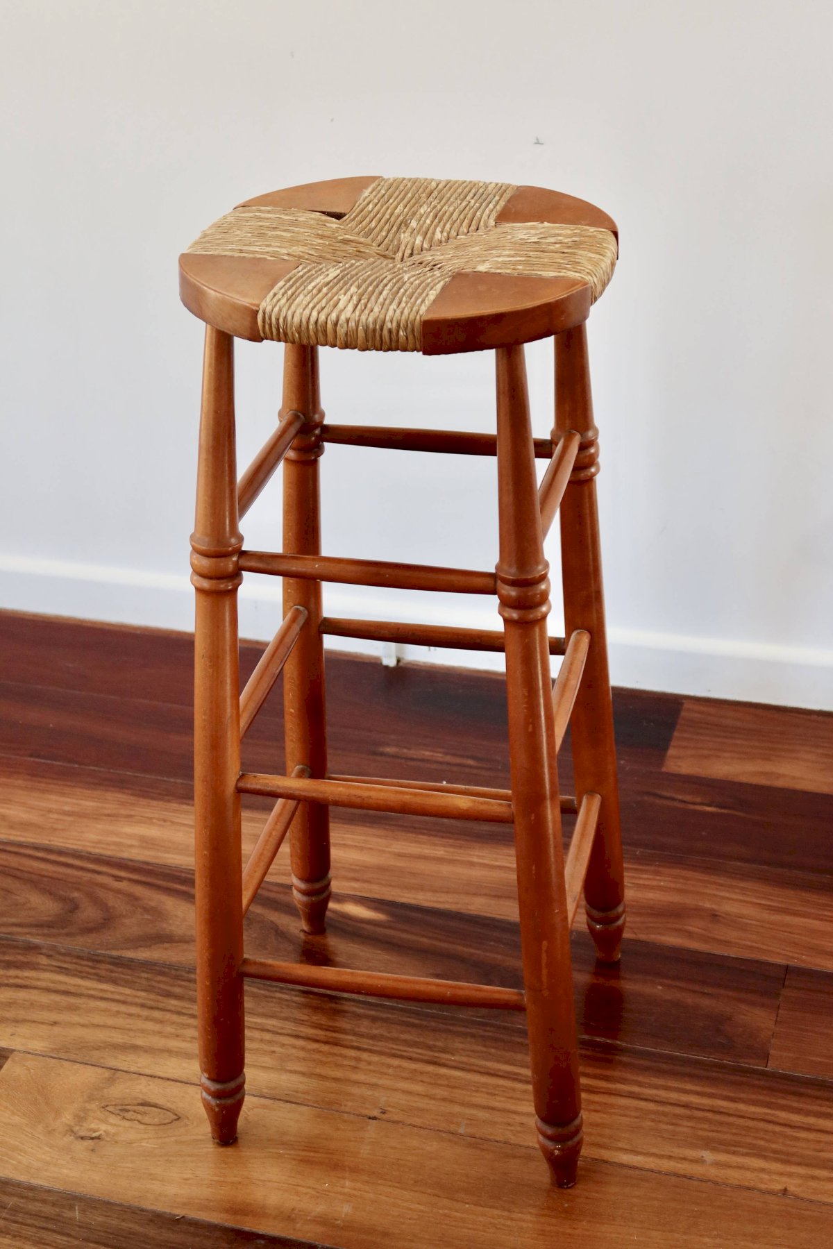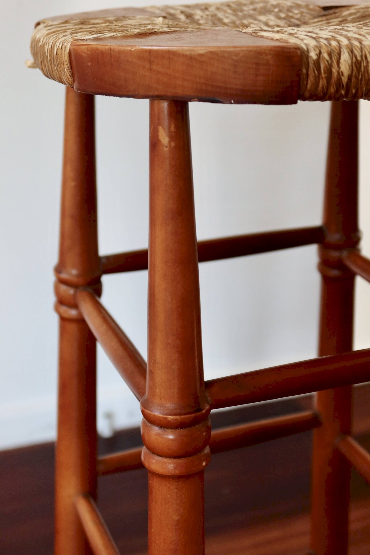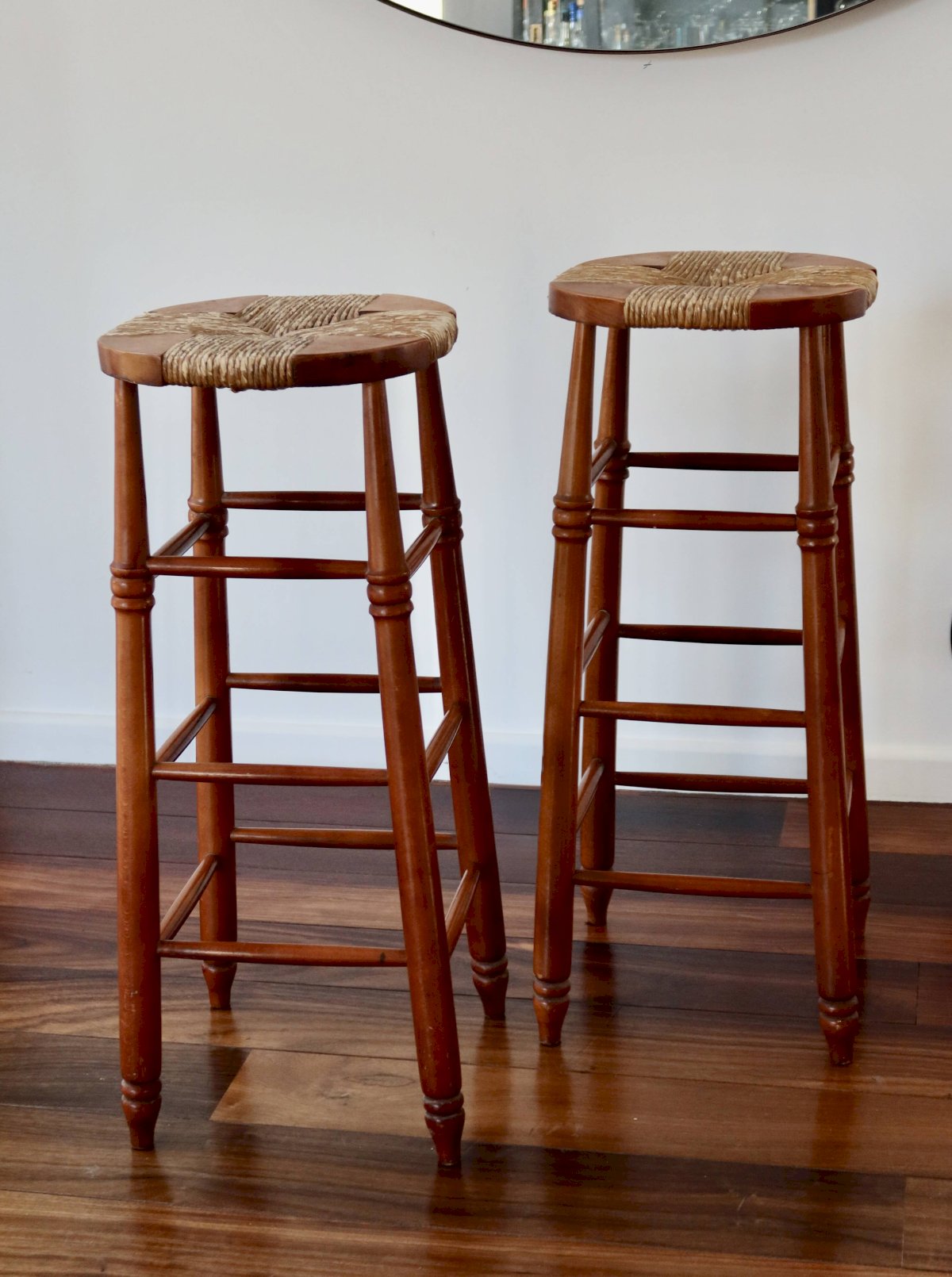 The wood has a warm patina, and the weaving shows subtle variations in color, reflective of their use and authenticity. Sold individually or as a pair, they naturally fit around a counter, in a rustic kitchen, or a chic country interior. Dimensions: Height: 80cm. Seat: 32cm X 32cm. L: 32 W: 32 H: 80.