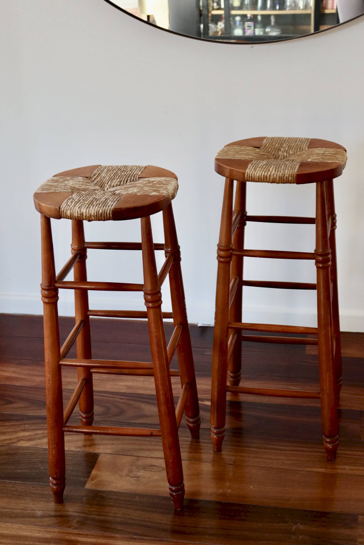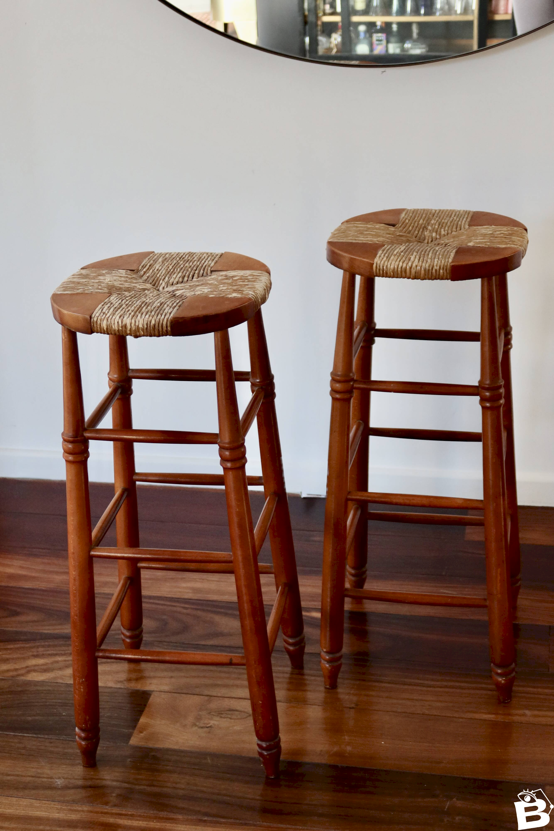 High wooden bar stools featuring a cross-woven seat and turned legs that evoke traditional craftsmanship.