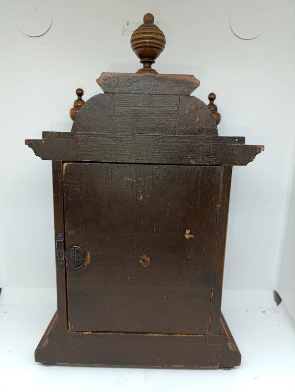 antique wooden tabletop clock from the late 19th century, mechanism to be revised, in good condition, not stuck but does not start, some marks on the wood mainly on the back and a crease on the bottom of the dial (see photos) total height 34cm...