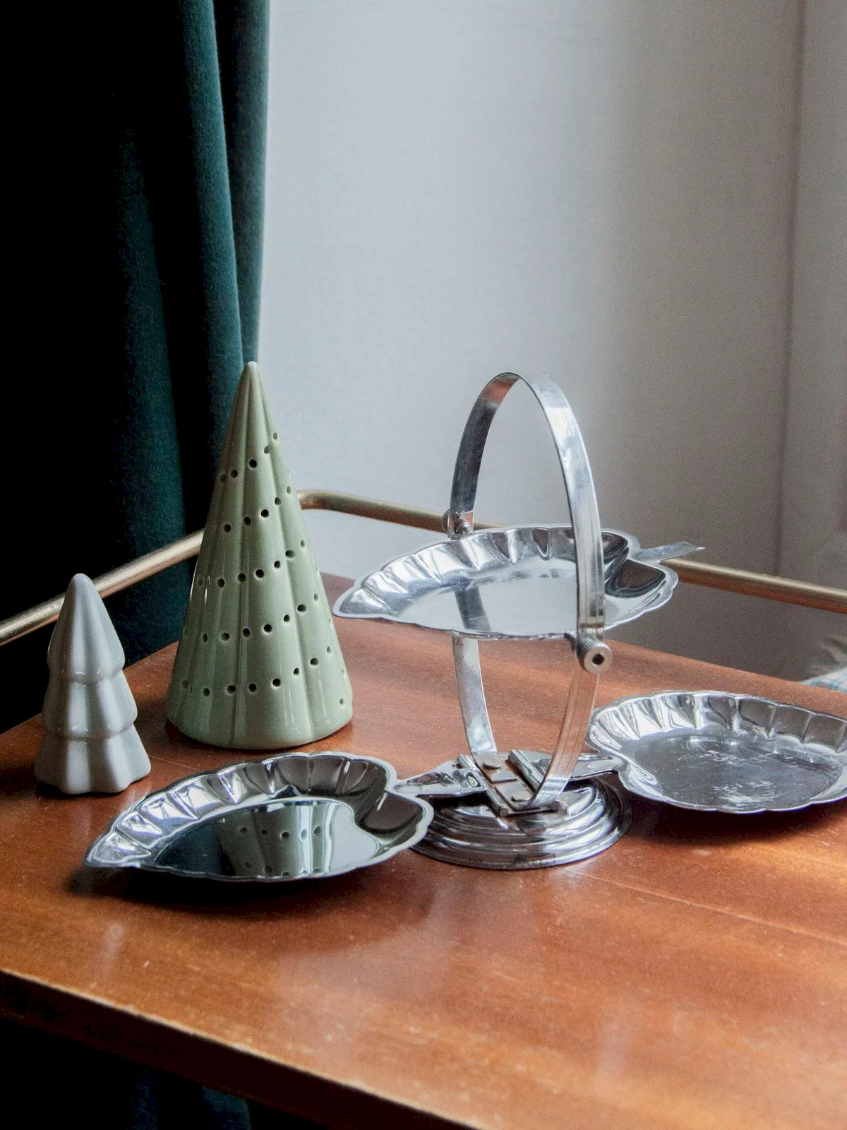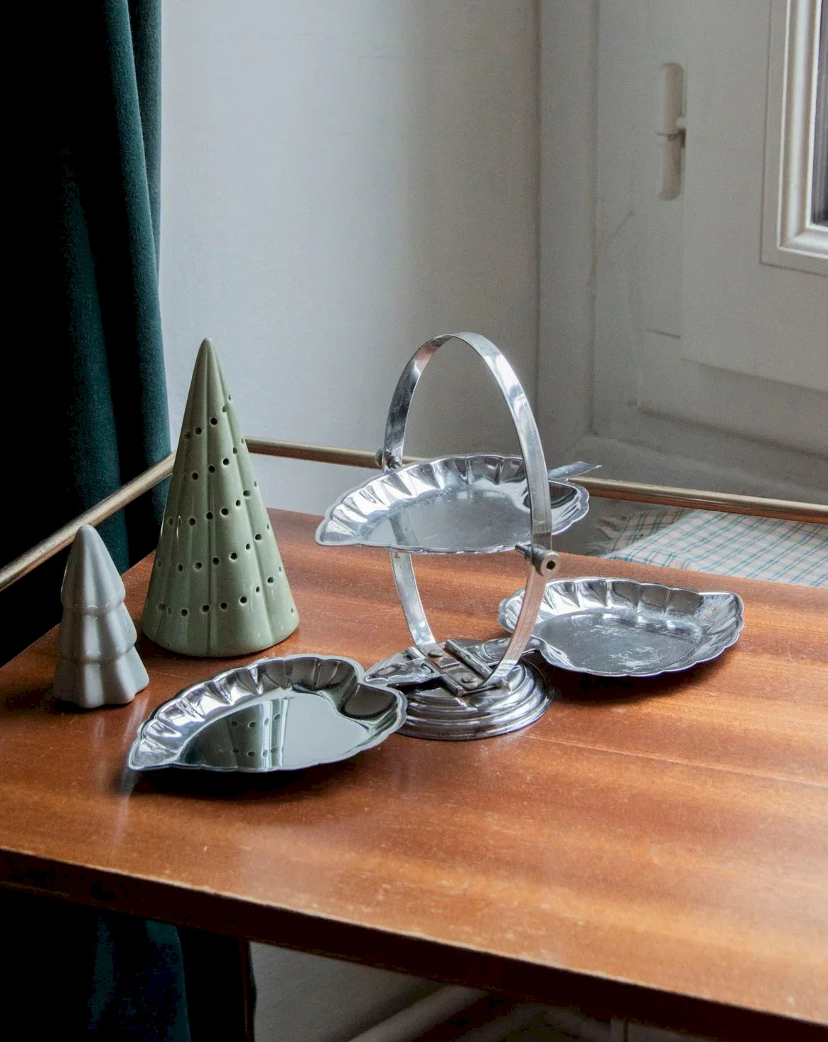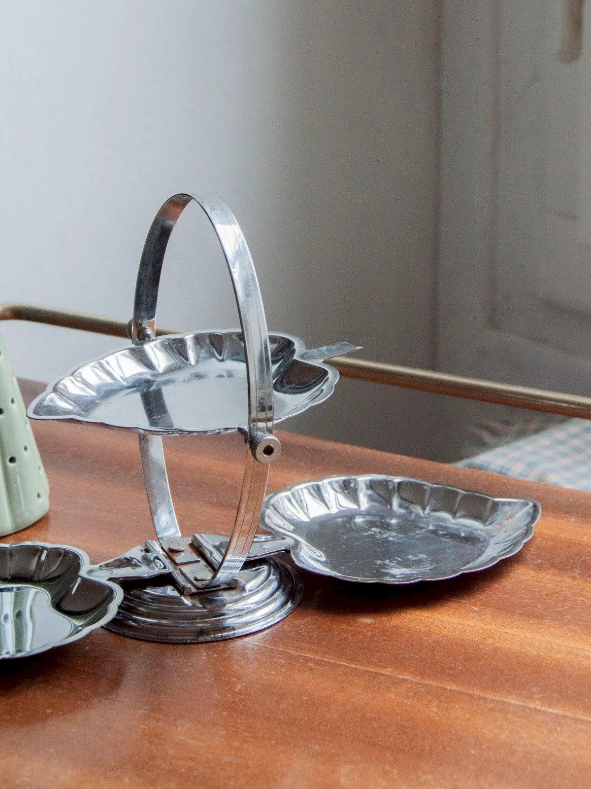 Add this metal presentation dish in the shape of a leaf, designed to enhance your appetizers with its three modular sections that open to reveal assortments and treats. Practical, it folds up for neat storage and is easy to carry, with its elongated silhouette adding a natural and contemporary touch to a warm table. The polished metal reveals a sleek and luminous finish, ideal for an elegant display. Light scratches. Length: 28 cm Width: 11 cm Height: 14 cm Condition: Used: Item has been used. Item shows some signs of superficial wear... Used: Item has been used. Item shows some signs of superficial wear, fully operational and functioning correctly. It may be a demonstration model or an item returned to the store after a short period of use. Any potential imperfections. Brand: Debongout Type: Thrifted product Material: Stainless steel Style: Country.