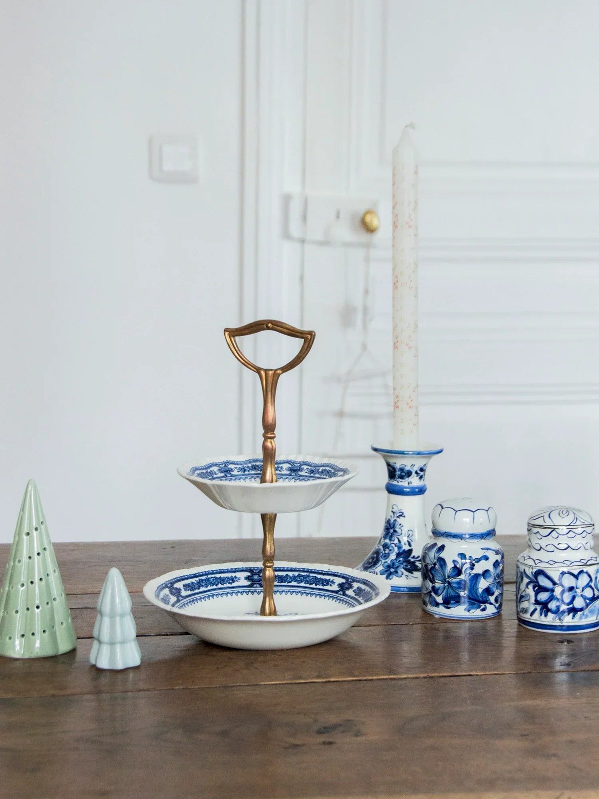 Enhance your desserts and pastries with this two-tiered serving stand made of blue earthenware and golden metal, which combines delicacy and elegance. The earthenware plates provide a subtly painted background while the golden frame structures a light and refined silhouette. Its vertical format optimizes space and showcases petits fours, pastries, and appetizers during a snack or an aperitif. Evoking a friendly and well-kept atmosphere, it invites sharing and tasting. Height: 27 cm Diameter at the widest point: 18 cm Condition: Used item: Item that has been used. Item showing some signs of superficial wear... Used item: Item that has been used. Item showing some signs of superficial wear, fully operational and functioning correctly. It may be a demonstration model or an item returned to the store after a short period of use. Potential imperfections. Brand: Debongout Type: Vintage product Material: Earthenware, Metal Style: Country
