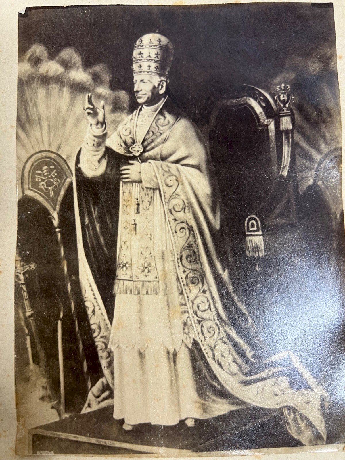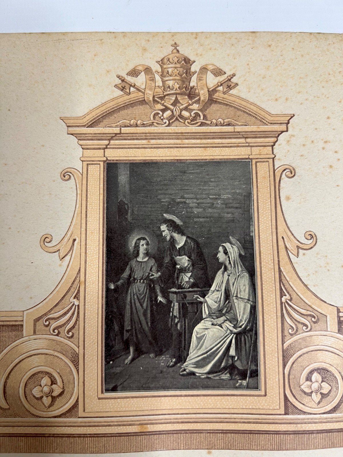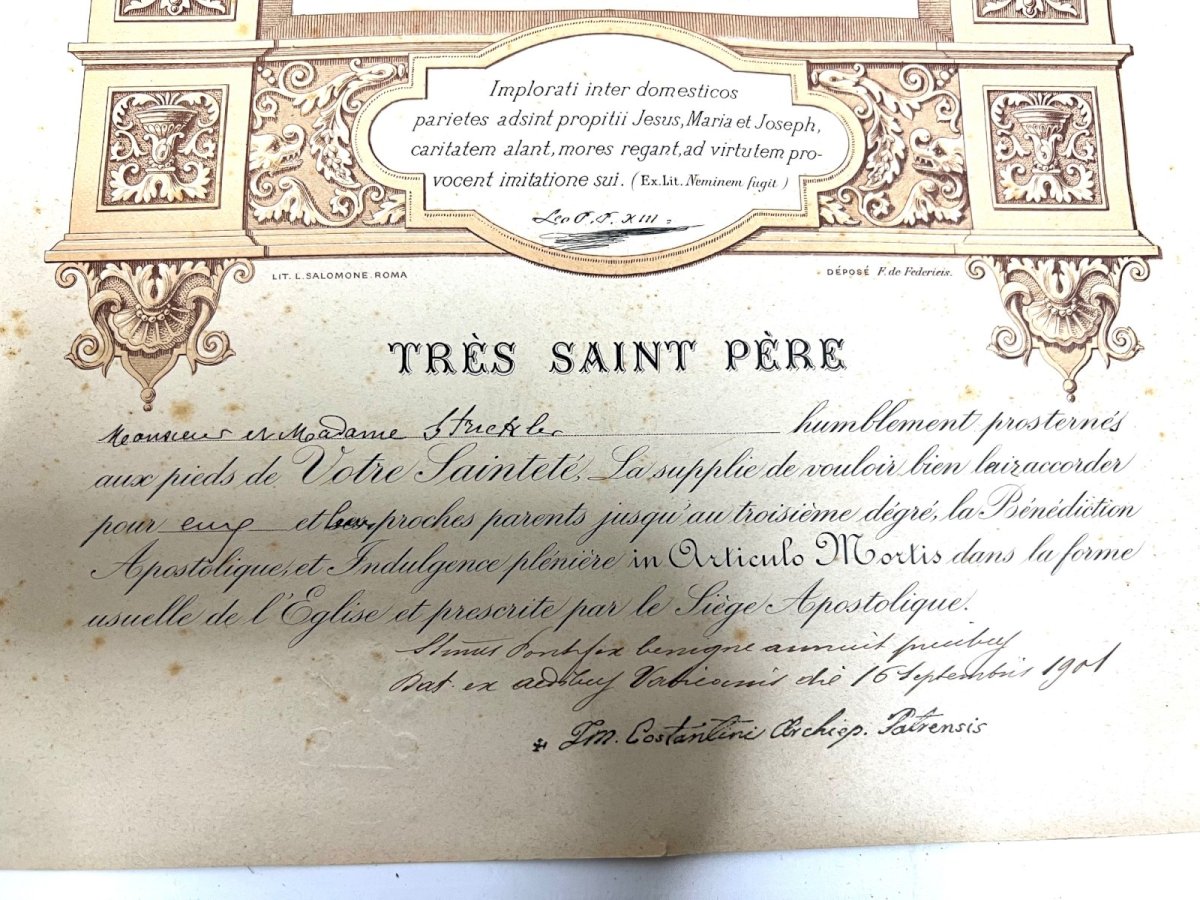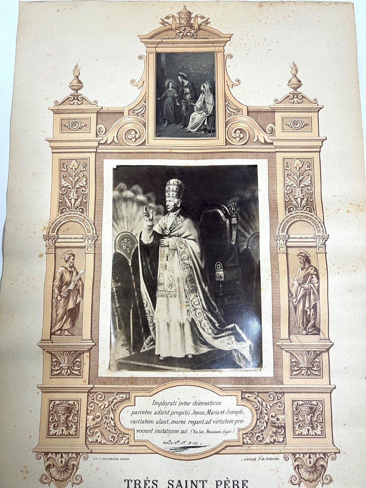 Apostolic Blessing – Vatican 1901 – Archbishop Th. Costantini – Original Document Sublime apostolic blessing issued at the Vatican on September 16, 1901, addressed to Mr. and Mrs. Streckle. This exceptional document, printed by Salomone in Rome, features a rich ornamental composition, with a photograph of a pontiff blessing, surrounded by a lithographed neo-Renaissance frame. The handwritten text grants a plenary indulgence “in articulo mortis” according to the rites of the Holy See. Relief seal of the Vatican at the bottom of the document (tiara and keys of Saint Peter). An emotional testimony of the Catholic faith at the turn of the 20th century, rare in this state of preservation. Dimensions: 51 cm x 30 cm Date: September 16, 1901 Origin: Vatican, Rome Publisher: Lit. Salomone Roma Condition: Good general condition, slight foxing and patina from time. Papal blessing, Vatican document, Apostolic benediction, Holy See, Plenary indulgence, In articulo mortis, 1901 papal letter, Catholic collectible, Pope Leo XIII, Rome Vatican, Religious antique, Benedizione apostolica, Documento Vaticano Vatican 1901 Papal Blessing – Apostolic Indulgence – Archbishop Costantini Condition: Used item. Please consult the seller's description for more details ... Used item. any imperfections. Type: Christianity Material: Paper, Cardboard