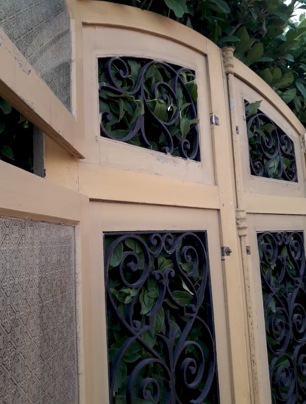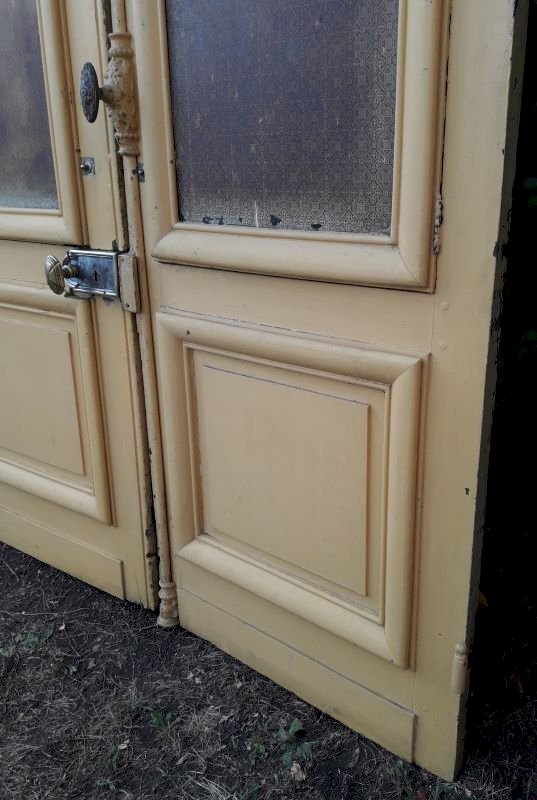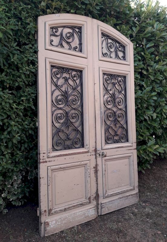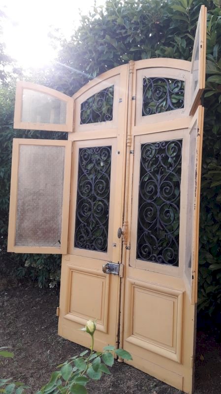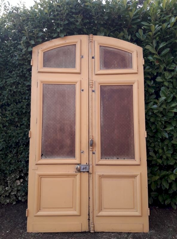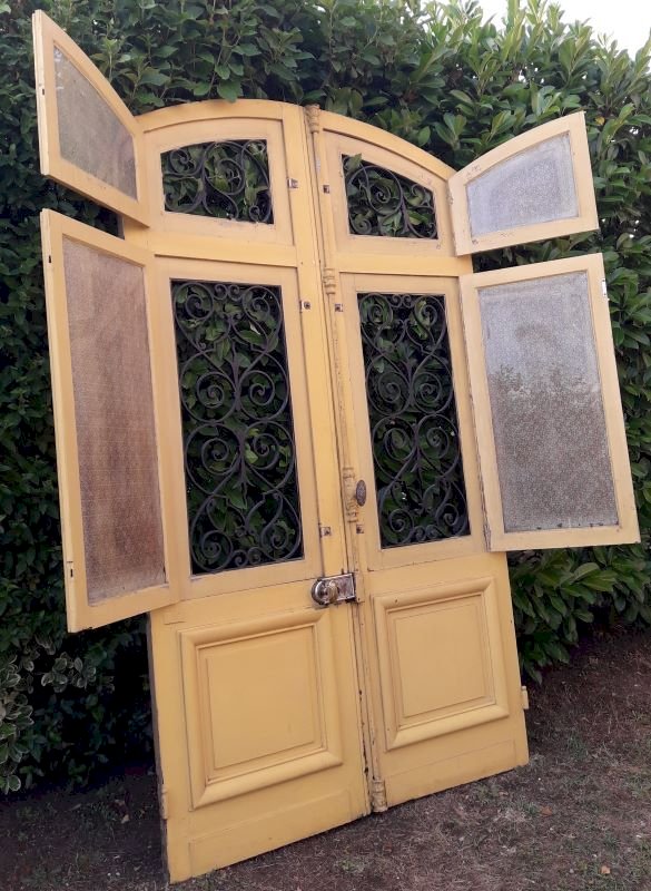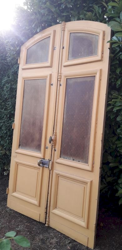 Large and imposing arched double entrance door made of solid oak, with two pairs of opening glazed panels in the upper part.