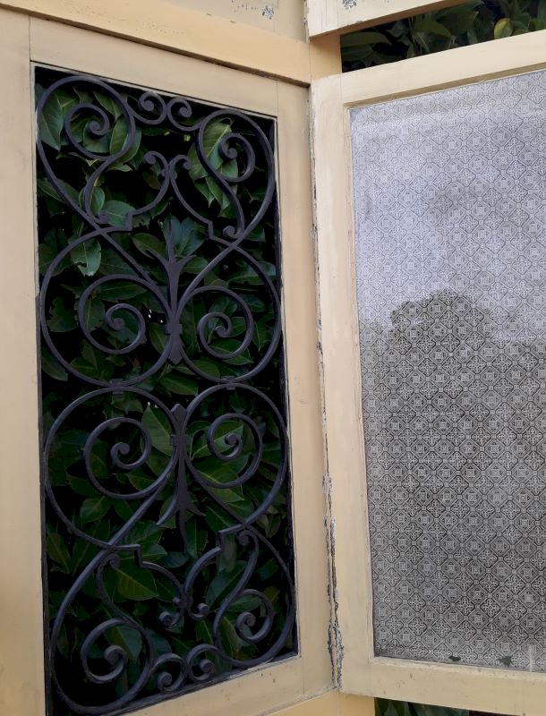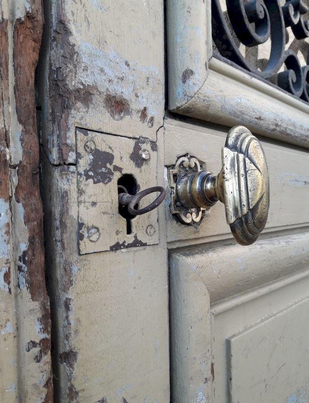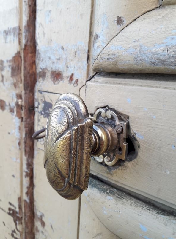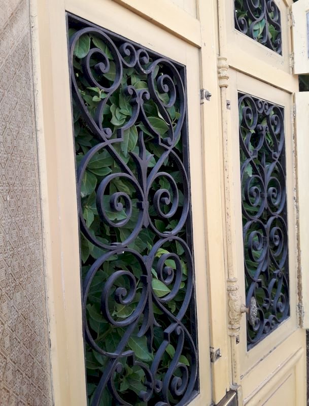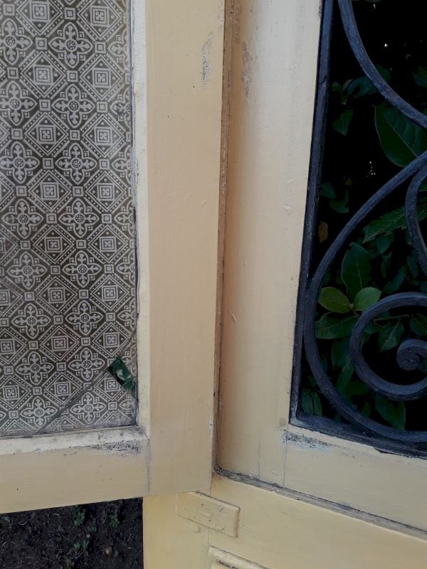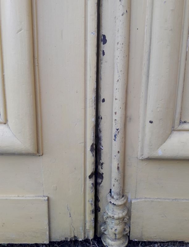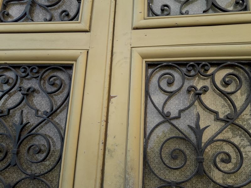 Large and imposing arched double entrance door made of solid oak, with two pairs of opening glazed panels in the upper part.