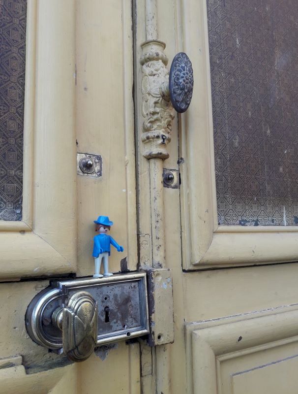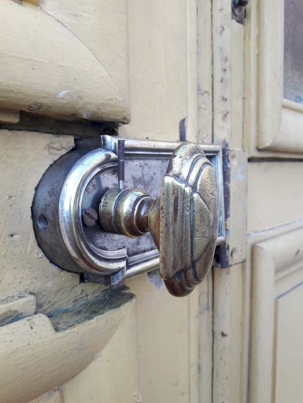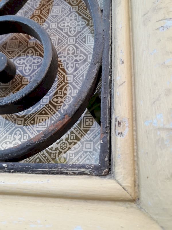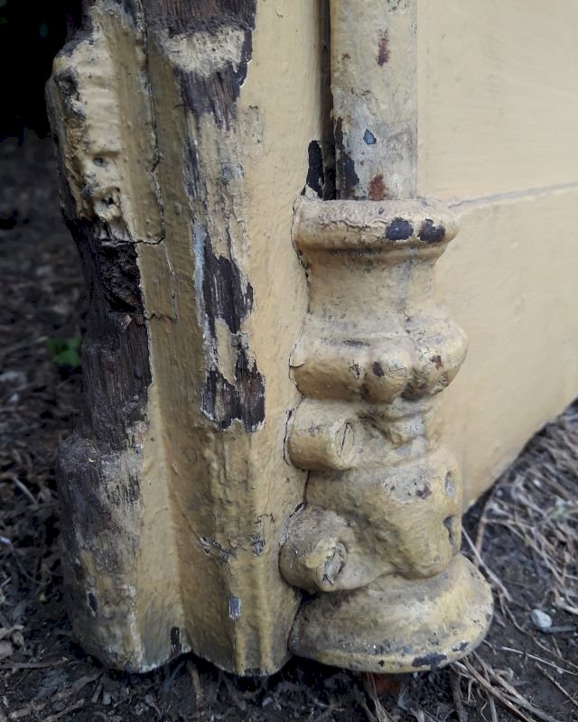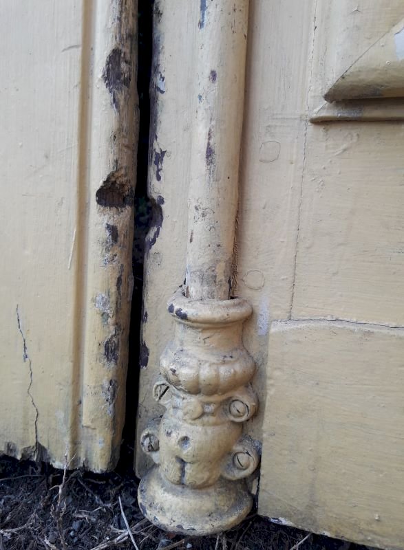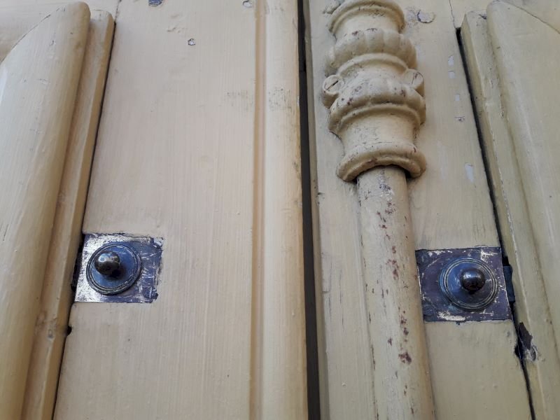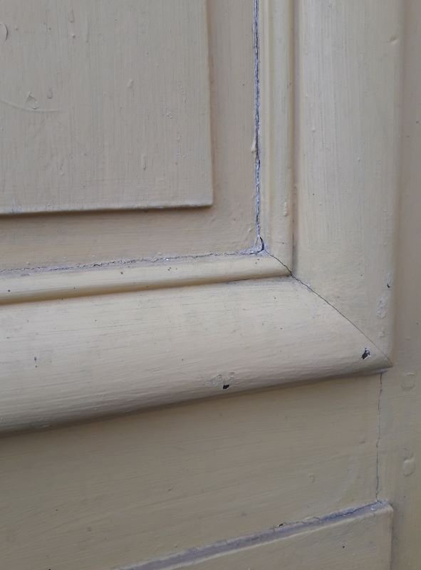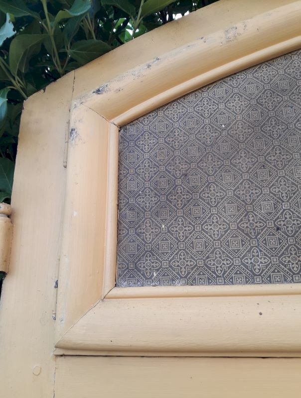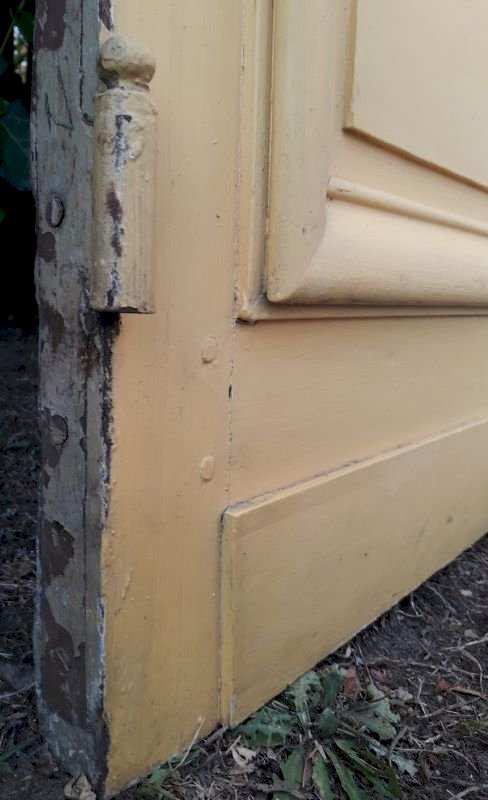 Massive and sturdy, this door features a beige-yellow painted oak on the outside and yellow on the inside.