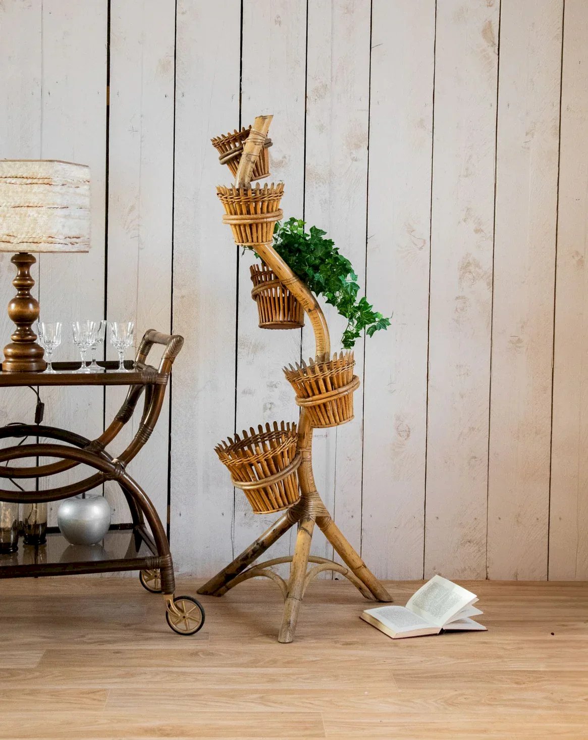 Add this light patinated bamboo plant stand, which impresses with its refined verticality and light silhouette. It accommodates five pots with progressively thought-out diameters, providing a coherent composition for cascading plants and compact tufts. Its patinated finish diffuses a natural warmth and an artisanal touch, perfect for enlivening a living corner, a veranda, or a balcony. The muted and organic style creates a calming and leafy atmosphere. Length: 59 cm Width: 59 cm Height: 139 cm Diameter of the pots from top to bottom: 14.5 cm / 15 cm / 16 cm / 17 cm / 19.5 cm Condition: Used: Item has been used. Item shows some superficial signs of wear, ...Used: Item has been used. Item shows some superficial signs of wear, fully operational and functioning correctly. It may be a demonstration model or an item returned to the store after a short period of use, with possible imperfections. Brand: Debongout Type: Vintage product Material: Bamboo Style: Country