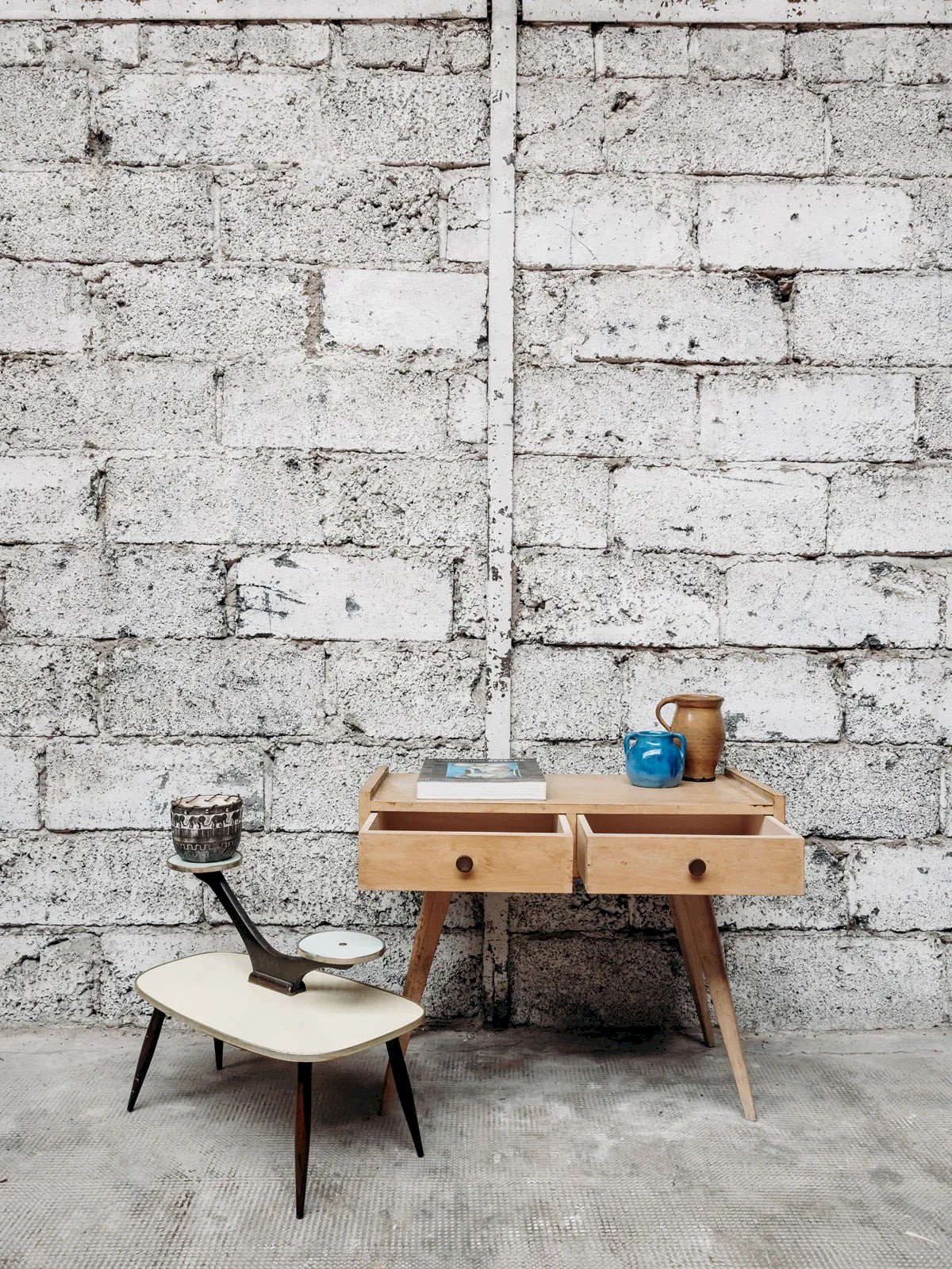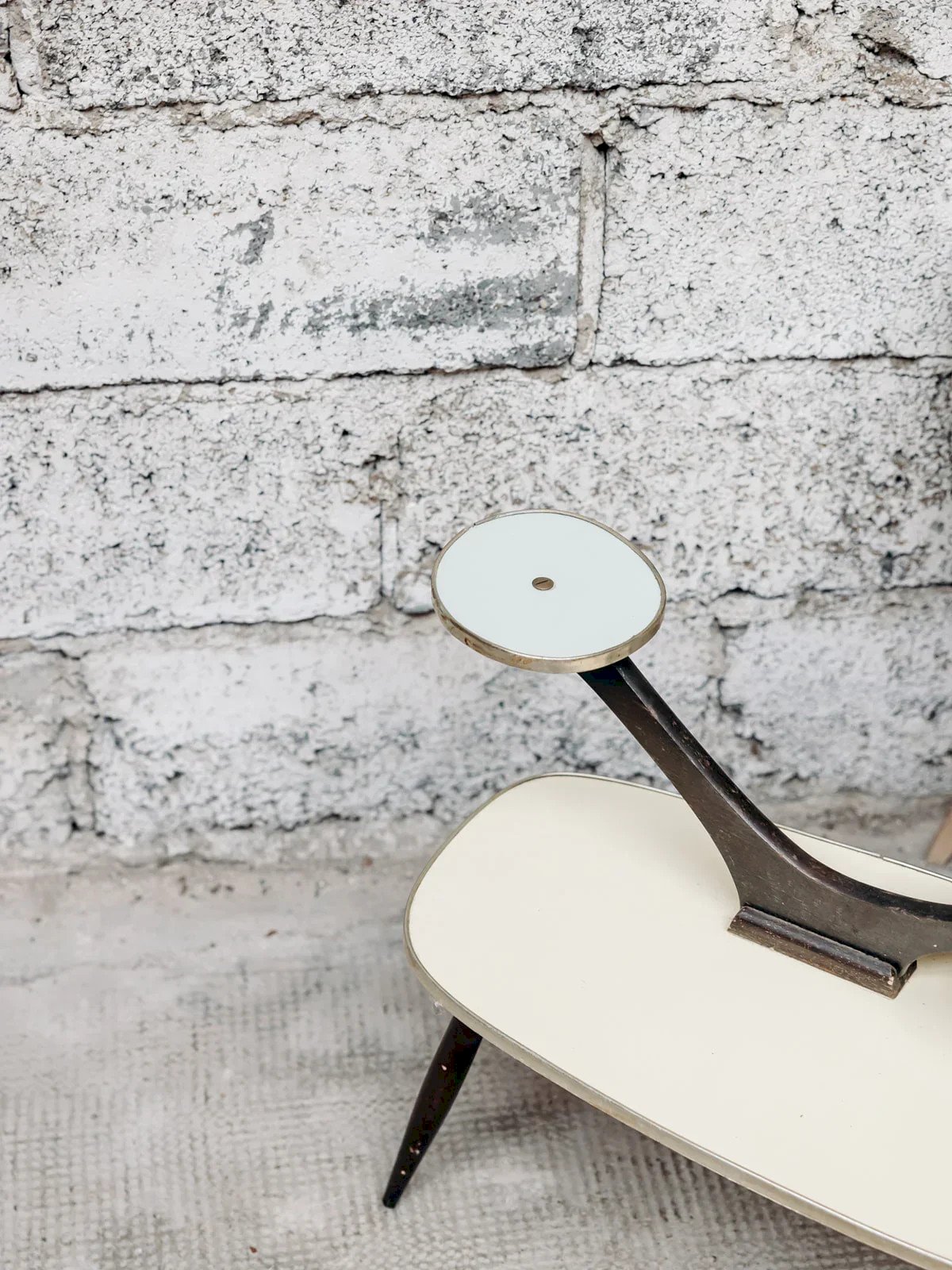 Add a retro touch to your interior with this small low plant stand that has a subtle charm. Its dark wood structure rests on slender tapered legs, creating an elegant and lightweight appearance. The yellow formica top provides a striking contrast with the dark wood, bringing a graphic and fresh touch. With perfectly sized dimensions, this plant stand is the ideal original piece to showcase your plants while decorating stylishly. Length: 60 cm Width: 32 cm Height: 46 cm Condition: Used: Item has been used. Item shows some superficial signs of wear... Used: Item has been used. Item shows some superficial signs of wear, fully operational and working properly. It may be a display model or an item returned to the store after a short period of use. Possible imperfections. Brand: Debongout Type: Vintage product Material: Wood, Brass, Metal Style: Countryside