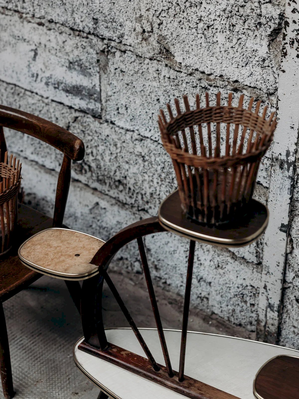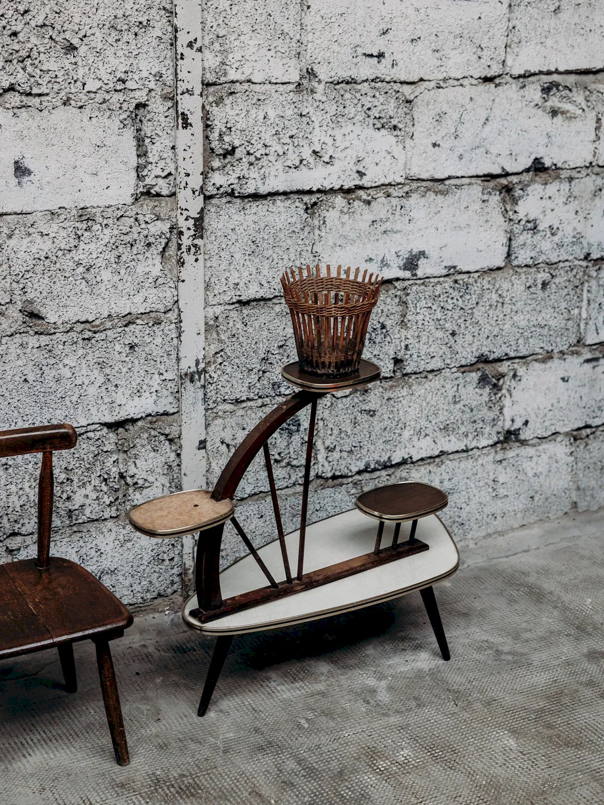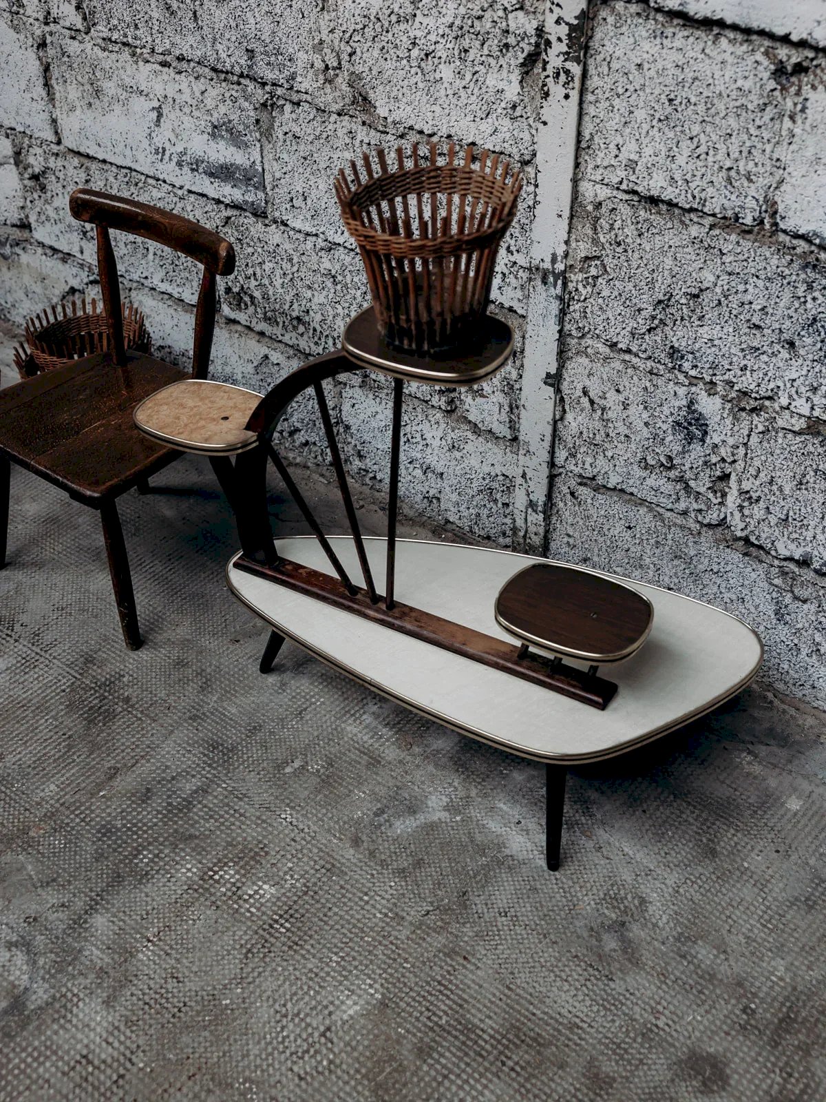 Bring a retro touch to your interior with this 1950s-style plant stand. It consists of a large cream white main tray, accompanied by three small formica supports: two brown and one orange. The tapered legs bring elegance and lightness to the whole. Ideal for showcasing your plants or decorative objects. A piece full of charm and vintage character. Dimensions of the plant stand: Length: 77 cm Height: 64 cm Depth: 36 cm Dimensions of a support: Length: 18 cm Depth: 15 cm Condition: Used: Item has been used. Item shows some signs of superficial wear,... Used: Item has been used. Item shows some signs of superficial wear, fully operational and functioning correctly. It may be a demonstration model or an item returned to the store after a short period of use. Any possible imperfections. Brand: Debongout Type: Vintage product Material: Wood, Formica Style: Country