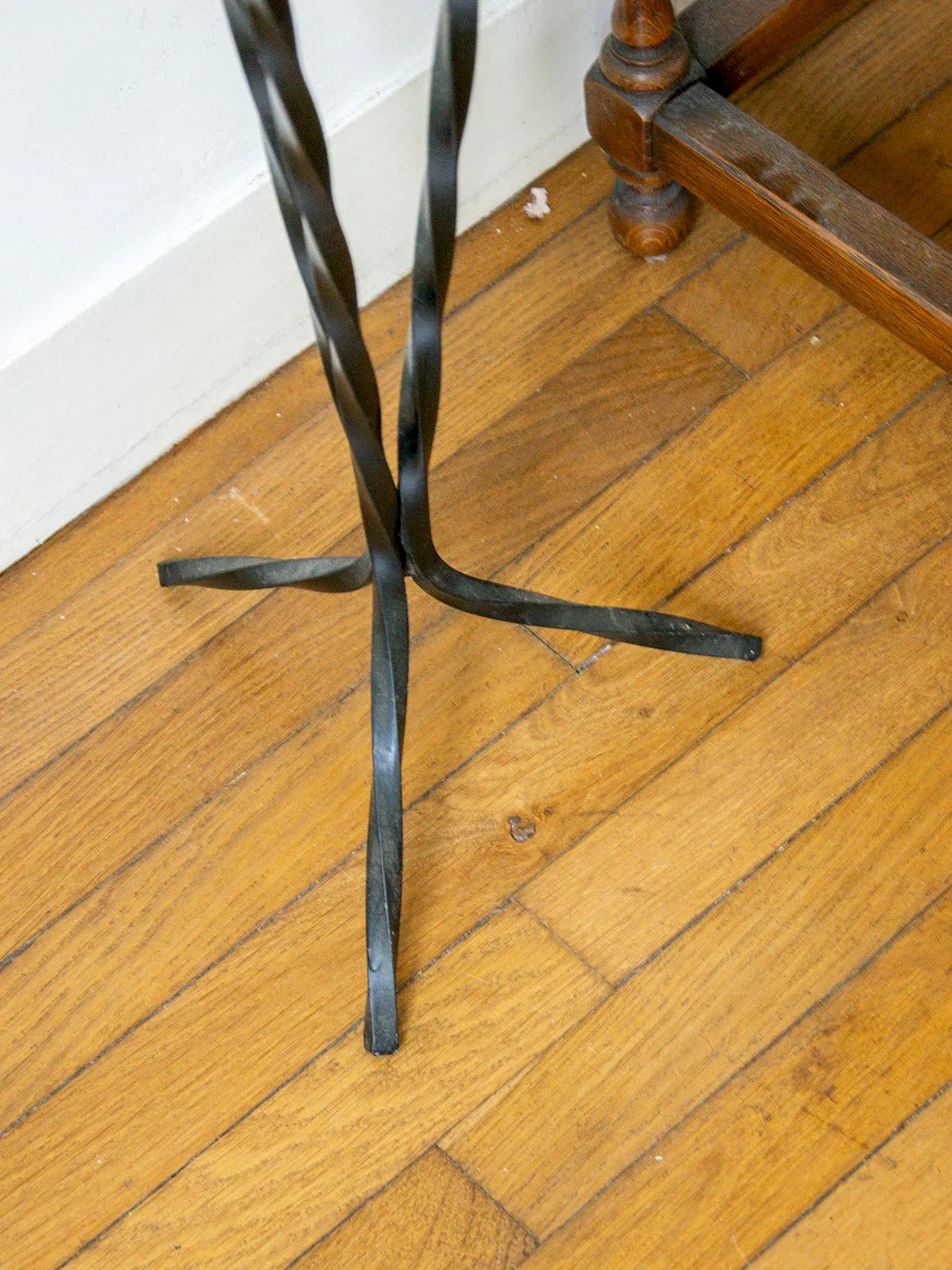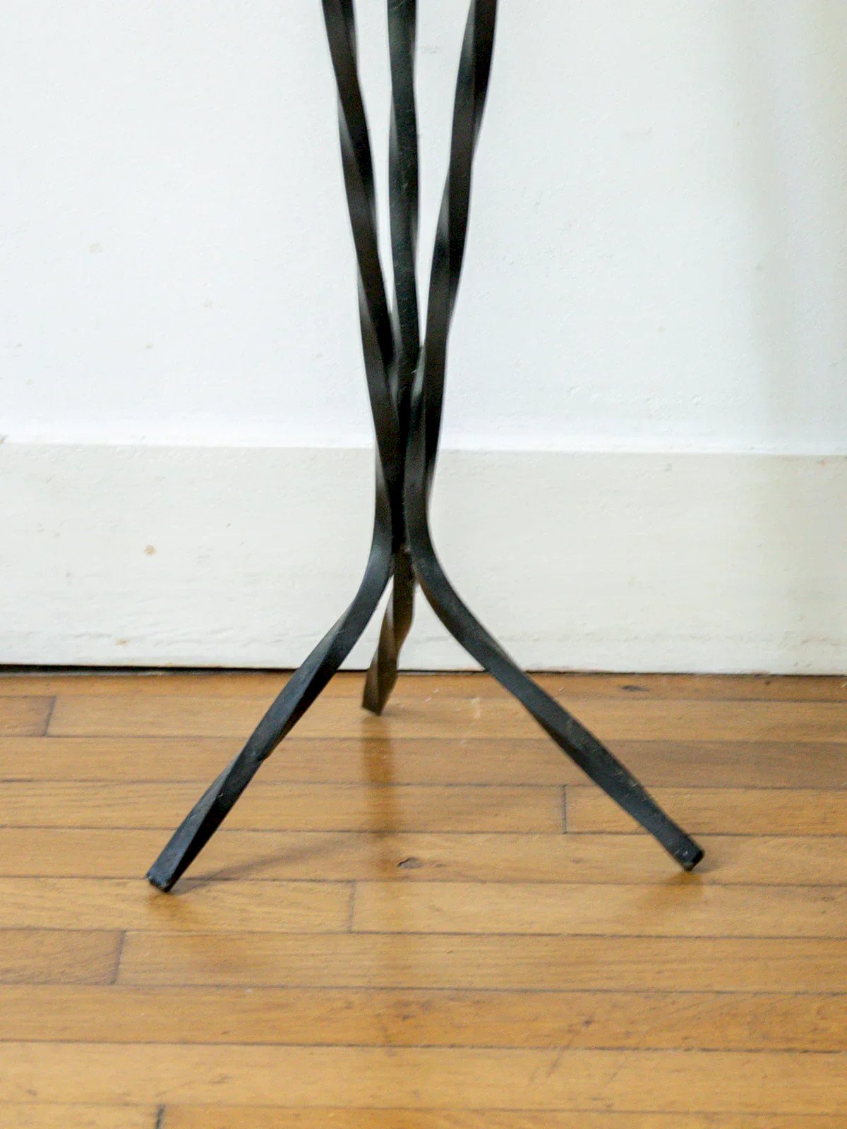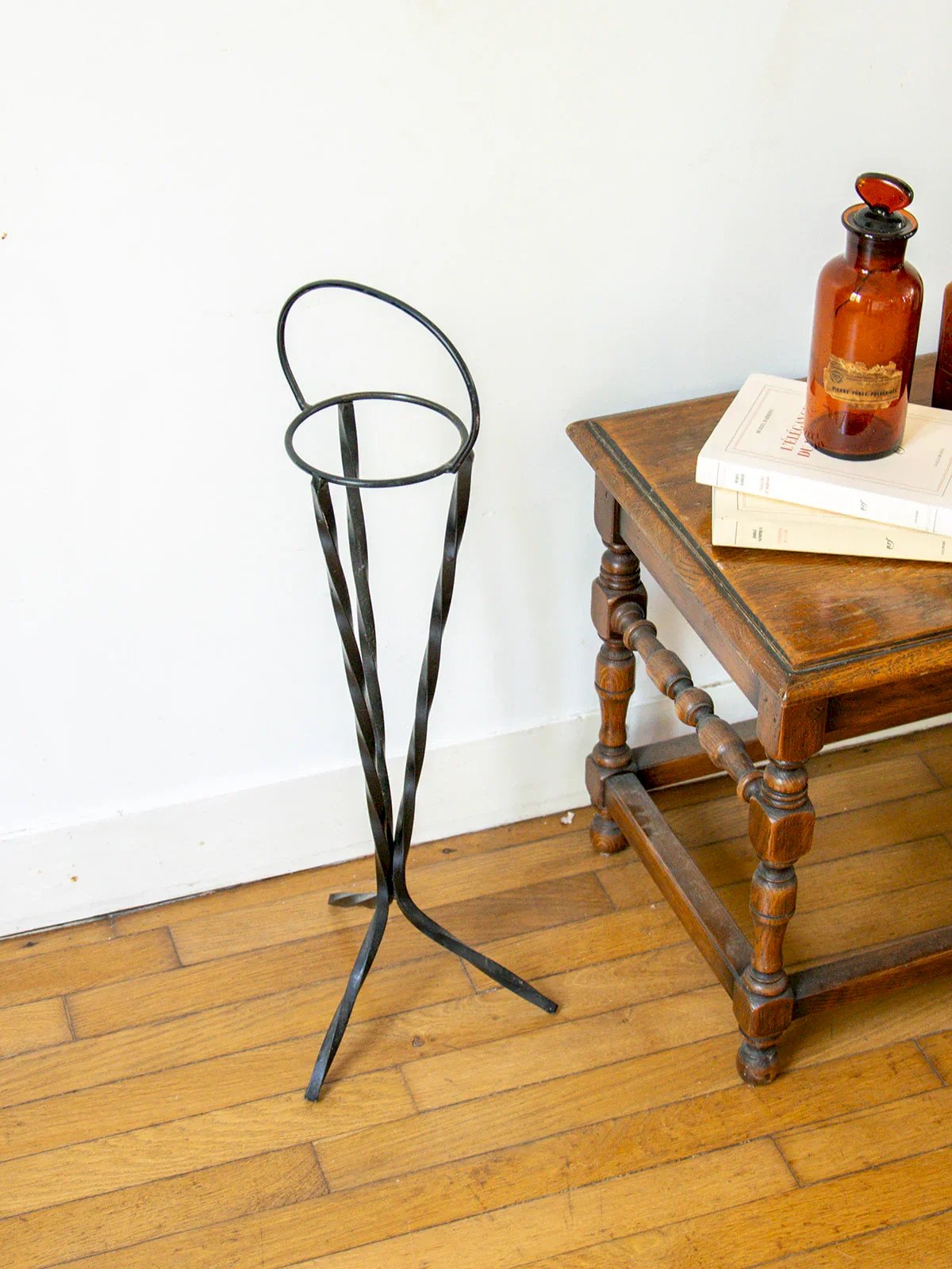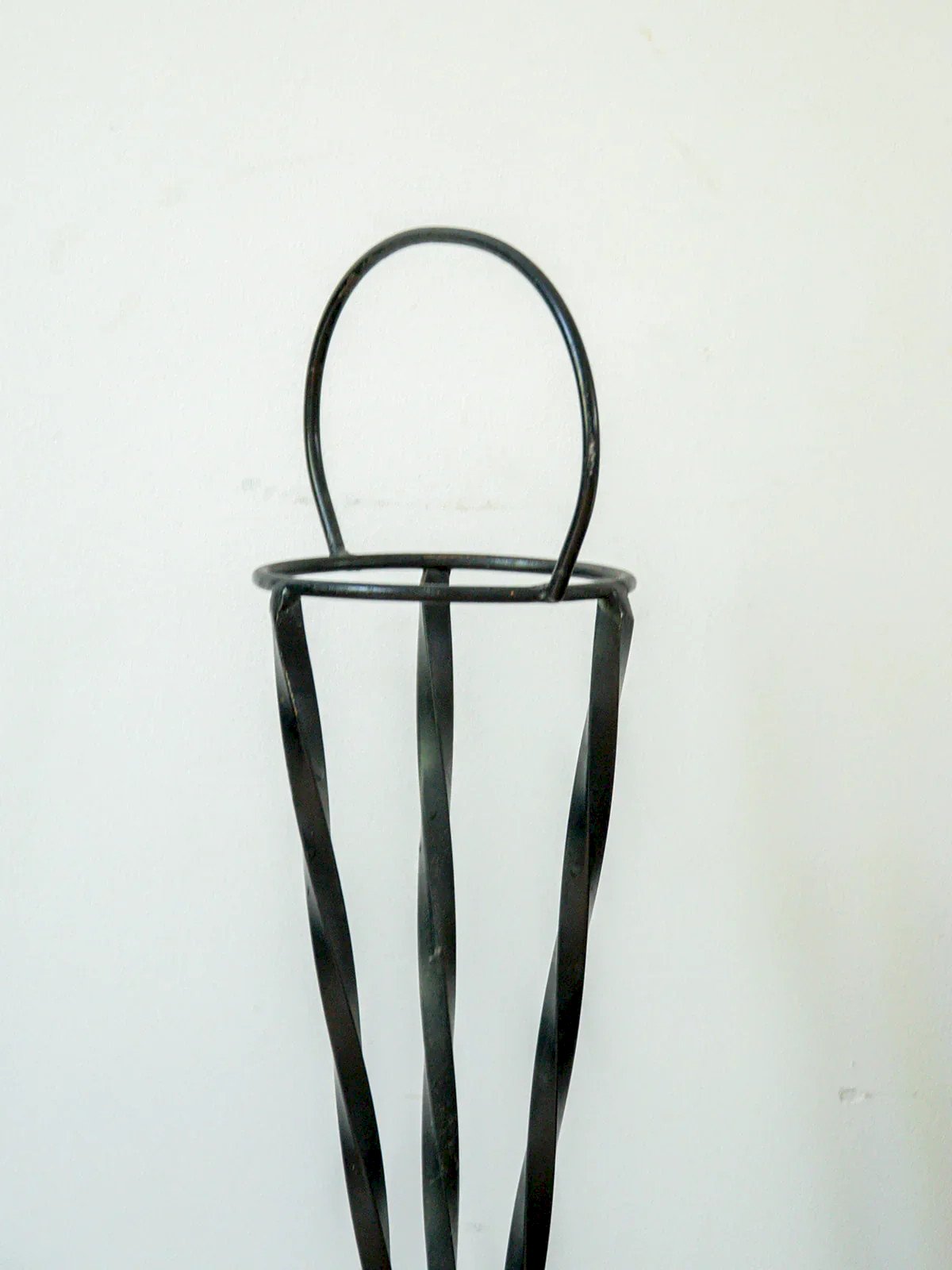 Add a vintage touch to your outdoor space with this black twisted metal plant stand. Its elegant and crafted design makes it a beautiful piece of garden furniture, which can also serve as an ashtray. Sturdy and in good condition, it combines practicality and aesthetics for your plants or small accessories. Its airy structure plays with light and easily fits into all styles of decor. A decorative and useful object to enhance your terrace, balcony, or garden. Height: 70 cm Diameter: 11.5 cm Condition: Used: Item has been used. Item shows some signs of superficial wear, fully operational and working properly. It may be a demonstration model or a returned item after a short period of use, with potential imperfections. Brand: Debongout Type: Curated product Material: Metal Style: Country.