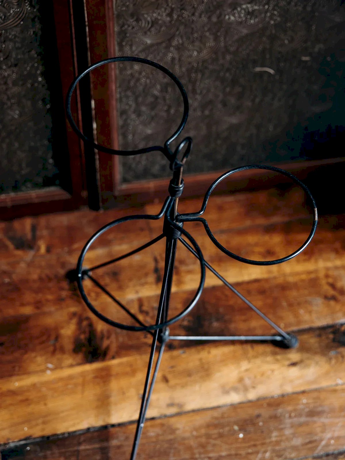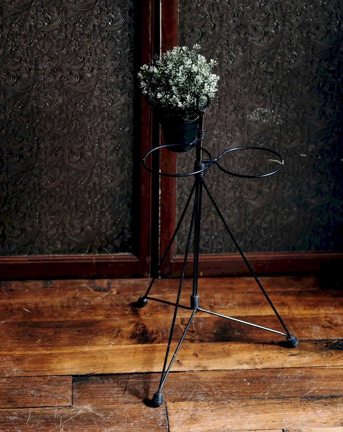 Add a vintage touch to your interior with this 1950s flower pot stand. Made of black metal and aged over time, it elegantly accommodates three pots, creating a green and stylish corner. This rack combines both functionality and aesthetics, perfect for enhancing your plants while adding character to your decor. Height: 61 cm Diameter: 42 cm Condition: Used: An item that has been used. Item showing some superficial wear marks, ... Used: An item that has been used. Item showing some superficial wear marks, fully operational and working correctly. It may be a demonstration model or an item returned to the store after a short period of use. any imperfections. Brand: Debongout Type: Thrifted Product Material: Metal Style: Country