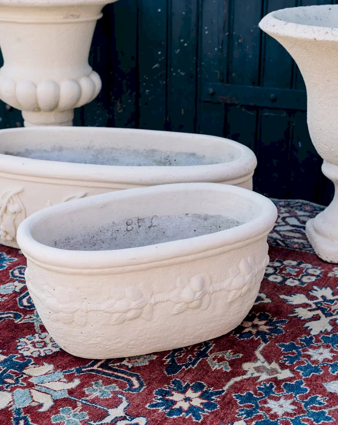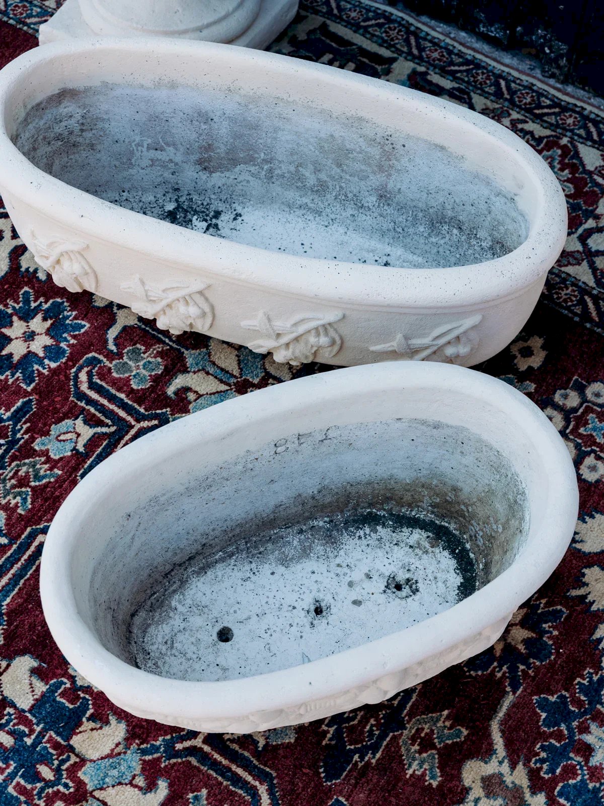 Discover this small white stone planter, perfect for elegantly hosting your plants. Its pretty reflective designs add a touch of delicacy and charm. Sturdy and timeless, it will easily find its place outdoors. Its compact size is suitable for both window sills and small terraces. A beautiful decorative item to showcase your greenery. Length: 49 cm Height: 24 cm Depth: 30 cm Condition: Used: Item has been used. Item shows some superficial wear marks, fully operational and working correctly. It may be a display model or an item returned to the store after a short period of use. Possible imperfections. Brand: Debongout Type: Thrifted product Material: Stone Style: Rustic