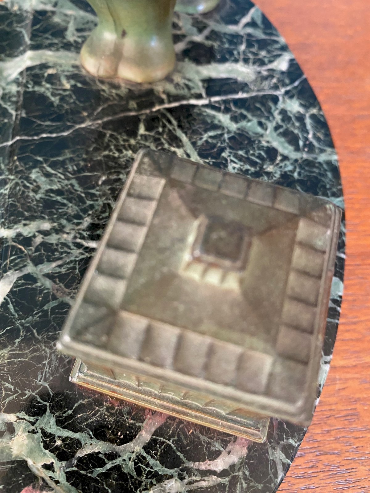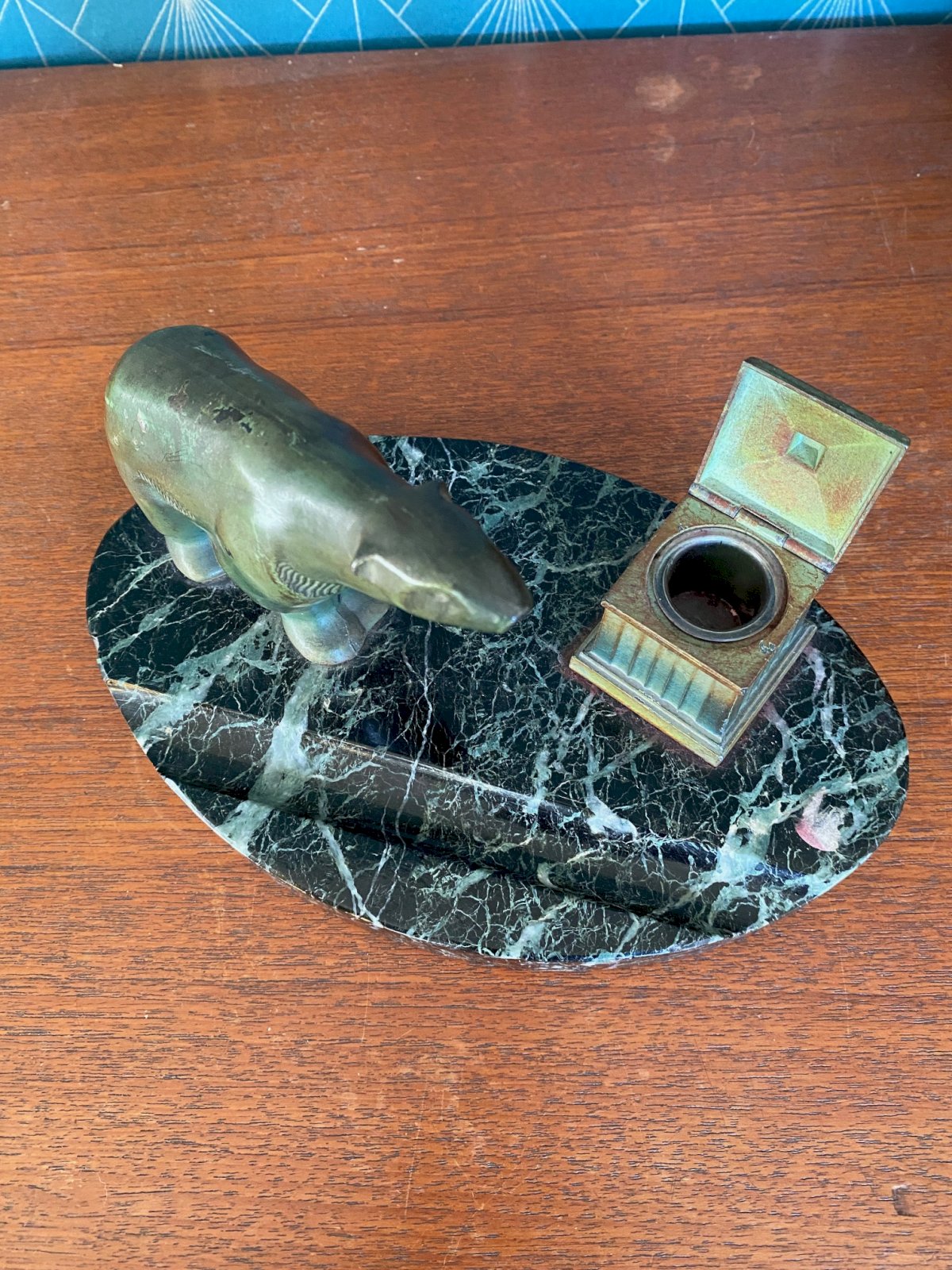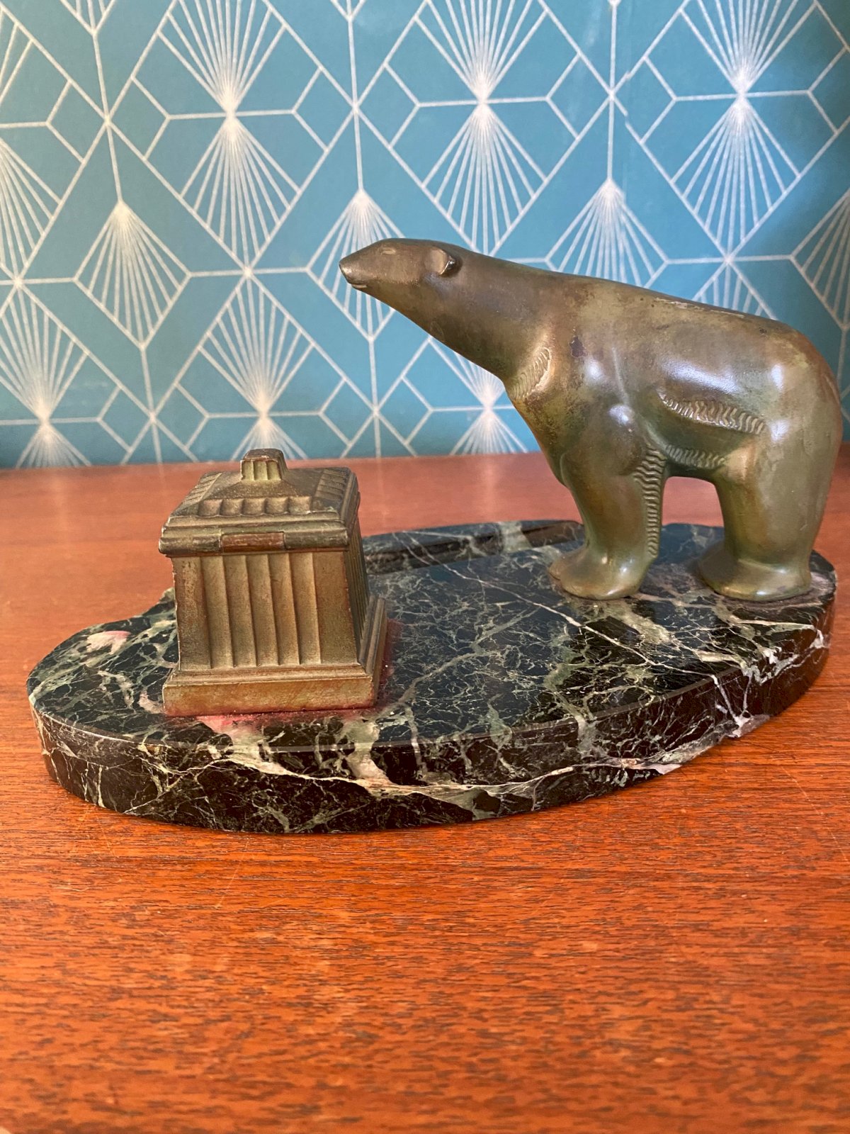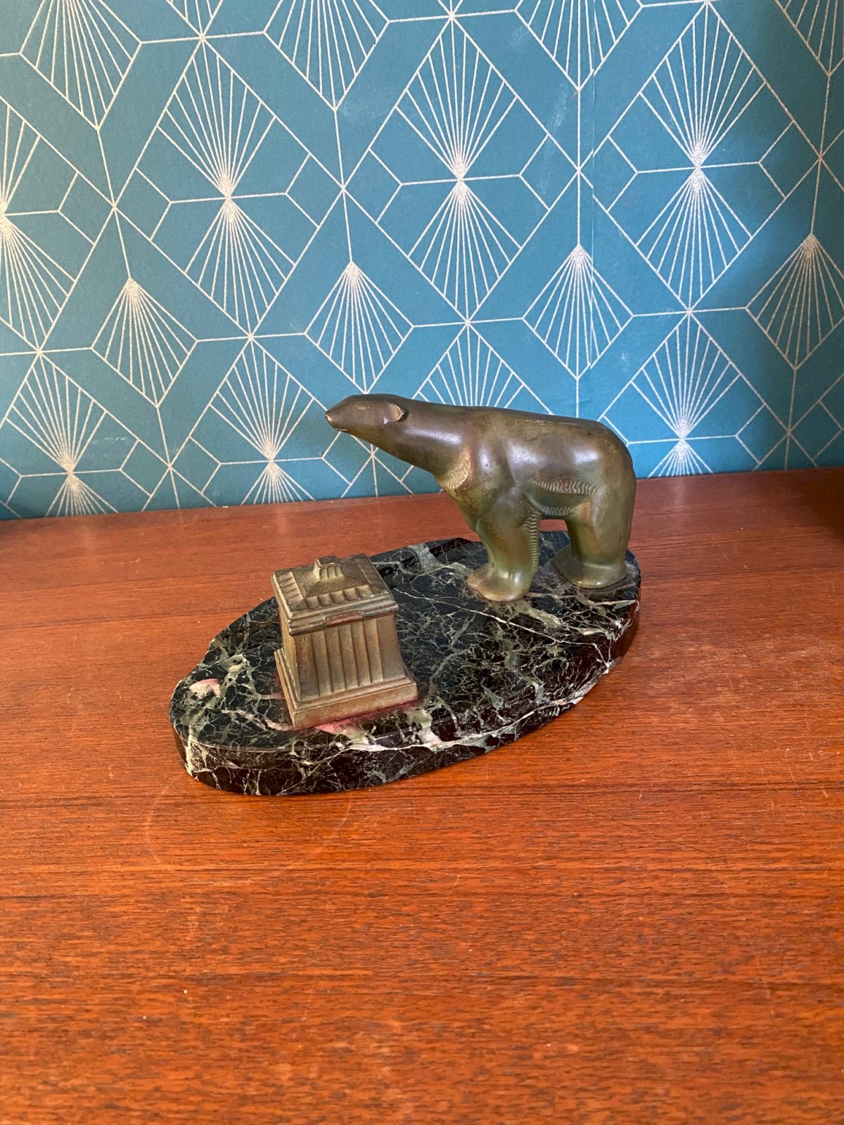 Patinated green regule inkwell representing a polar bear. Portor marble base. Superb. Art Deco period, around 1900. Height: 12 cm, length: 22 cm.