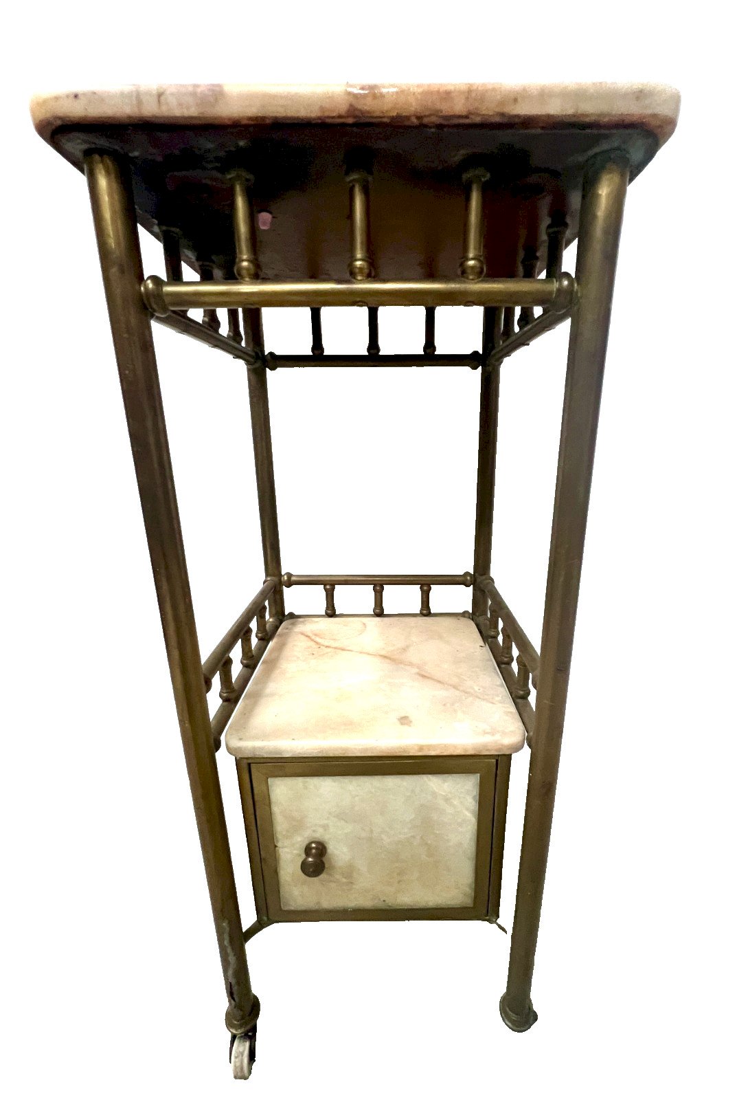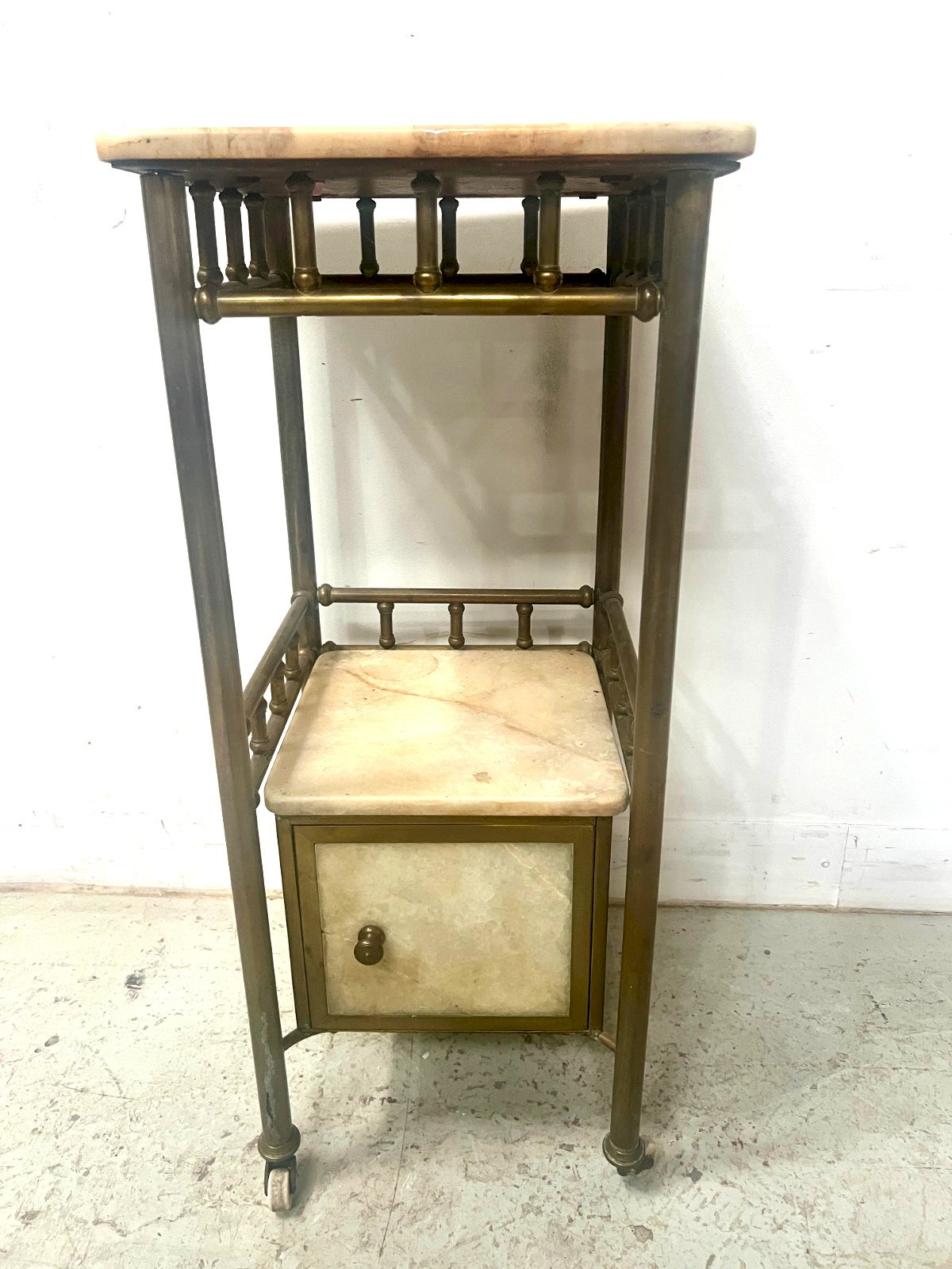 Brass and marble bedside table with four wheels joined by a marble storage box. Gallery with a brass baluster belt. Good condition. Dimensions: H 90 x W 40 x D 40 cm. Period: Early 20th century. Period: 20th-century design. Origin: France. Country of origin: France. Height: 90. Material: Metal. Length: 40. Width: 40.