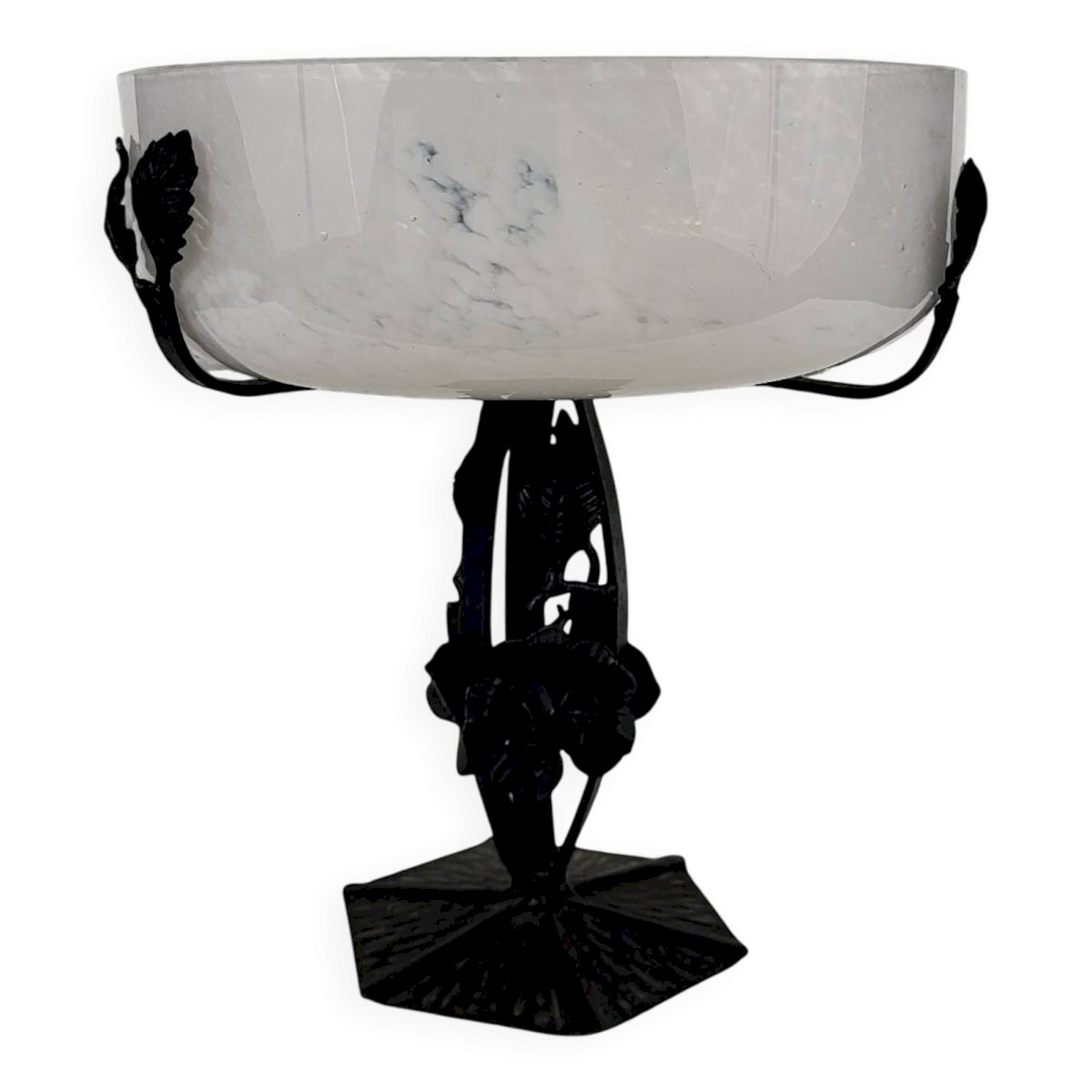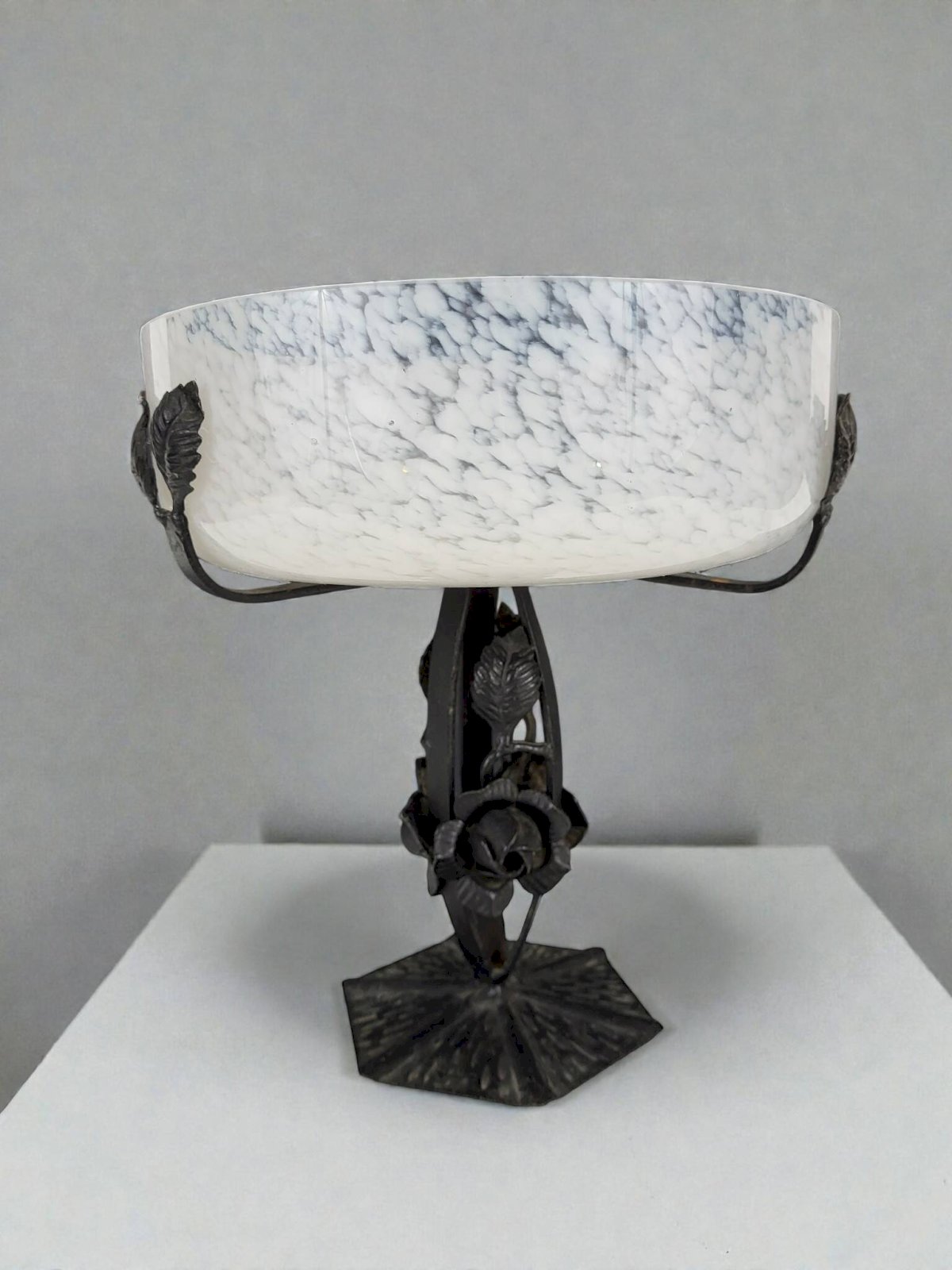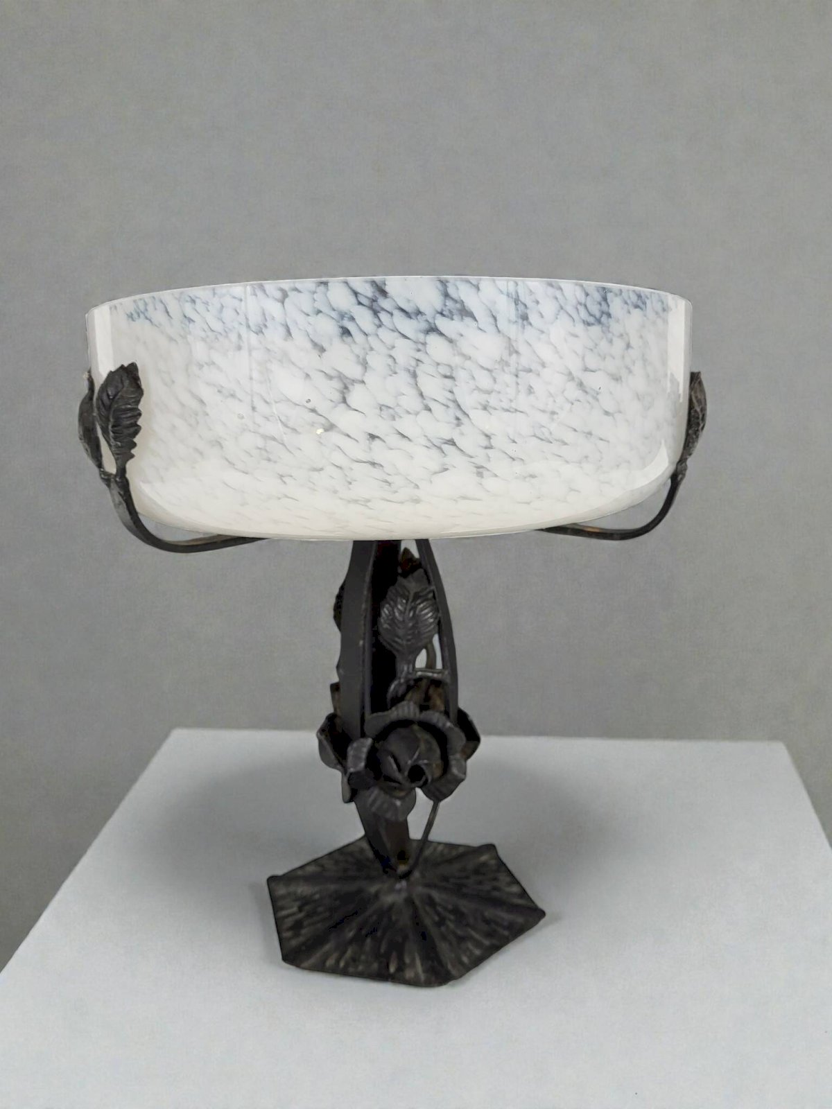 Fruit bowl / centerpiece. Made of wrought iron and marble glass. In good condition. It has a small chip on the neck (see second to last photo). Height 26.5 cm. Diameter of bowl 24 cm. L: 24 W: 24 H: 26.5