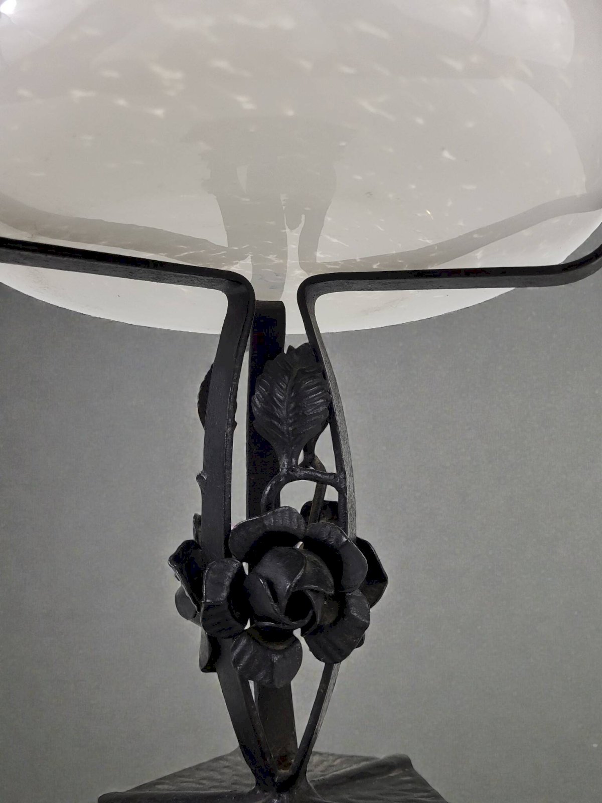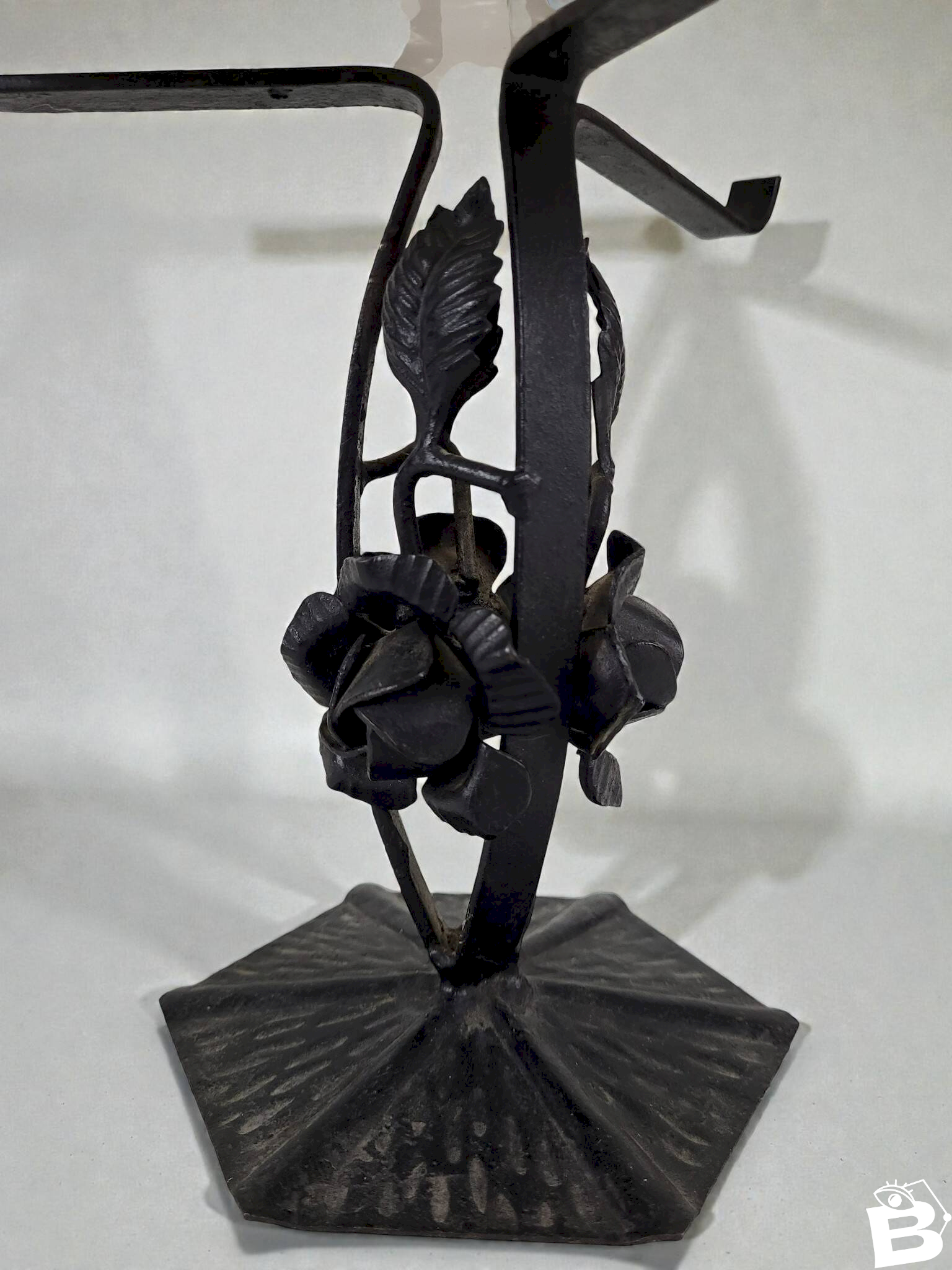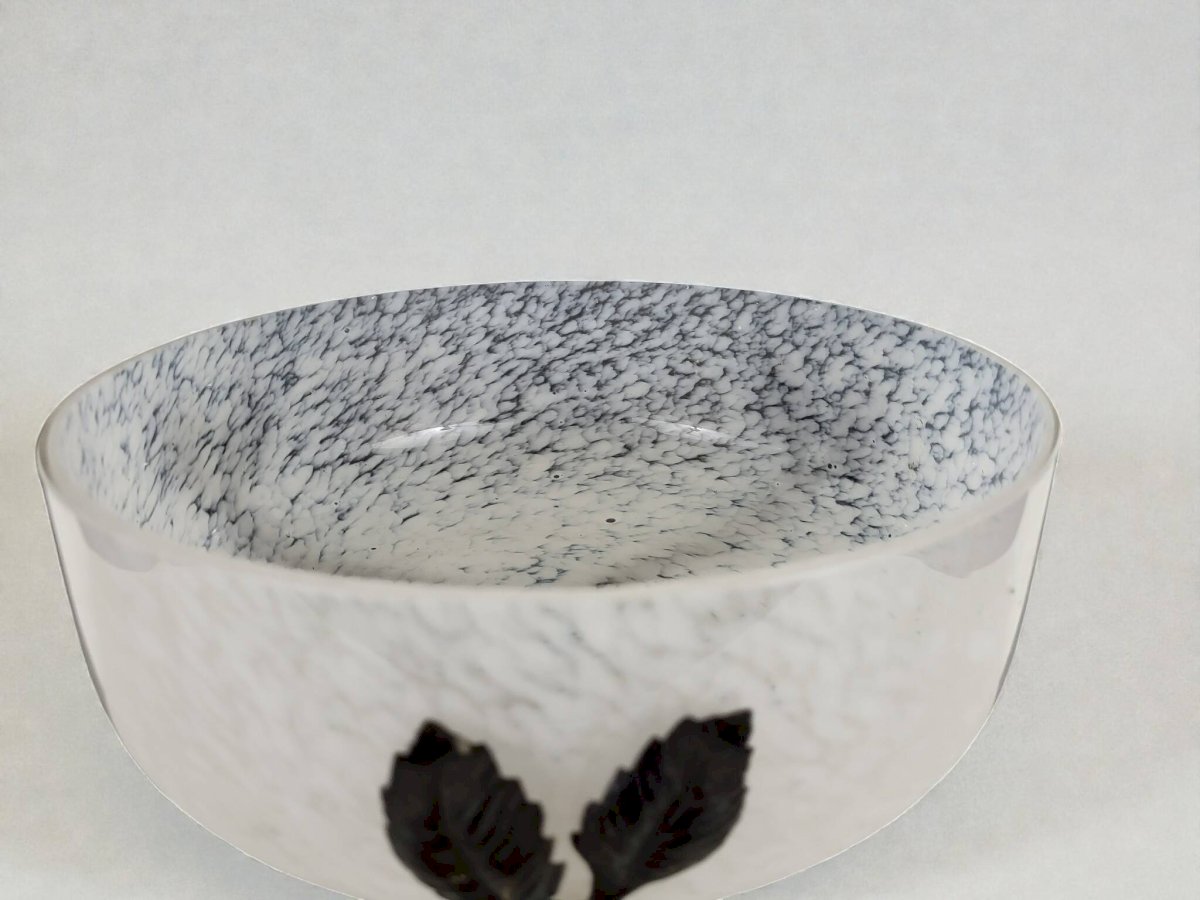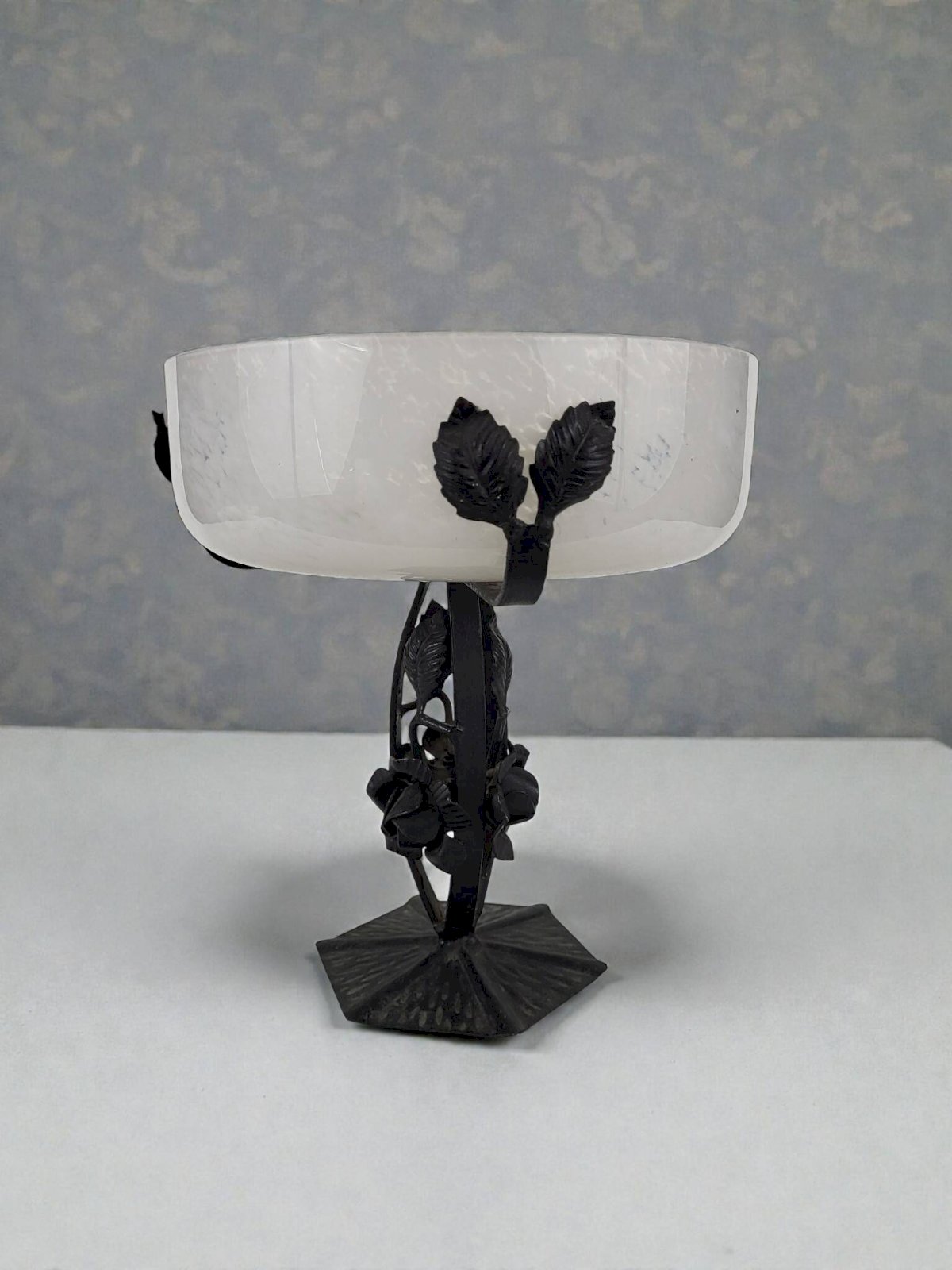 Fruit bowl / centerpiece. Made of wrought iron and marble glass. In good condition. It has a small chip on the neck (see second to last photo). Height 26.5 cm. Diameter of bowl 24 cm. L: 24 W: 24 H: 26.5