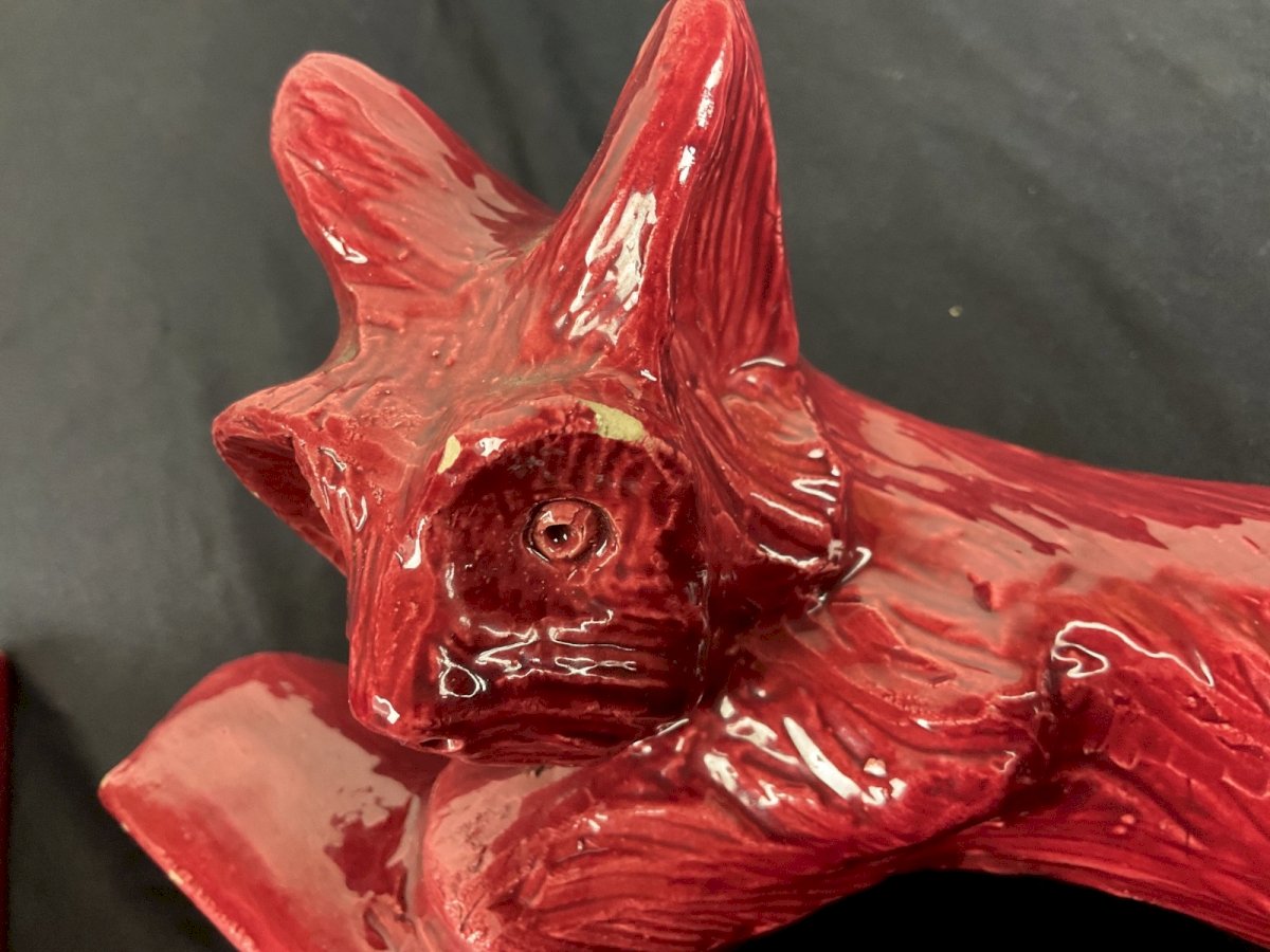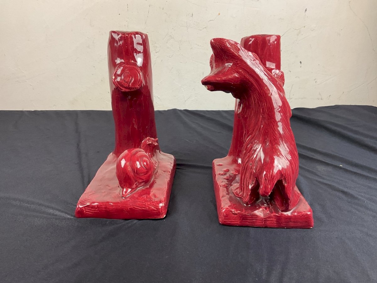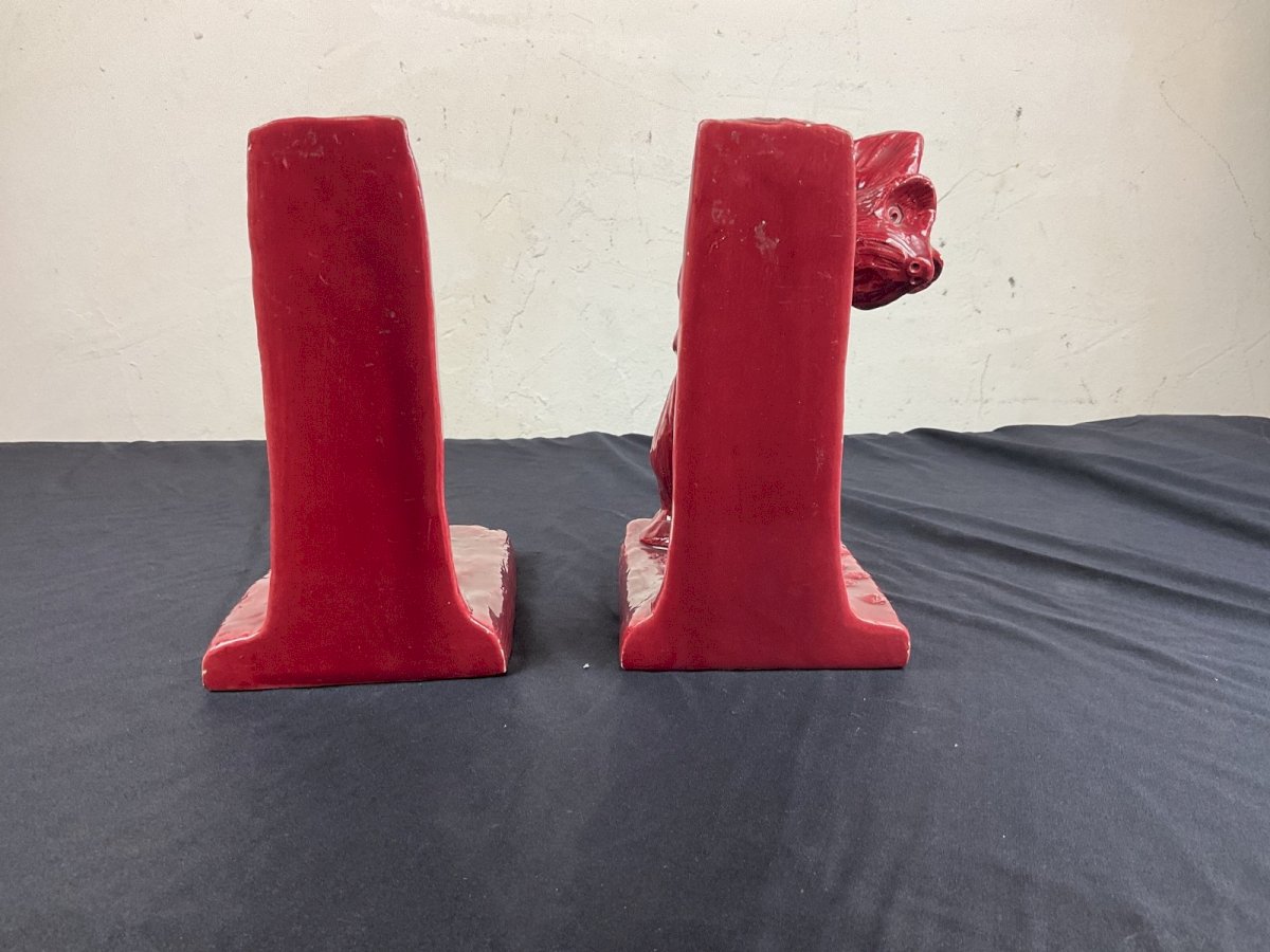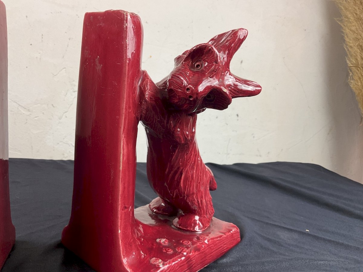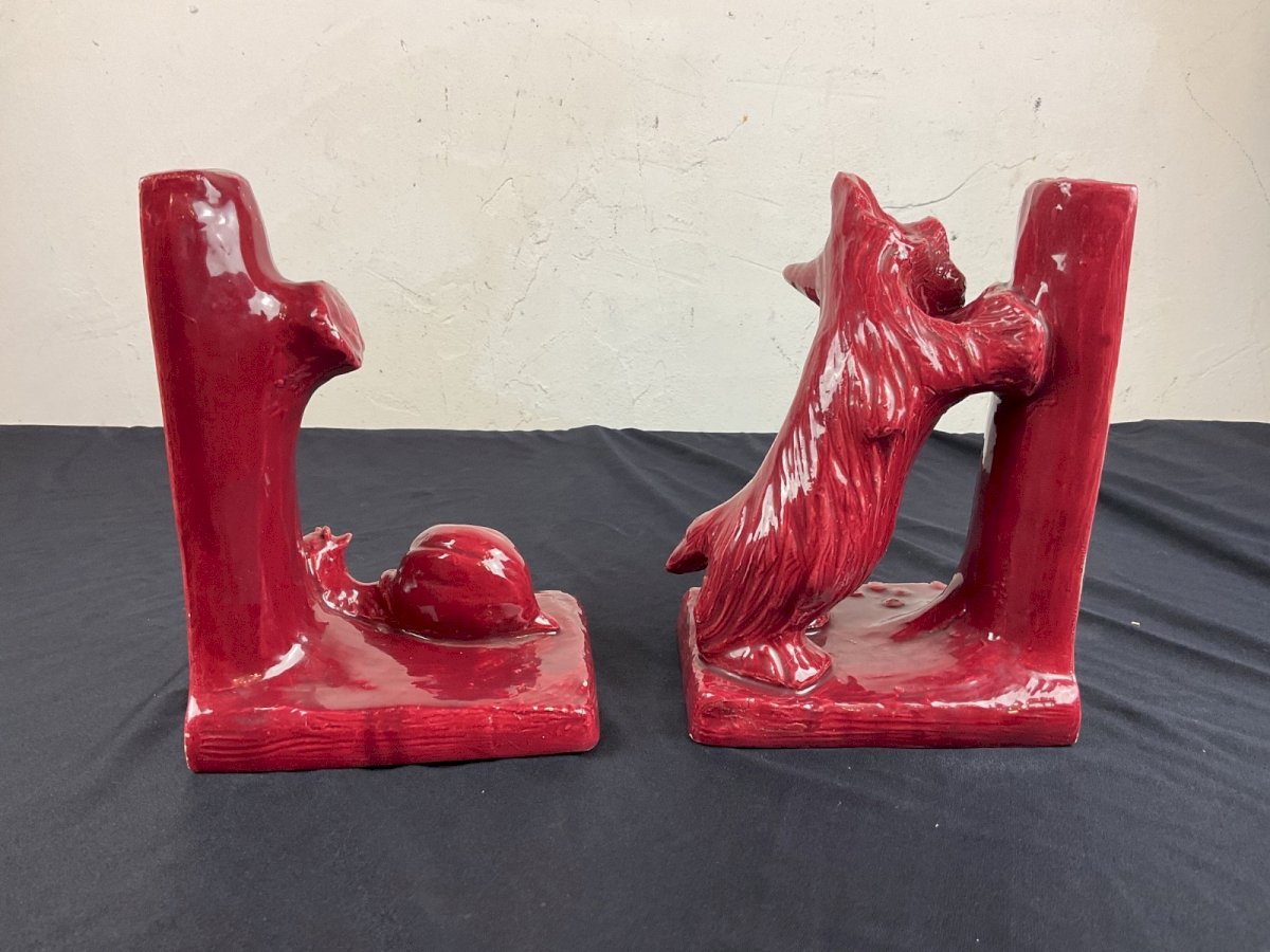 ceramic bookends ART DECO animalistic dog playing with a snail A few small chips of paint but nothing serious Height: 19 cm Authenticity: Original Type: Display object, Decorative Period: Art Deco Origin: France Sub-type: bookends Material: Ceramic