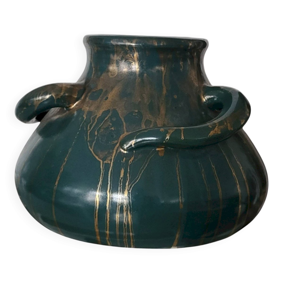 Important stoneware vase by Léon Pointu (1879-1942), Puisaye. Piece from the 1920s - Art Deco. Glazed stoneware with gold drippings. Height 18 cm. Diameter 25 cm. Weight 2.1 kg. L: 25 W: 25 H: 18