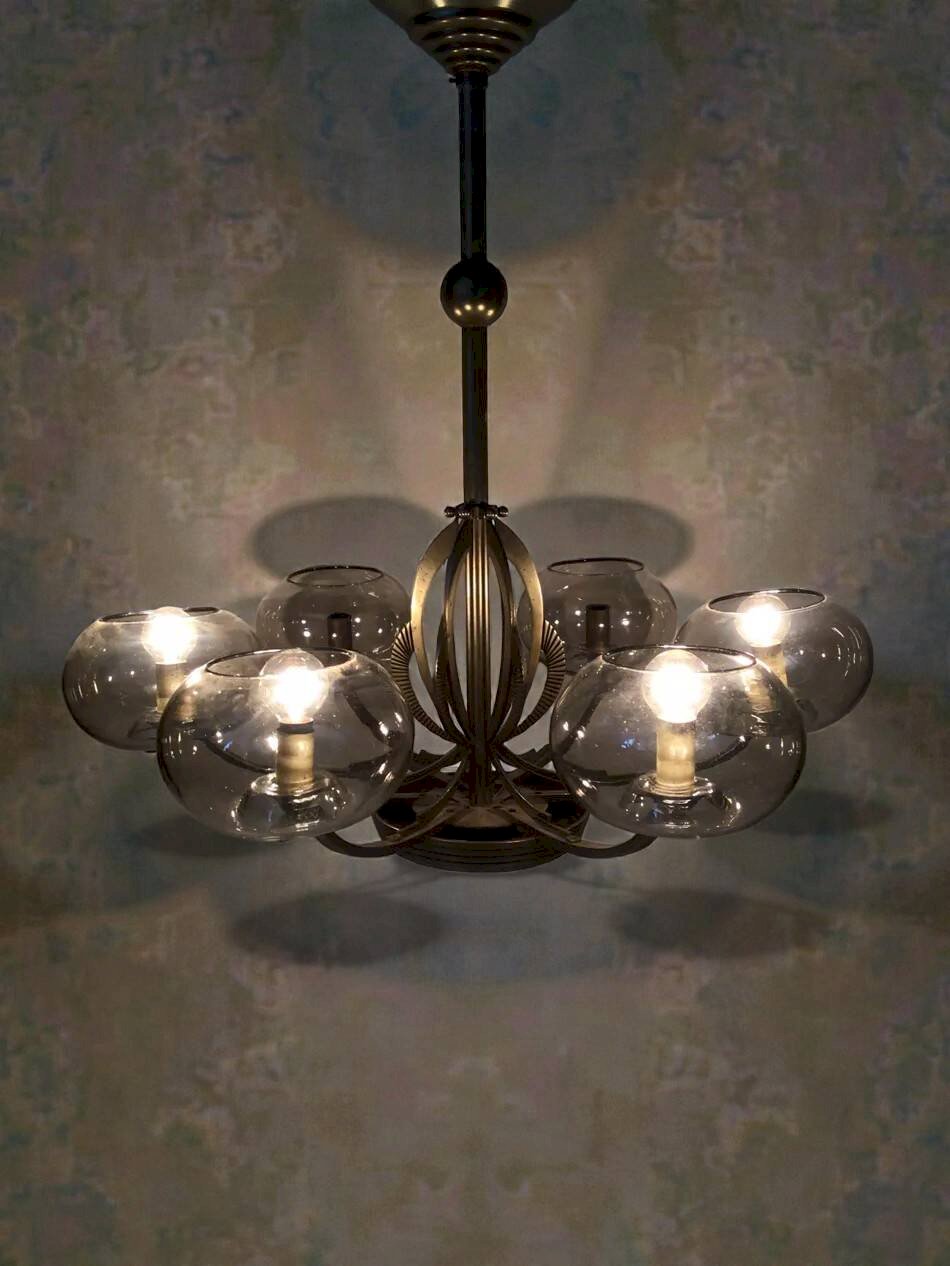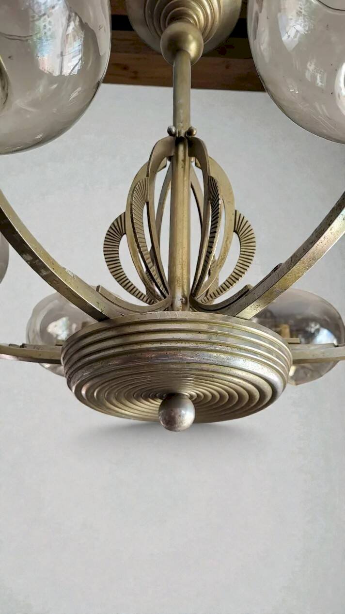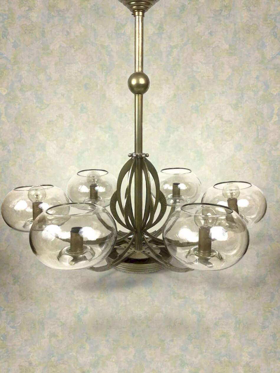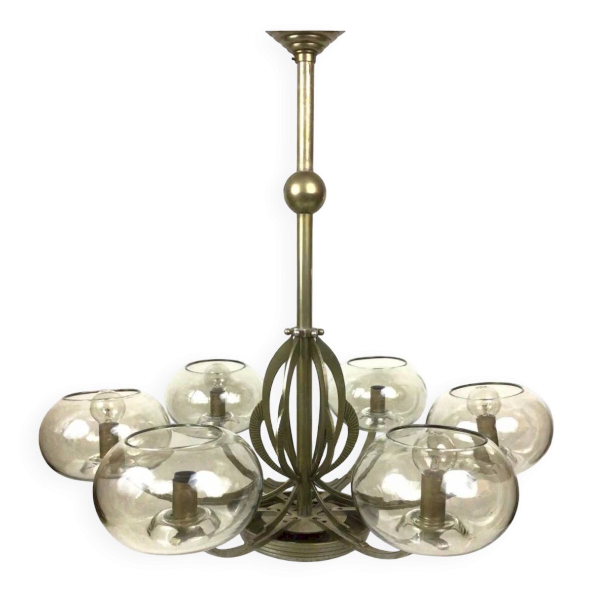 Art deco chandelier in silvered and gold patina metal and stained glass. Height 72 cm. Diameter 66 cm. In good condition with usual signs of use. L: 66 W: 66 H: 72