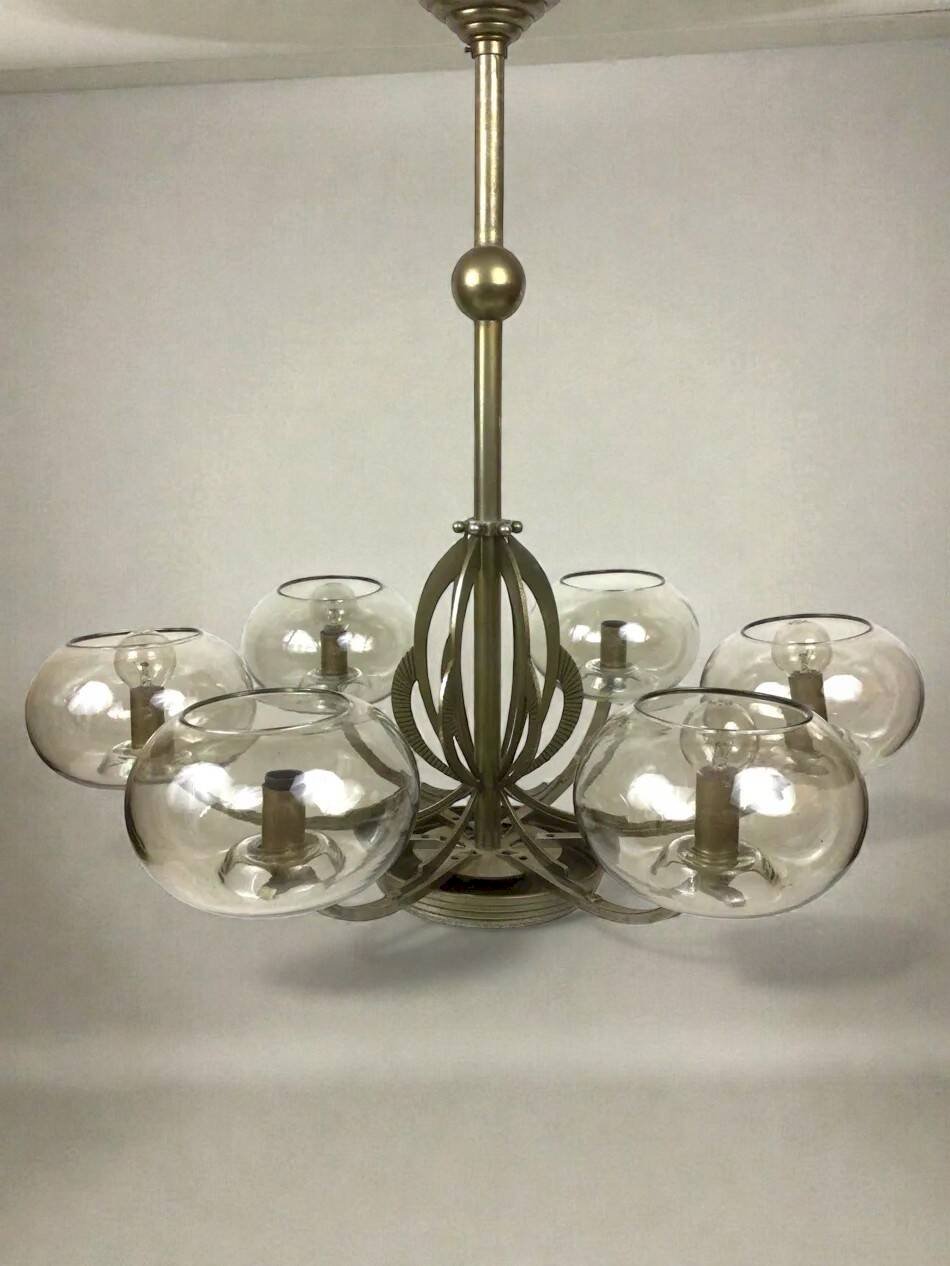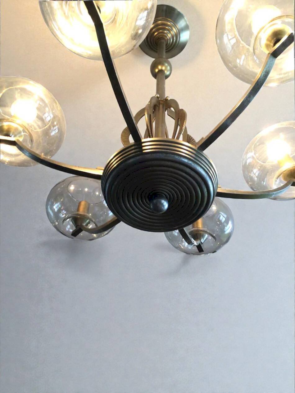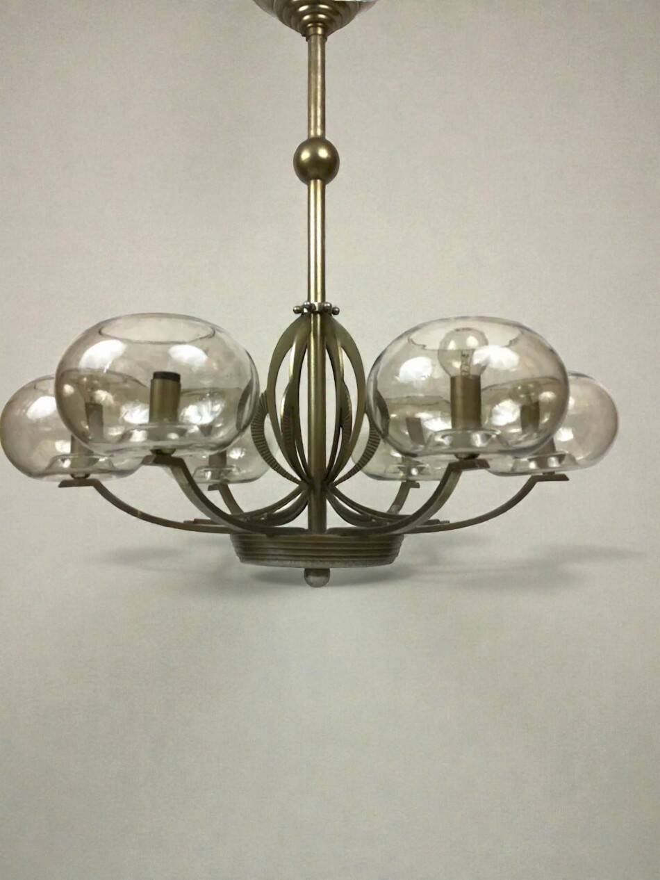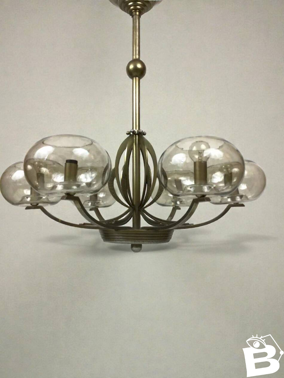 Art deco chandelier in silvered and gold patina metal and stained glass. Height 72 cm. Diameter 66 cm. In good condition with usual signs of use. L: 66 W: 66 H: 72