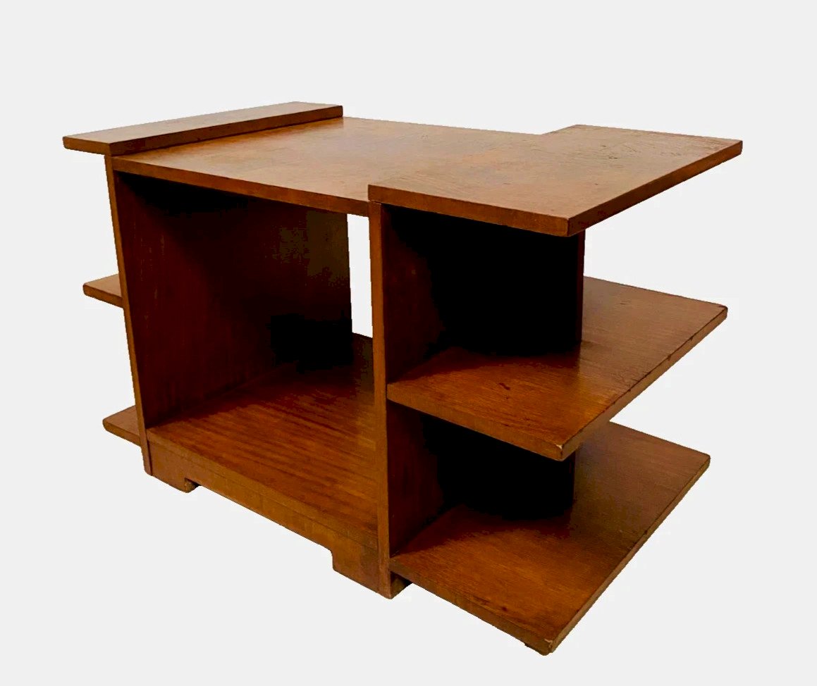 Architectural style coffee table made of mahogany and veneer. Two-tier structure with storage shelves. Good condition. Dimensions H 65 x L 104 x W 60 cm. Art Deco period. Type: Table. Period: Art Deco. Subtype: Console. Height: 65. Material: Mahogany. Length: 104. Width: 60. Shape: Rectangular.