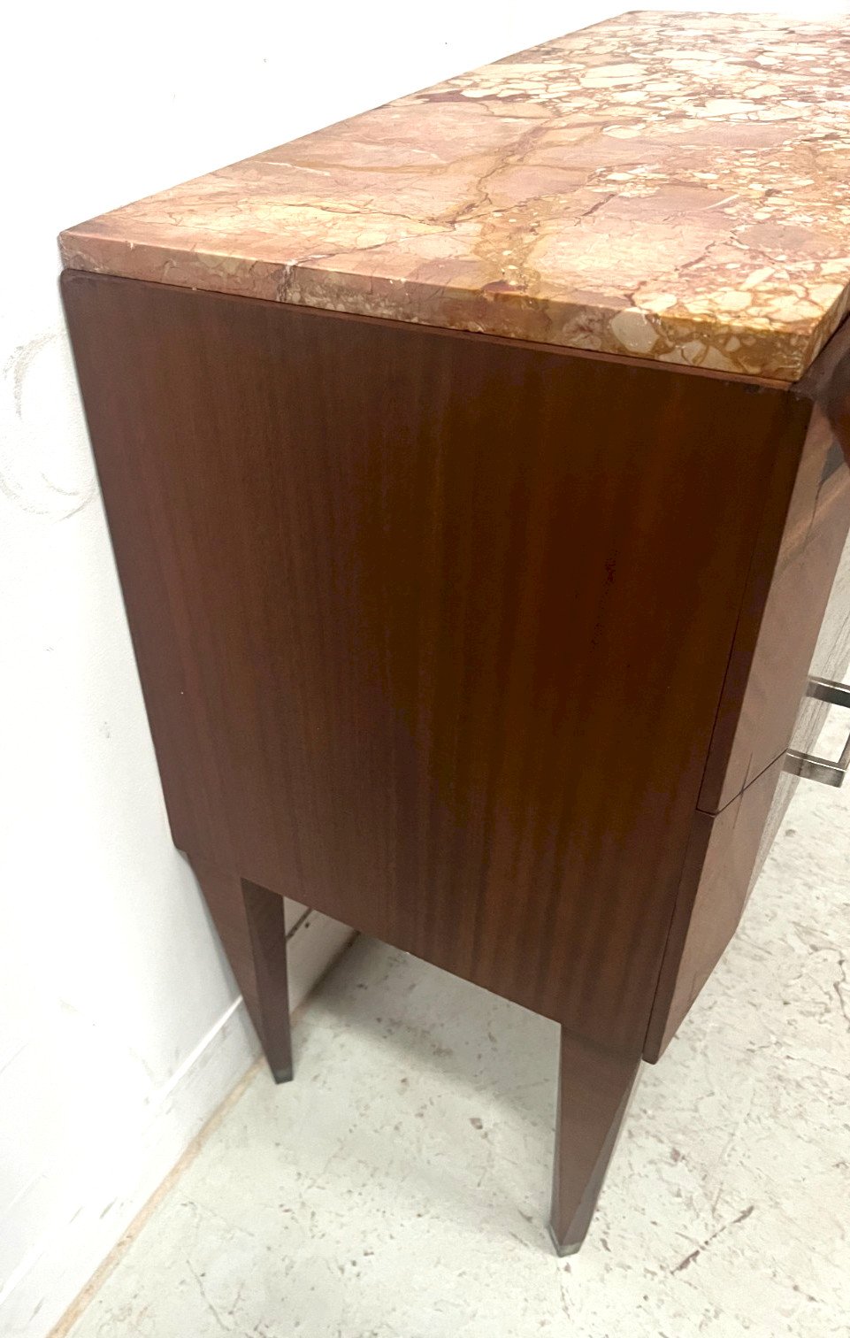 Art Deco commode with cut corners in mahogany veneer Two front drawers without a crossbar Four legs with bronze sabot Feet Silver metal handles and lock entries Top with breccia marble Former restorations, see photos Dimensions H 92 x W 98 x D 43 cm Art Deco period Type: Commode, Chest of drawers Period: Art Deco Origin: France Height: 92 Material: Mahogany Length: 98 Width: 43