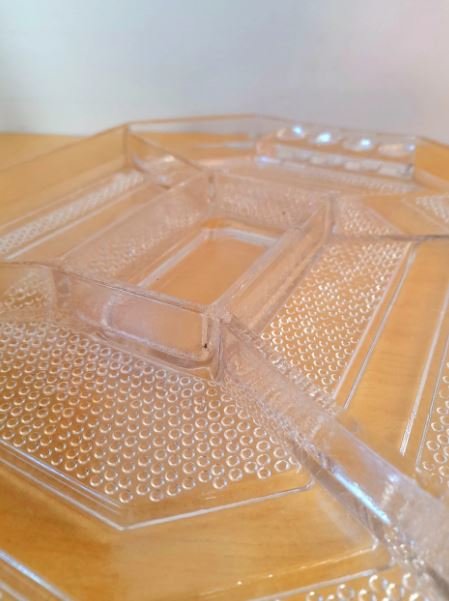 This transparent glass appetizer platter embodies the elegance of Art Deco. Perfect for your receptions, it features a sophisticated geometric design that will enhance your table. Its transparency showcases your appetizers with style. Perfect condition.