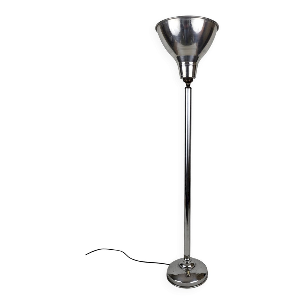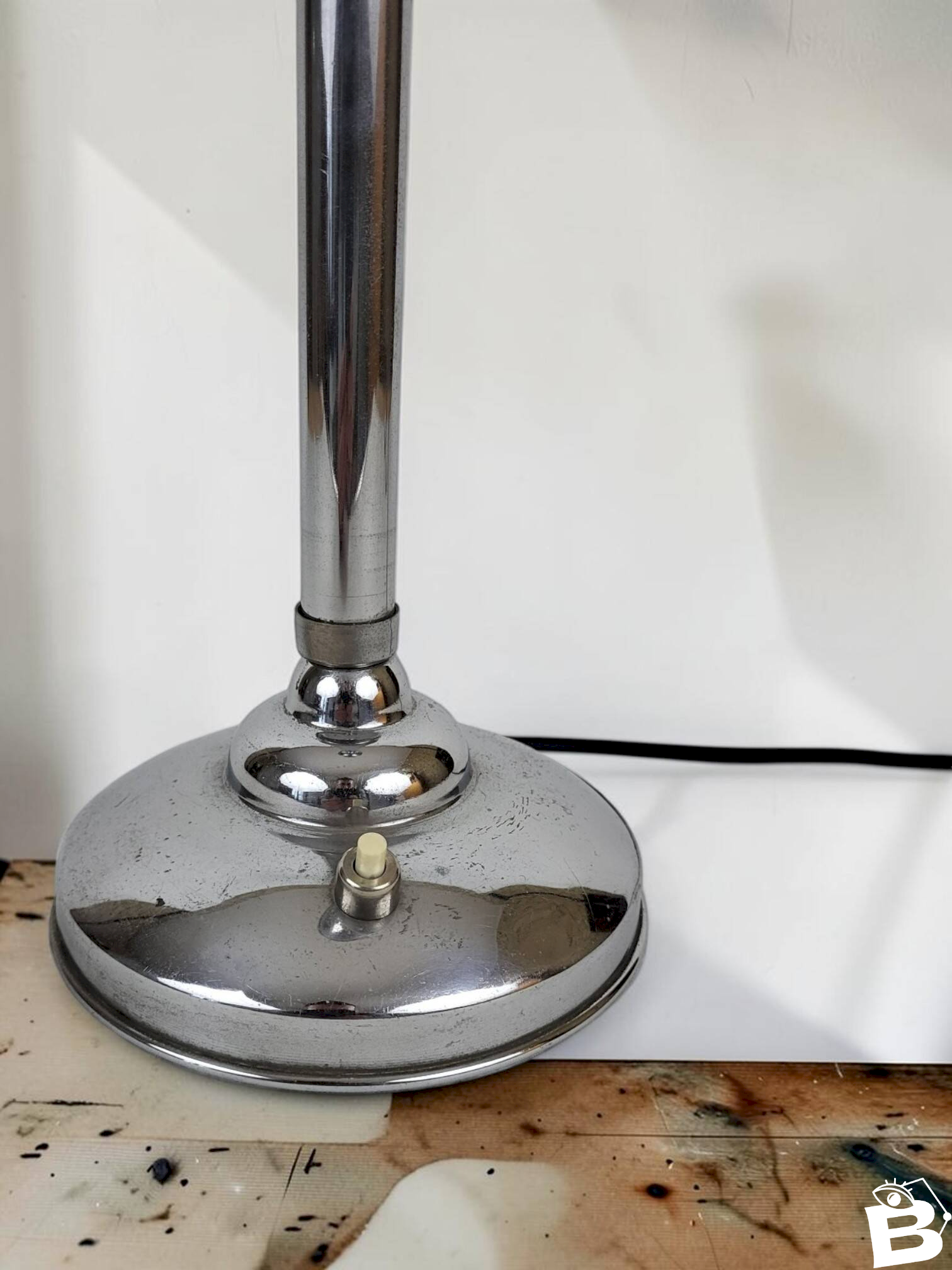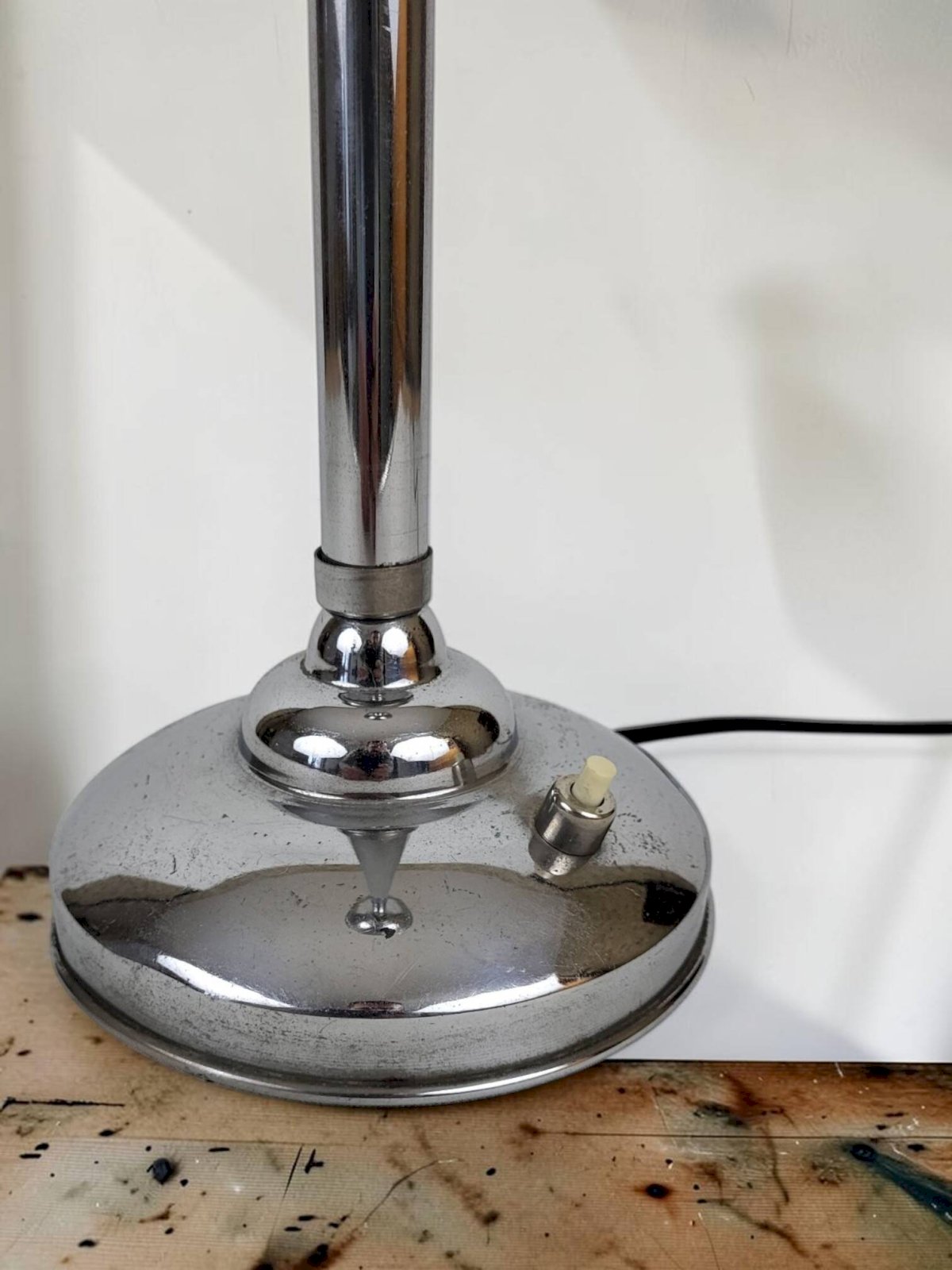 Large Art Deco lamp made of chrome metal from the 1930s. Chrome metal and Bakelite switch. Original electricity. Rotating/inclining reflector (the mechanism works perfectly). Note the signs of use and age (2 small dents on the base). Height 77 cm. Reflector diameter 17.5 cm. L: 17 W: 17 H: 77.