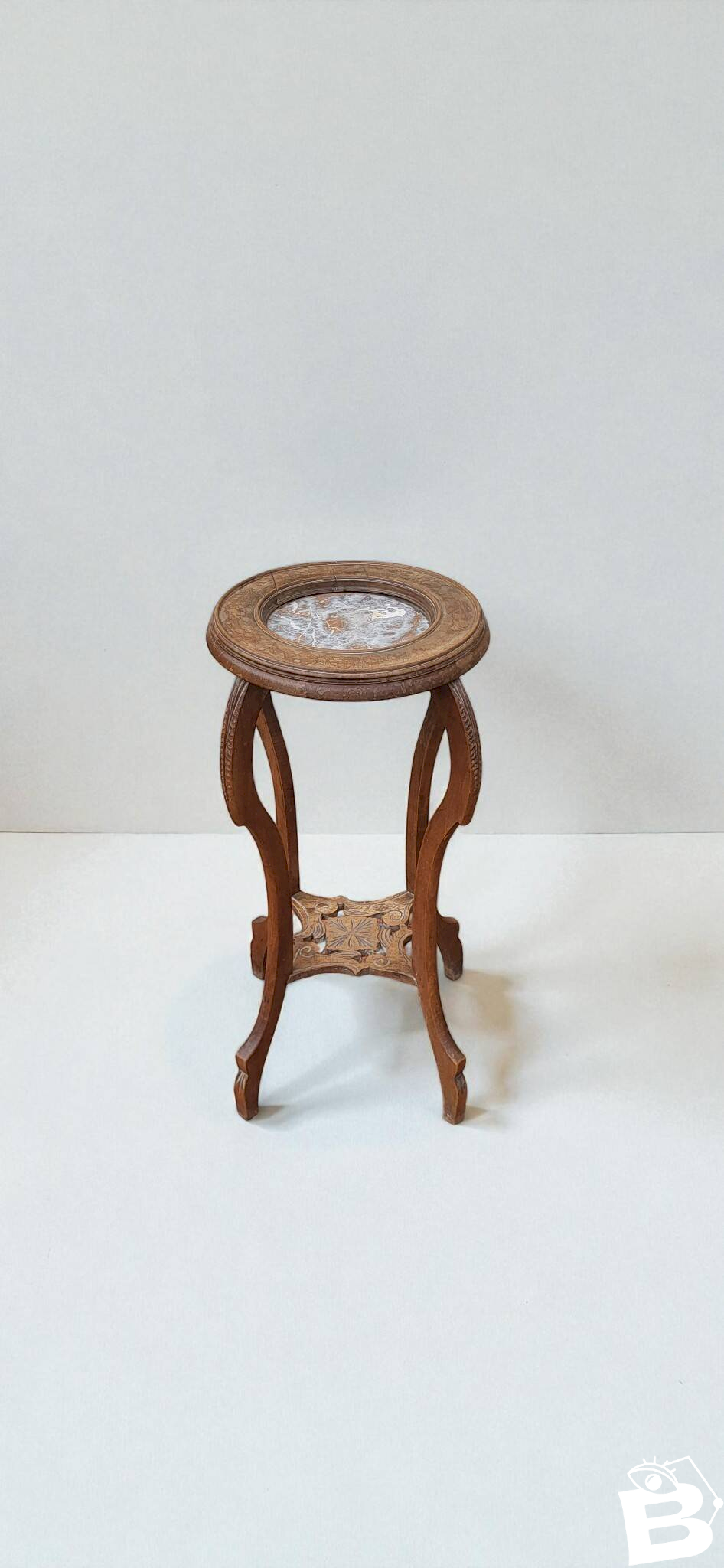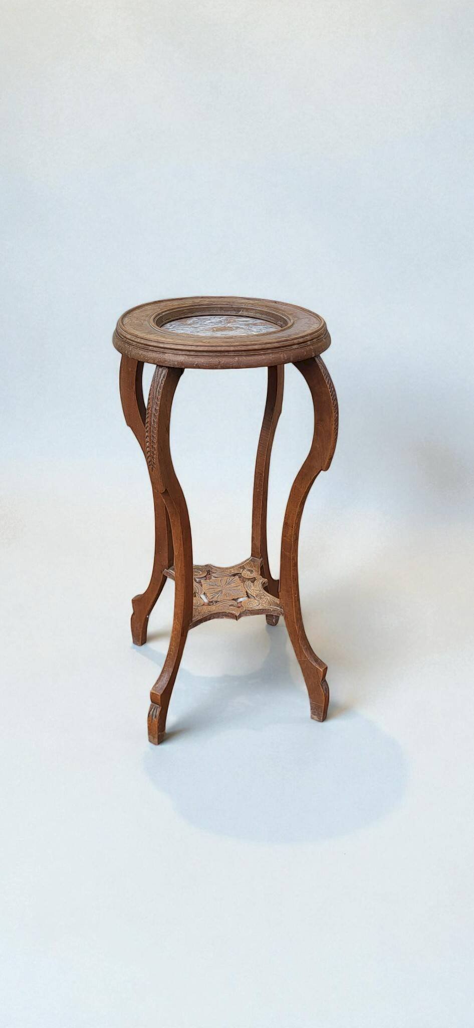 Wood / marble Art Deco pedestal. Height 72 cm. Height of lower shelf 21 cm. Diameter of shelf 35 cm. Footprint 34 cm. In good condition with minimal signs of use and age.