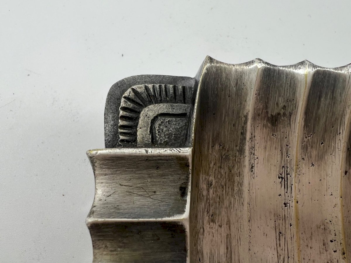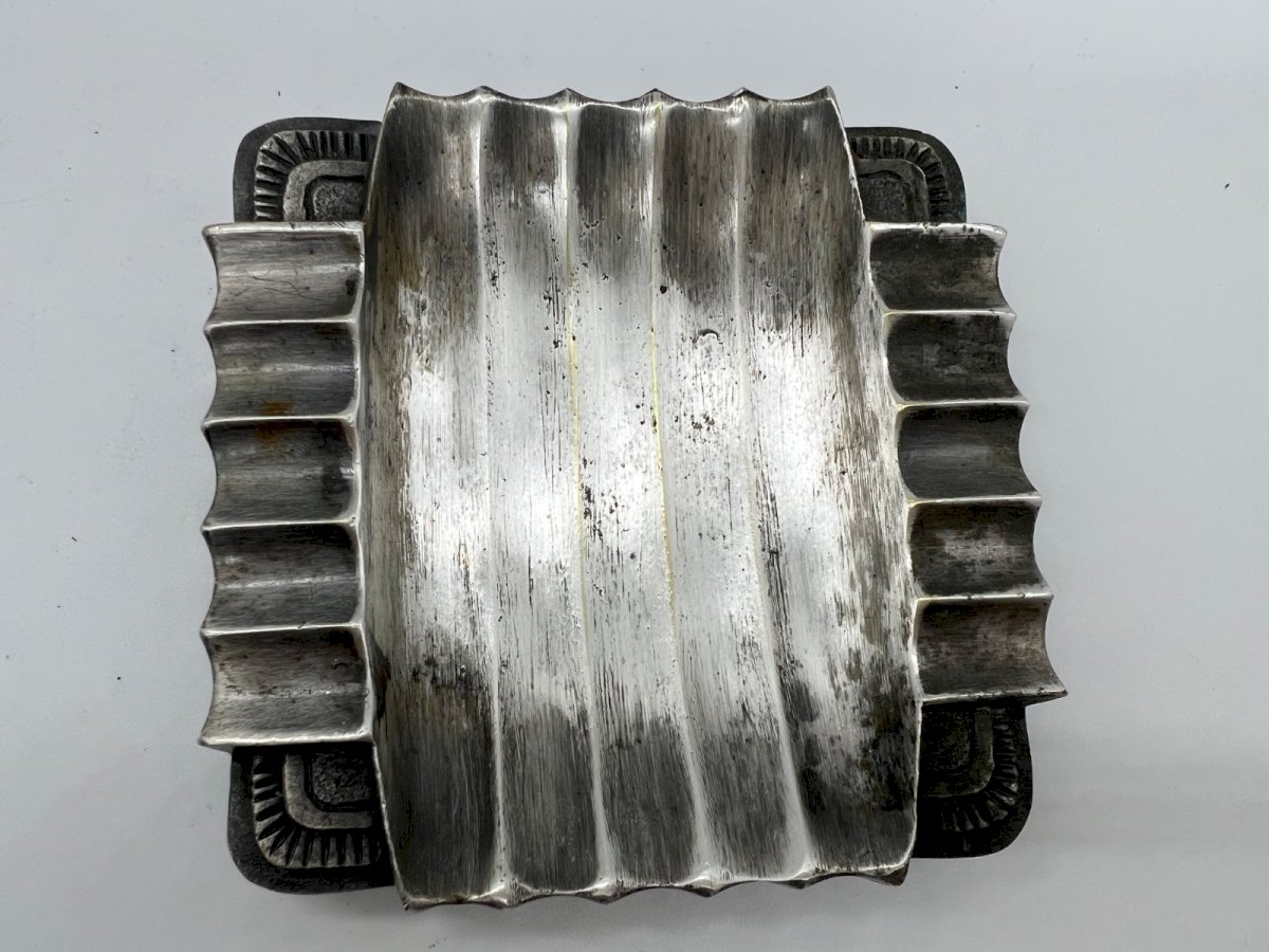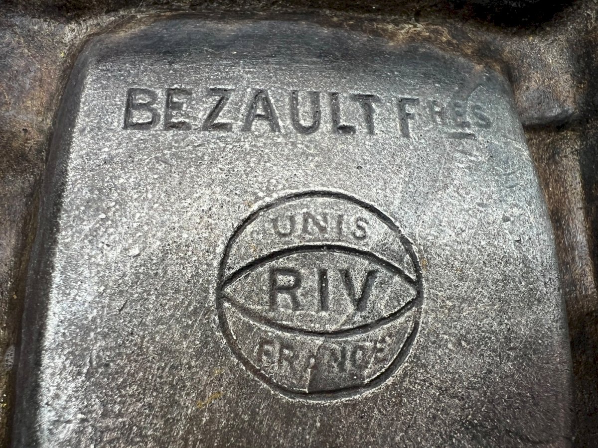 Stunning Art Deco industrial ashtray, signed BEZAULT Frères and marked RIV – Roulements Unis France under the base. Made of silver-plated metal with original patina, it features a ribbed geometric shape typical of the 1930s, combining robustness and mechanical elegance. A beautiful desk or collector's item, a testament to French industrial design of the interwar period. Characteristics: Period: around 1930 Signature: BEZAULT Frères – RIV Roulements Unis France Material: silver-plated metal (cast or silvered zamac) Dimensions: 9.5 cm x 9.5 cm (3.74 in) Height: 7 cm (2.75 in) Style: Industrial Art Deco Condition: good used condition, wear and patina of time, slight signs of oxidation Condition: Used: Item that has been used. Please consult the seller’s description for more details ... Used: Item that has been used. any potential imperfections. Type: Ashtray Country of origin: France Material: Metal Style: Advertising