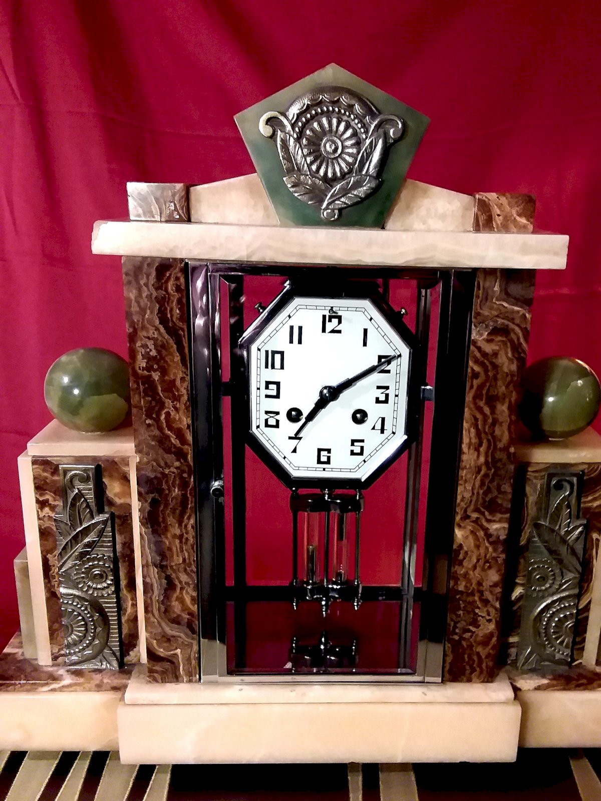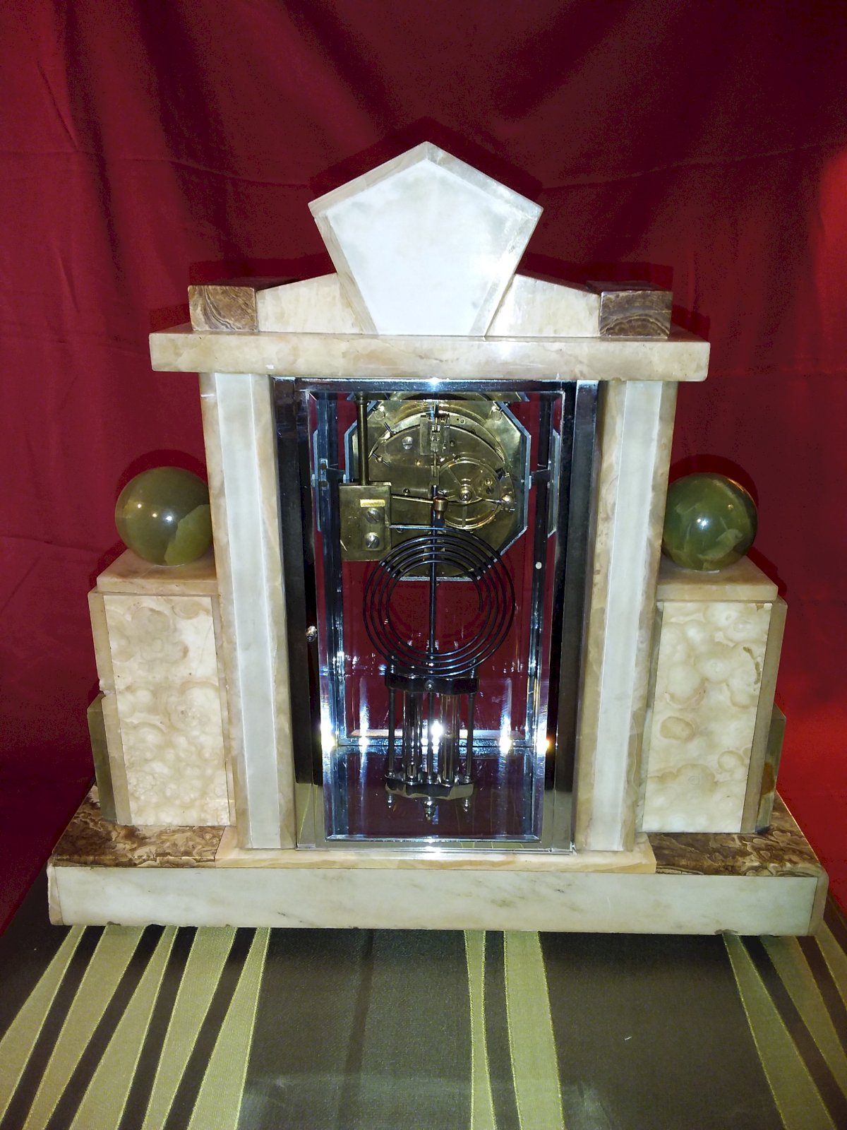 The main Stylized motifs are in very good condition, the base structure in white marble has some chips due to the age of the clock and its weight, 20 kg!