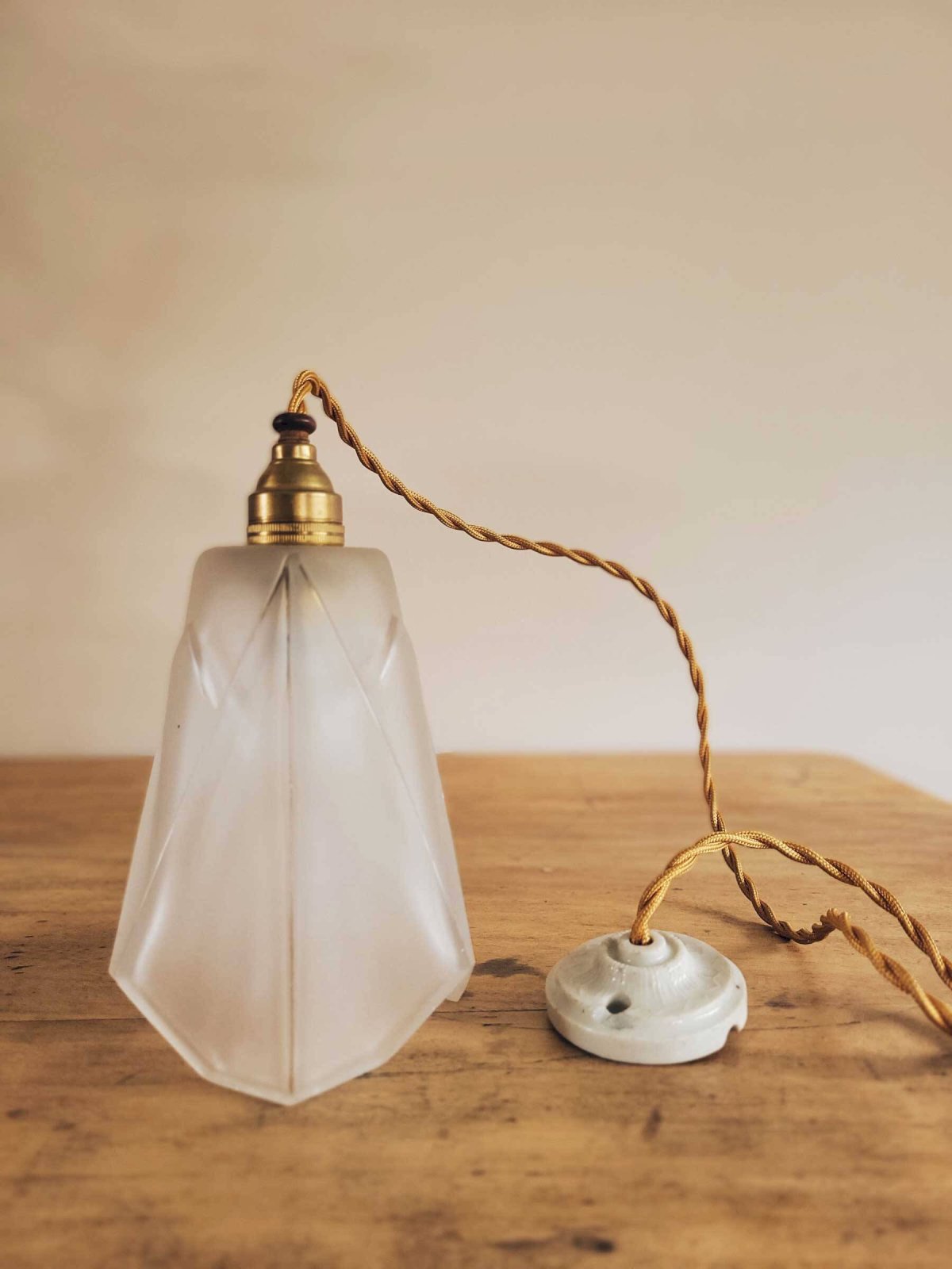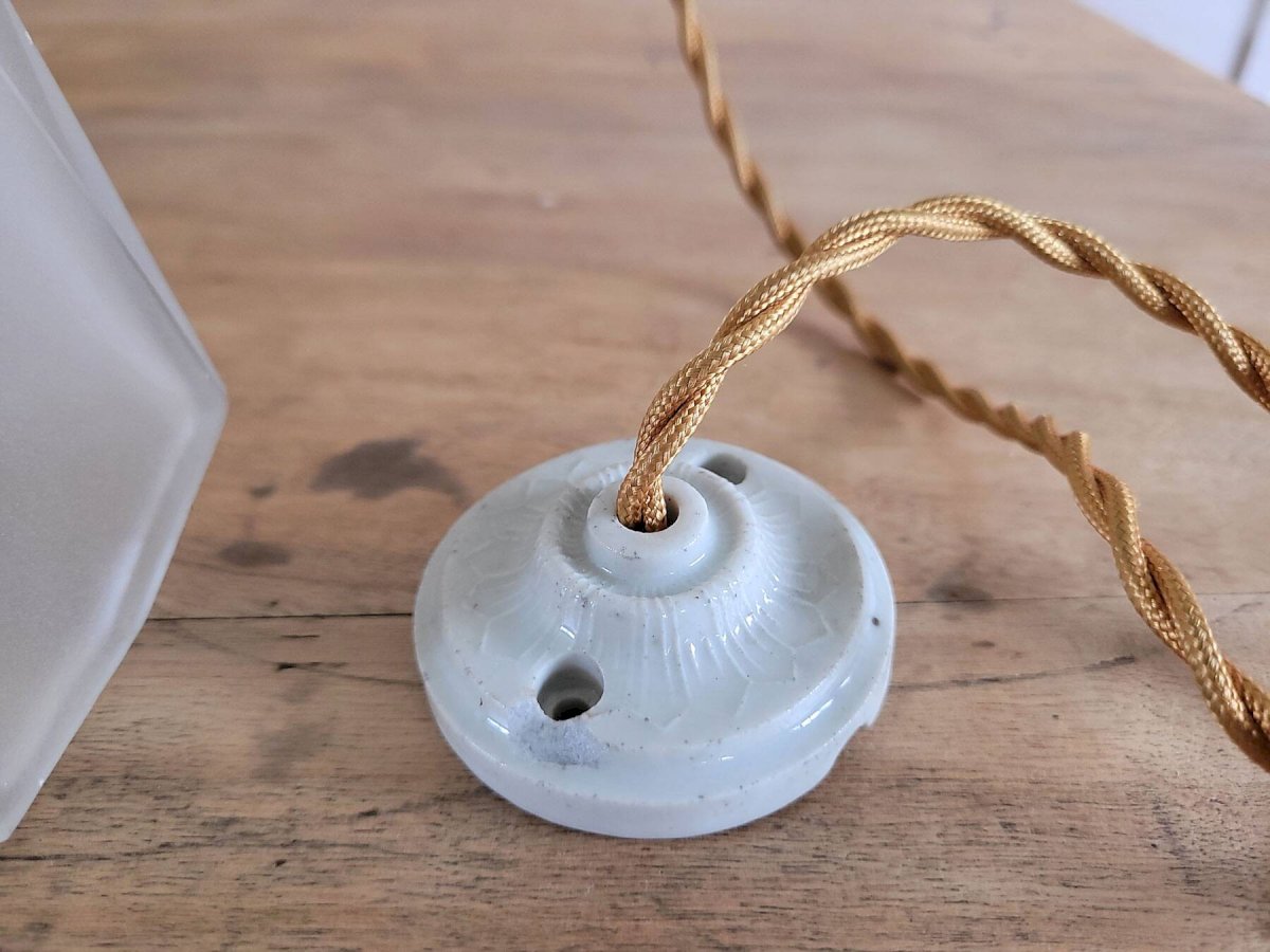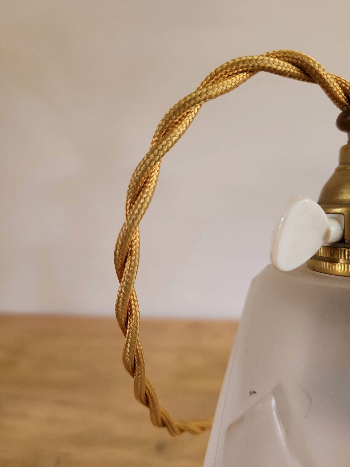 The brass socket adds a touch of elegance, the twisted cable in a mustard-gold brings a vintage feel, and the rosette-shaped white porcelain canopy adds a more classic style. We can imagine it hanging near a bed, in a kitchen, above a piano, or in an entrance to enhance the wall décor... In generally good condition, the lampshade shows some signs of wear (see photos). Dimensions: 13 X 20 X 13 cm (L X H X D) Maximum total height: 95 cm. Shipping possible via Post!. L: 13 W: 13 H: 20