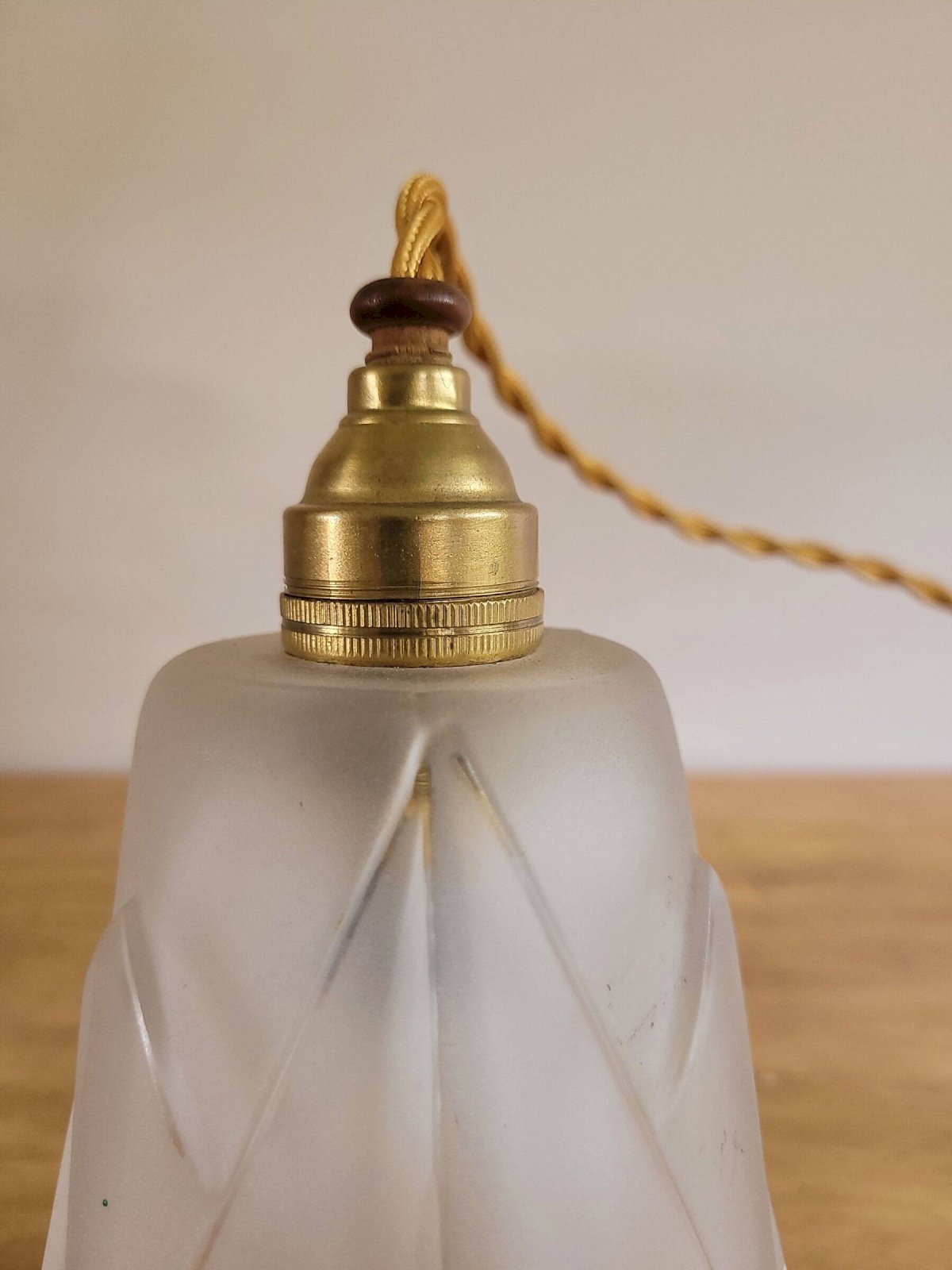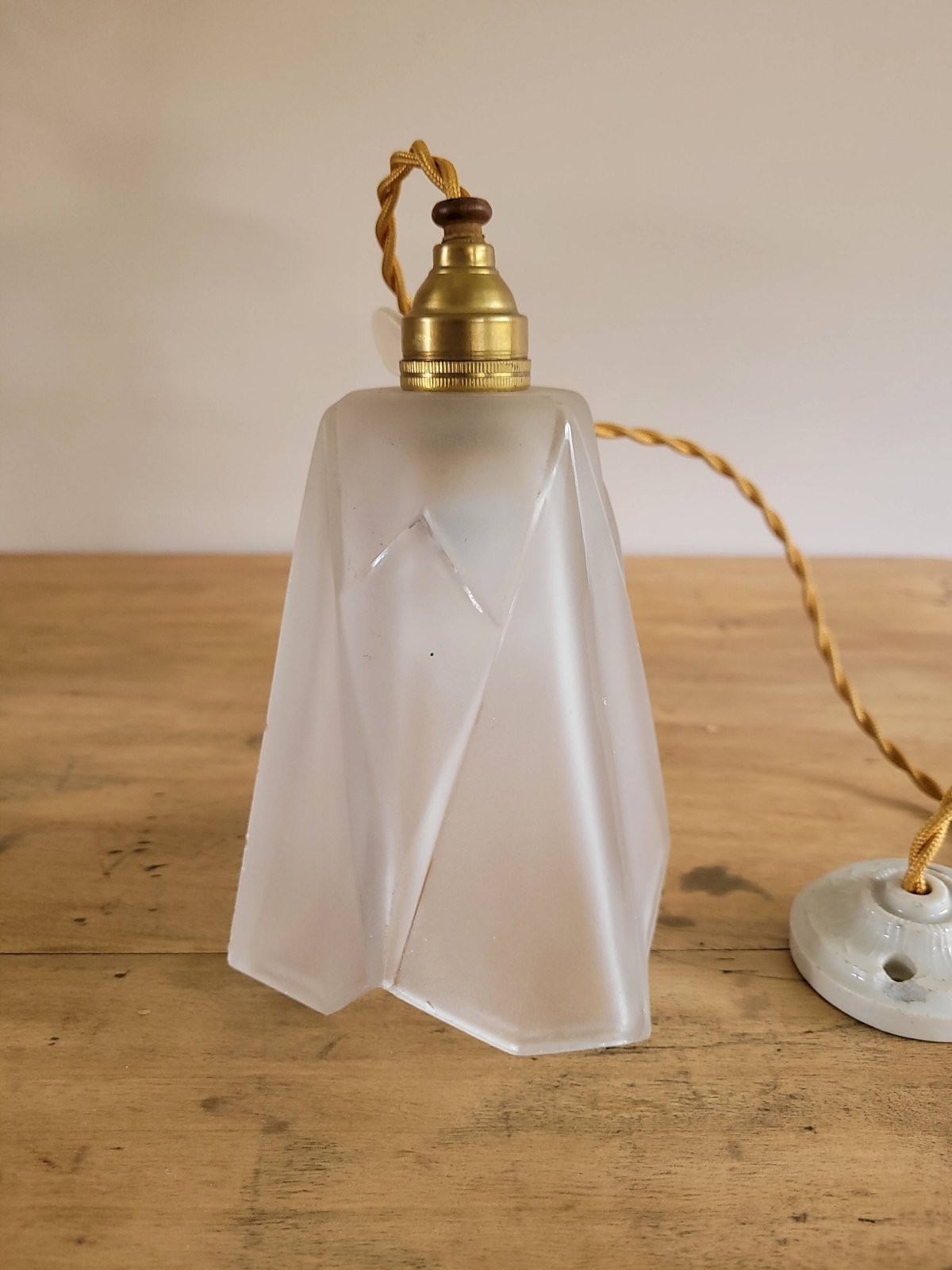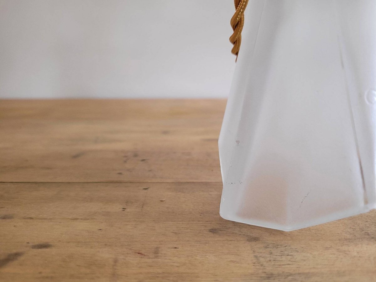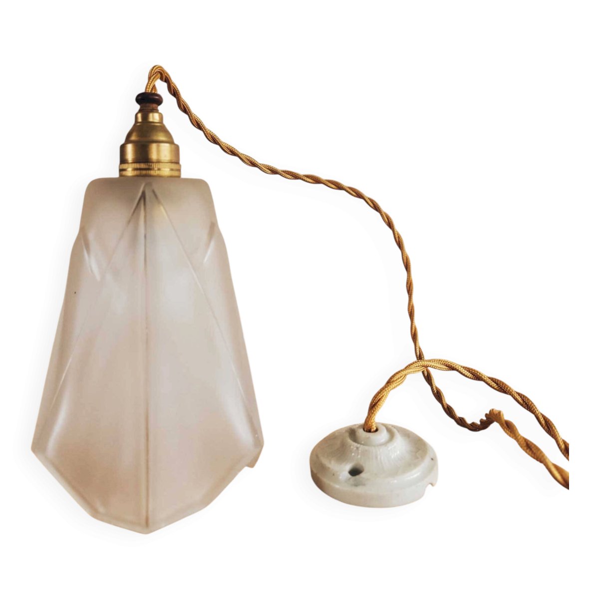 The brass socket adds a touch of elegance, the twisted cable in a mustard-gold brings a vintage feel, and the rosette-shaped white porcelain canopy adds a more classic style. We can imagine it hanging near a bed, in a kitchen, above a piano, or in an entrance to enhance the wall décor... In generally good condition, the lampshade shows some signs of wear (see photos). Dimensions: 13 X 20 X 13 cm (L X H X D) Maximum total height: 95 cm. Shipping possible via Post!. L: 13 W: 13 H: 20