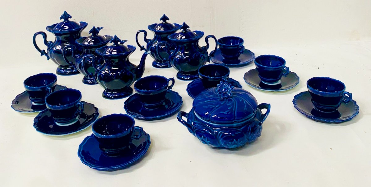 Polychrome ceramic tea and coffee service with a blue background, 14 pieces. Six shaped pieces, eight cups and saucers. Good condition, 20th century. Type: Tableware, Kitchen. Period: Art Deco. Origin: France. Subtype: tea and coffee service. Material: Ceramic.
